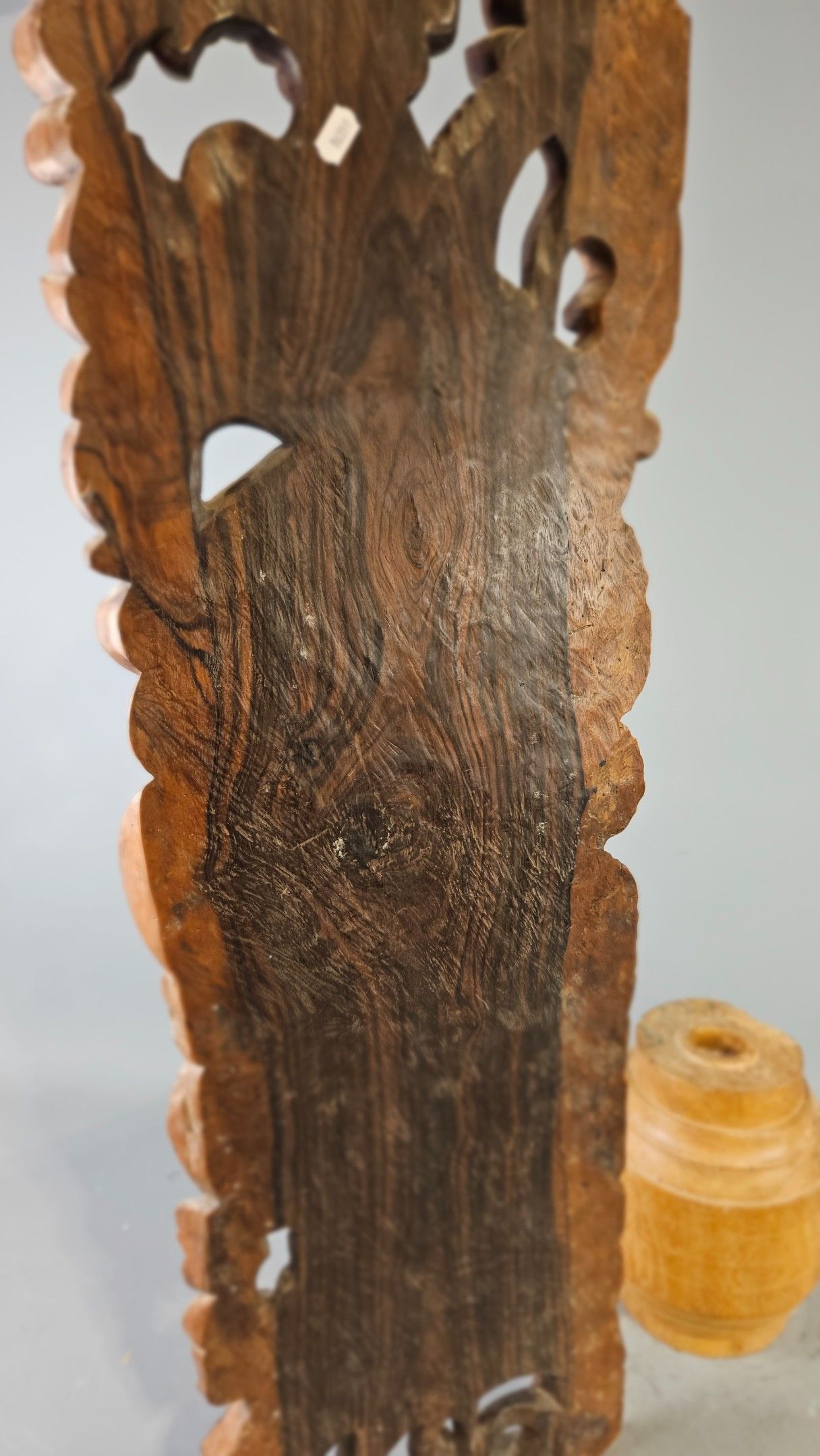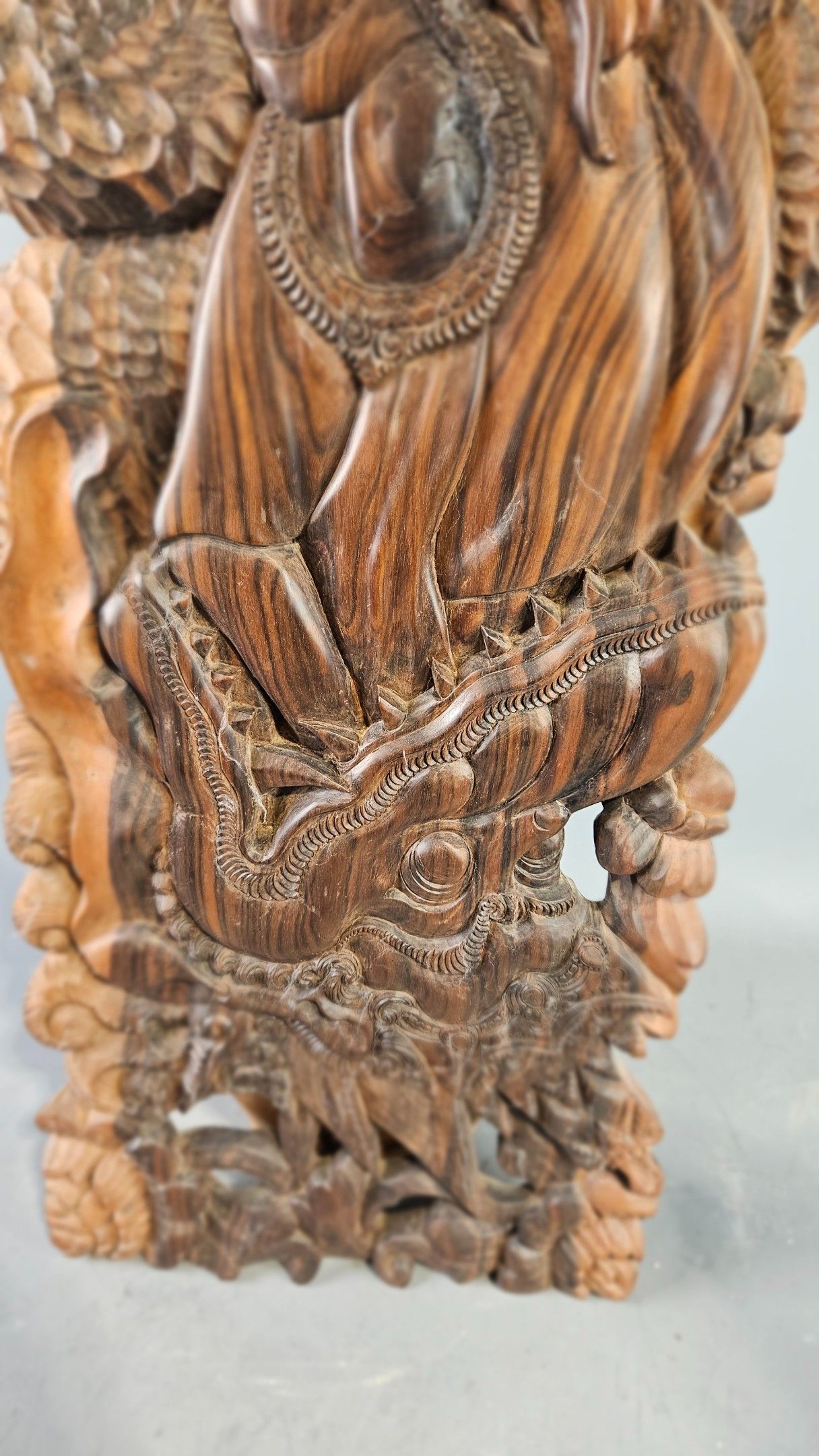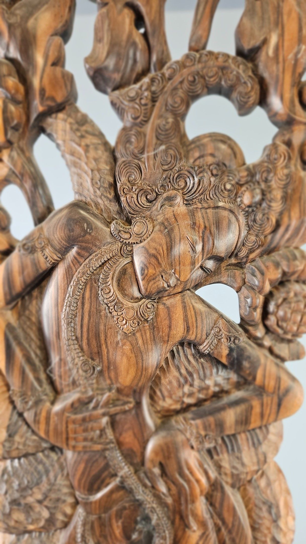 Grand panneau en bois sculpté de Bali figurant une danseuse déhanchée bientôt dévorée par un monstre. Hauteur : 102 cm