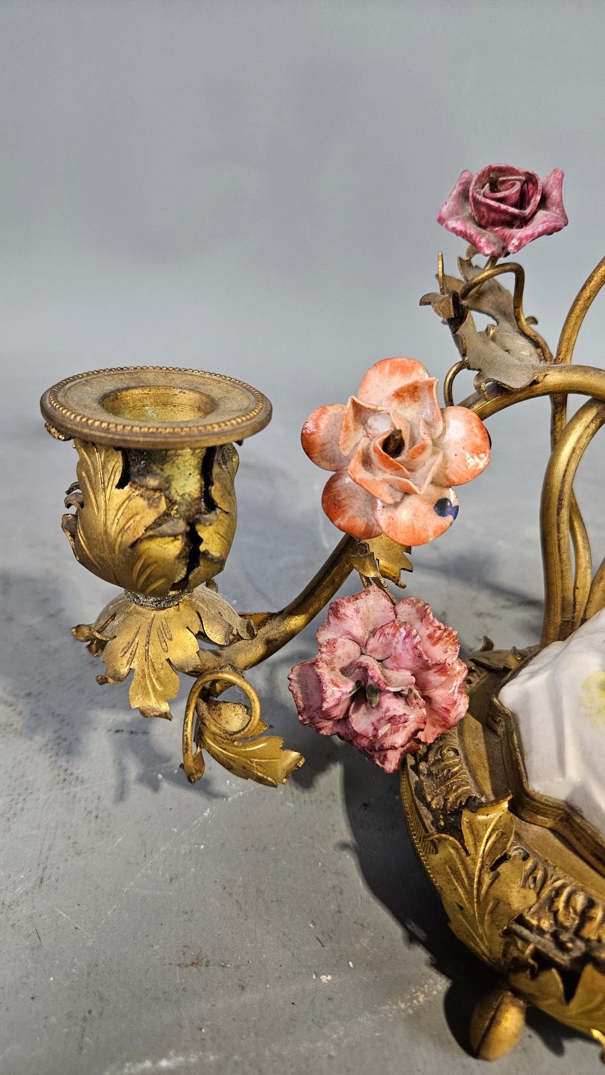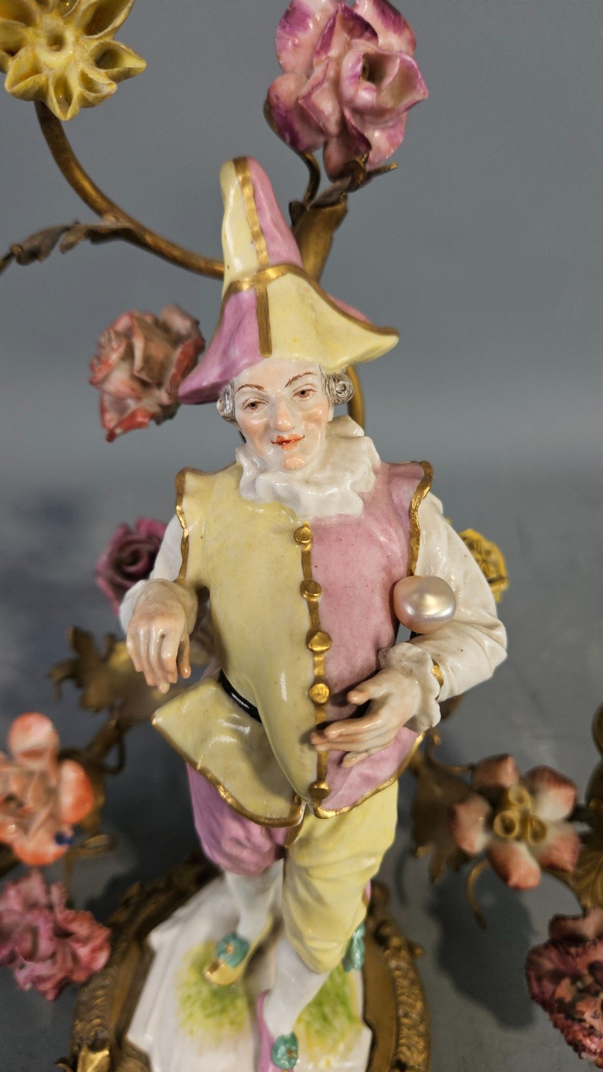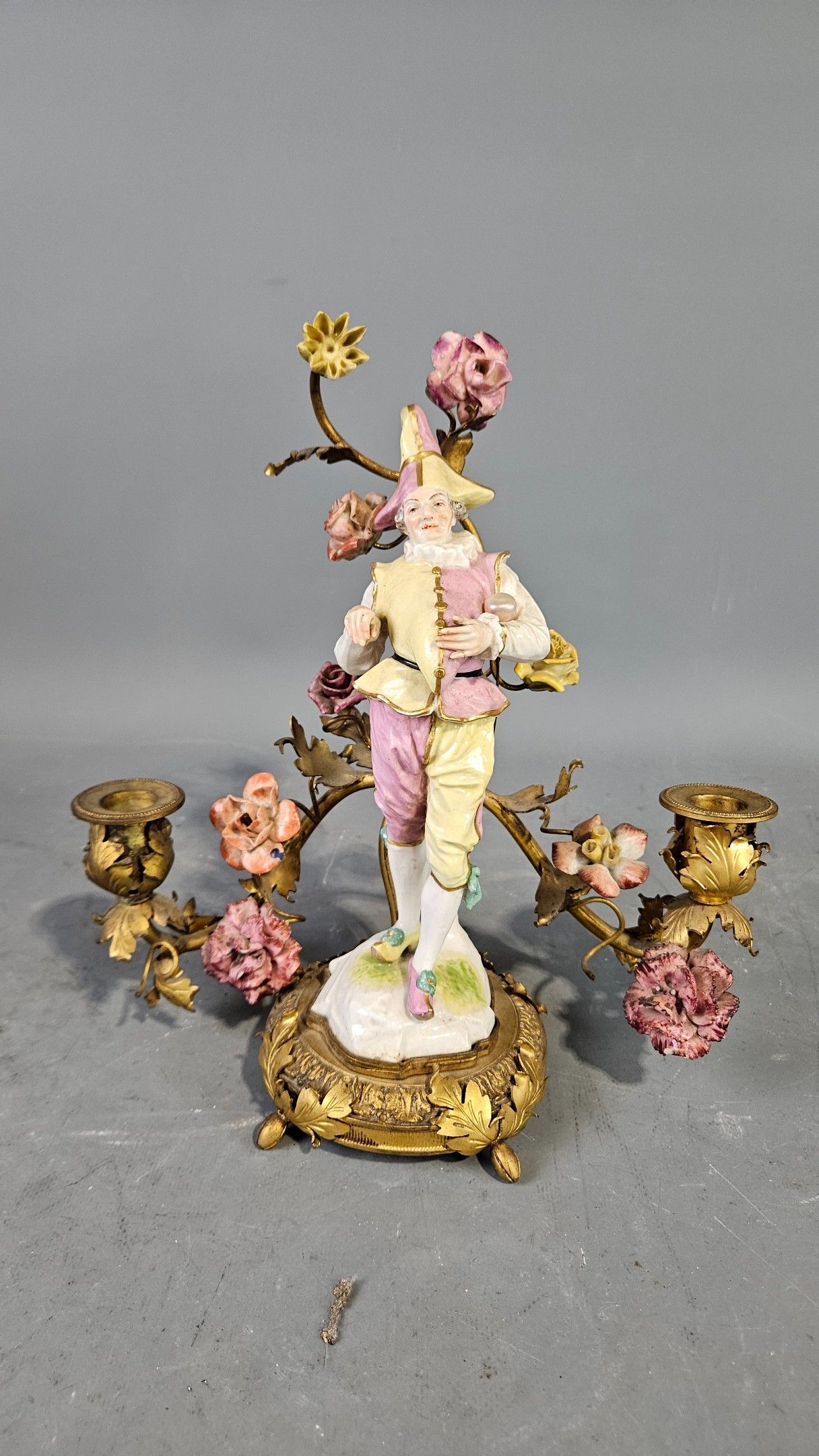 Elégant petit candélabre de style Louis XV en bronze doré et porcelaine polychrome de la fin du XIXème décoré en son centre d’une statuette d’arlequin d’où émerge deux branches fleuries formant bobèche. Hauteur : 28 cm