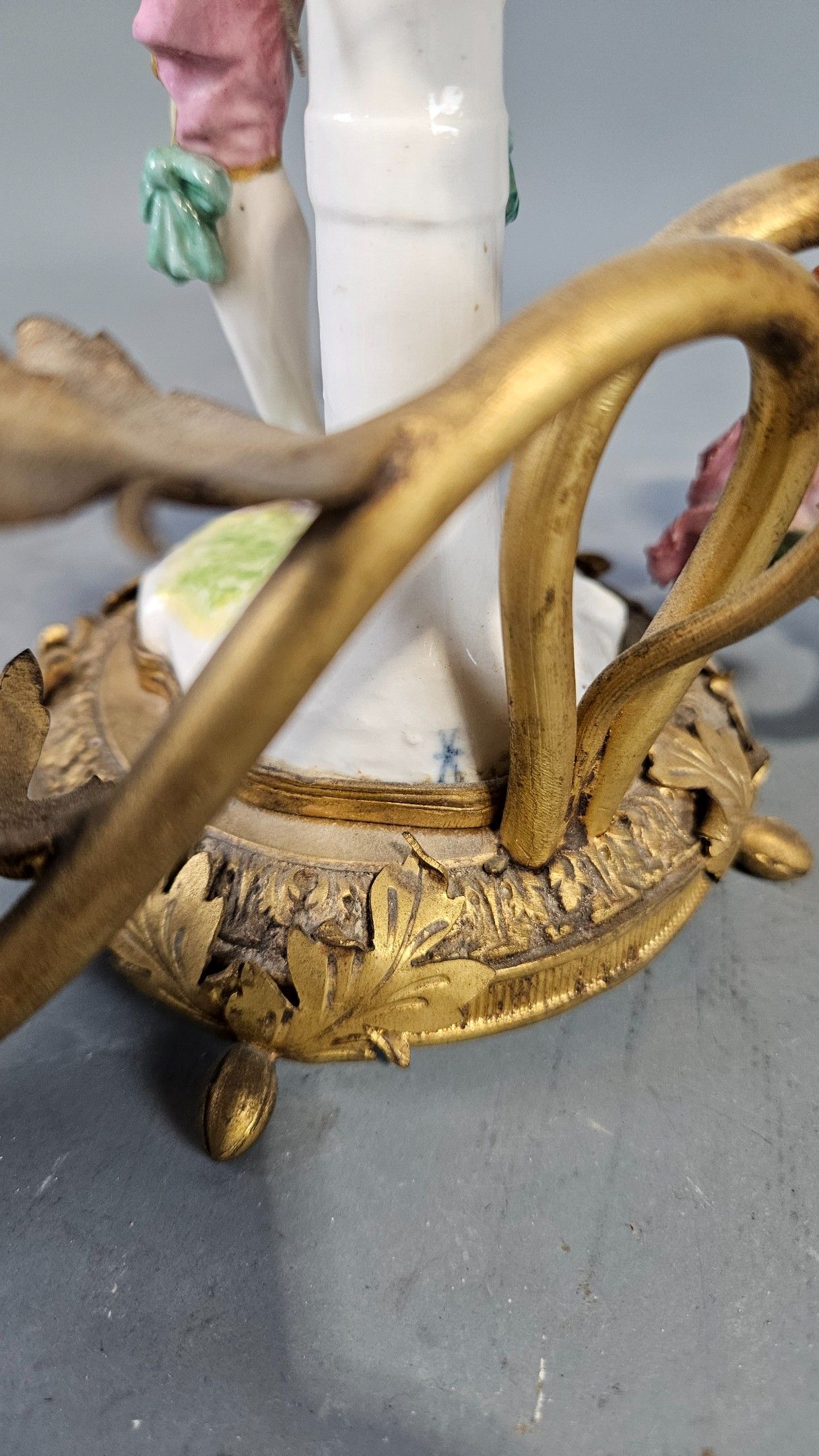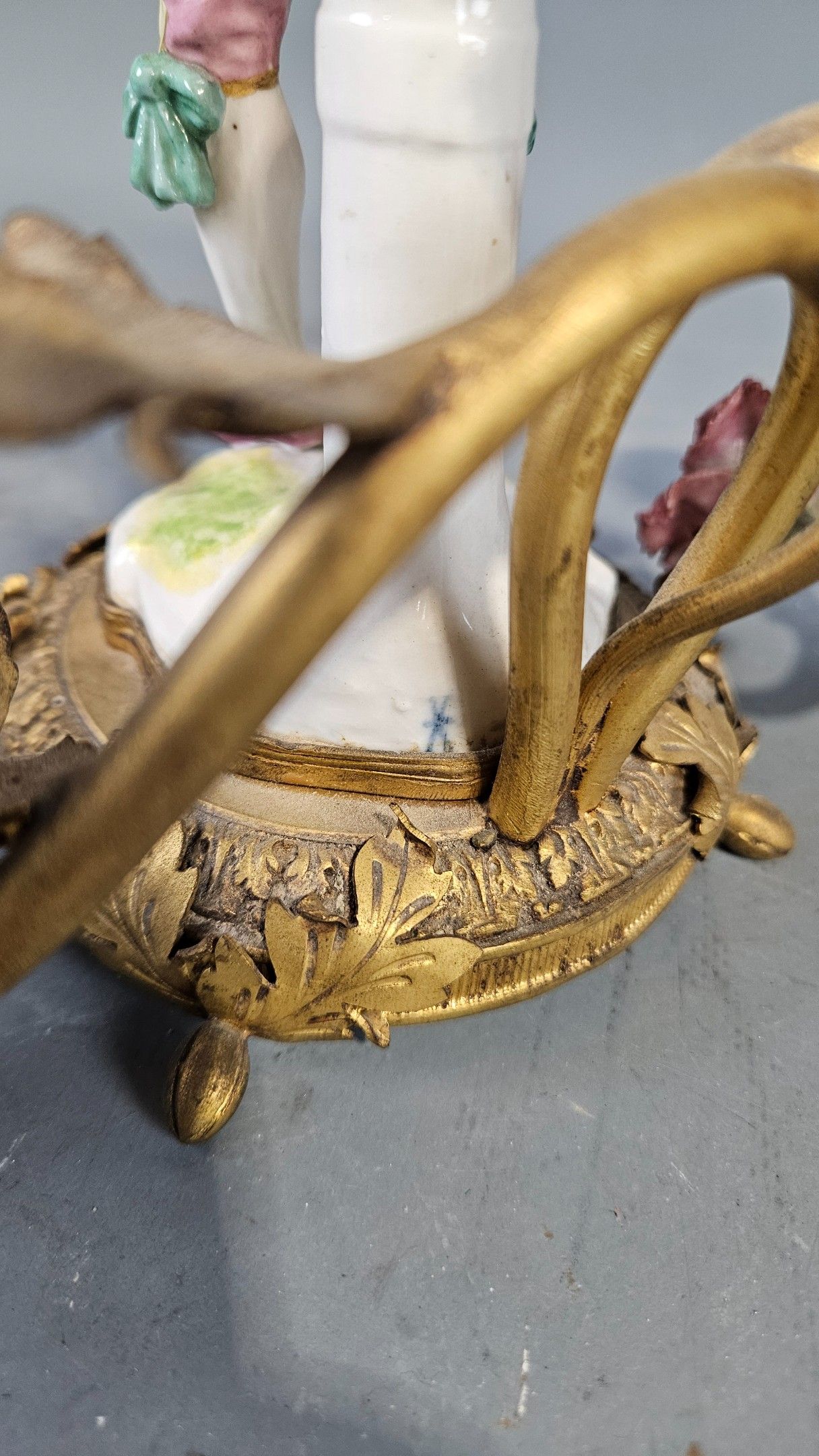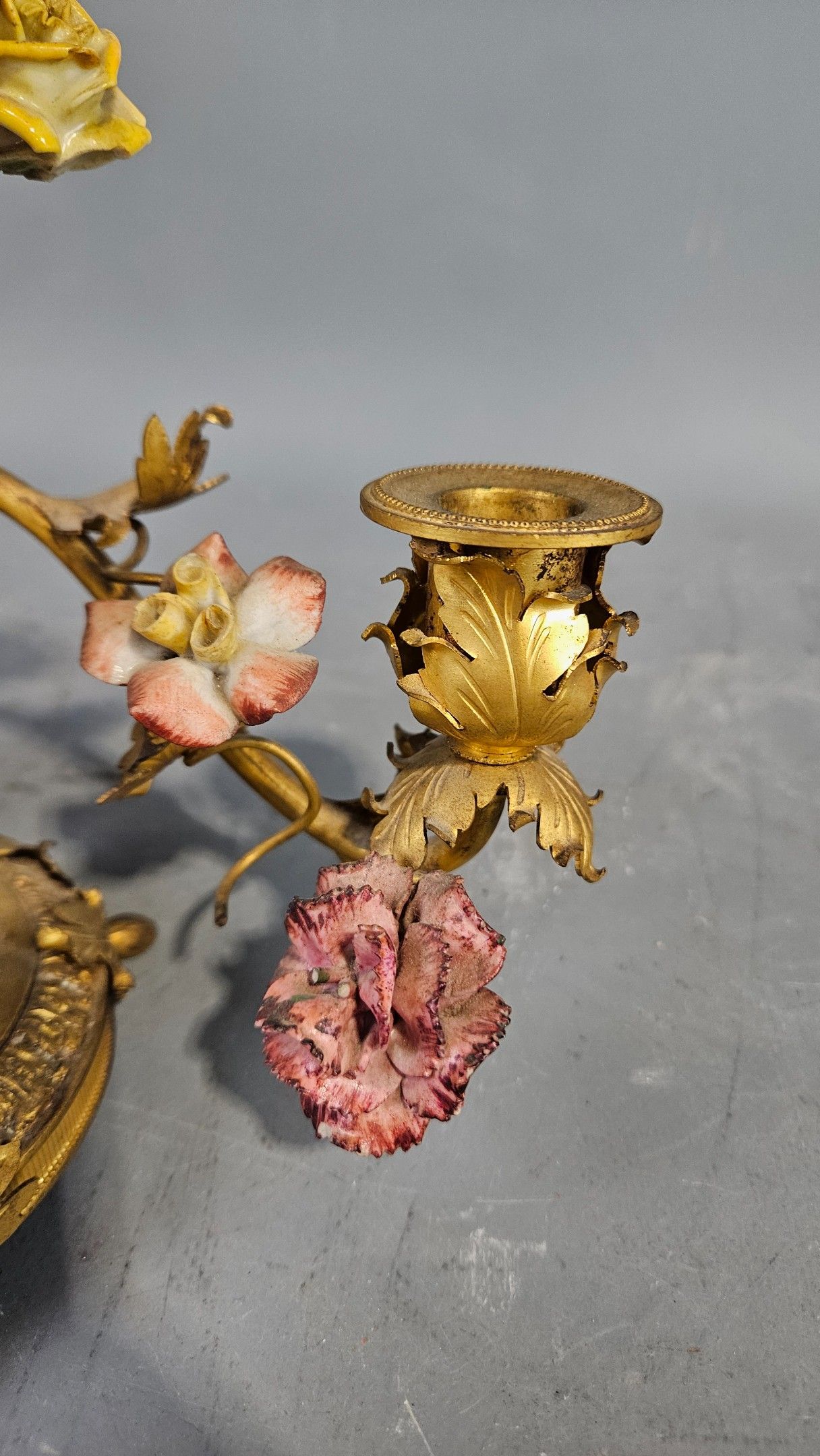 Elégant petit candélabre de style Louis XV en bronze doré et porcelaine polychrome de la fin du XIXème décoré en son centre d’une statuette d’arlequin d’où émerge deux branches fleuries formant bobèche. Hauteur : 28 cm