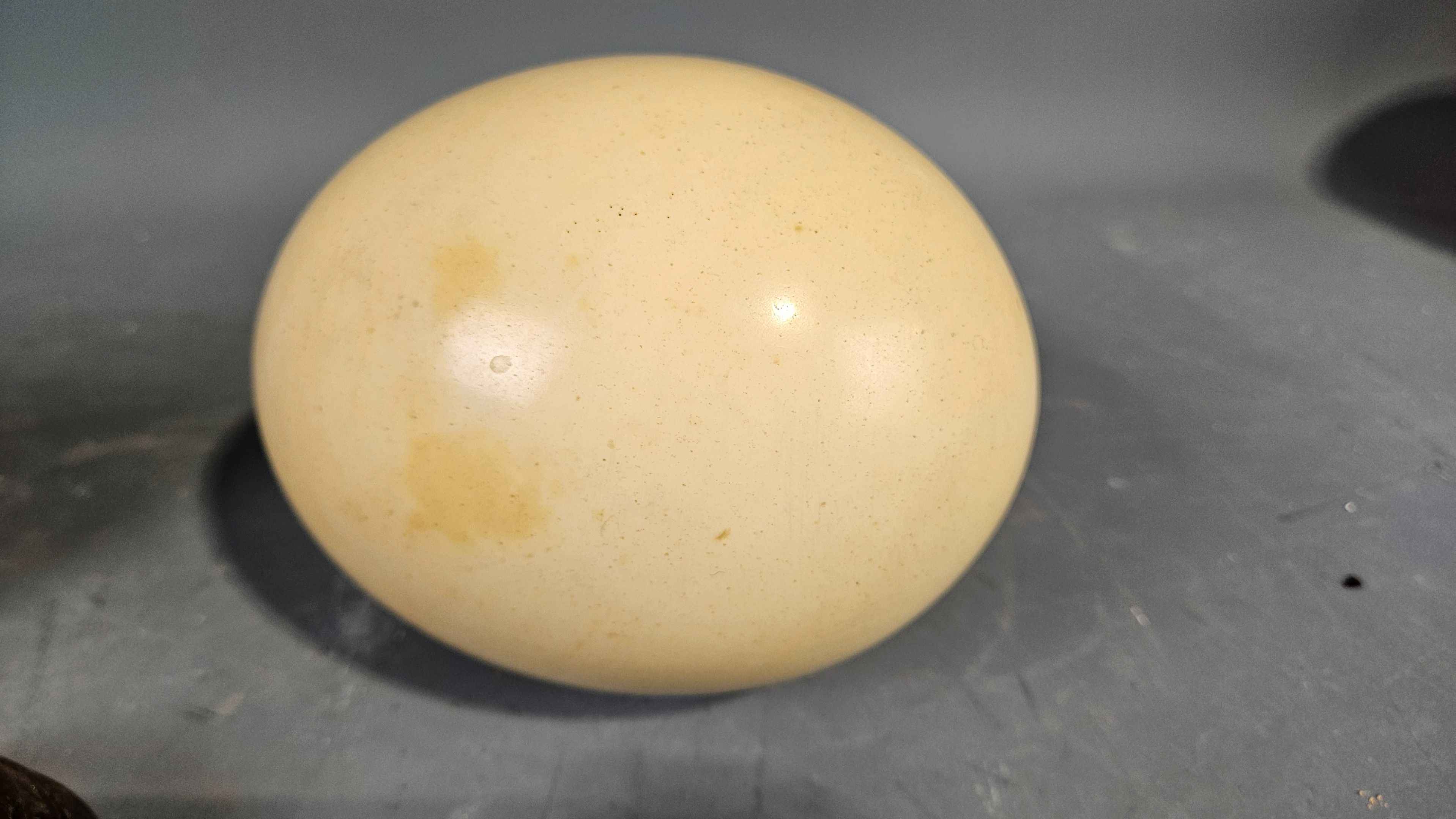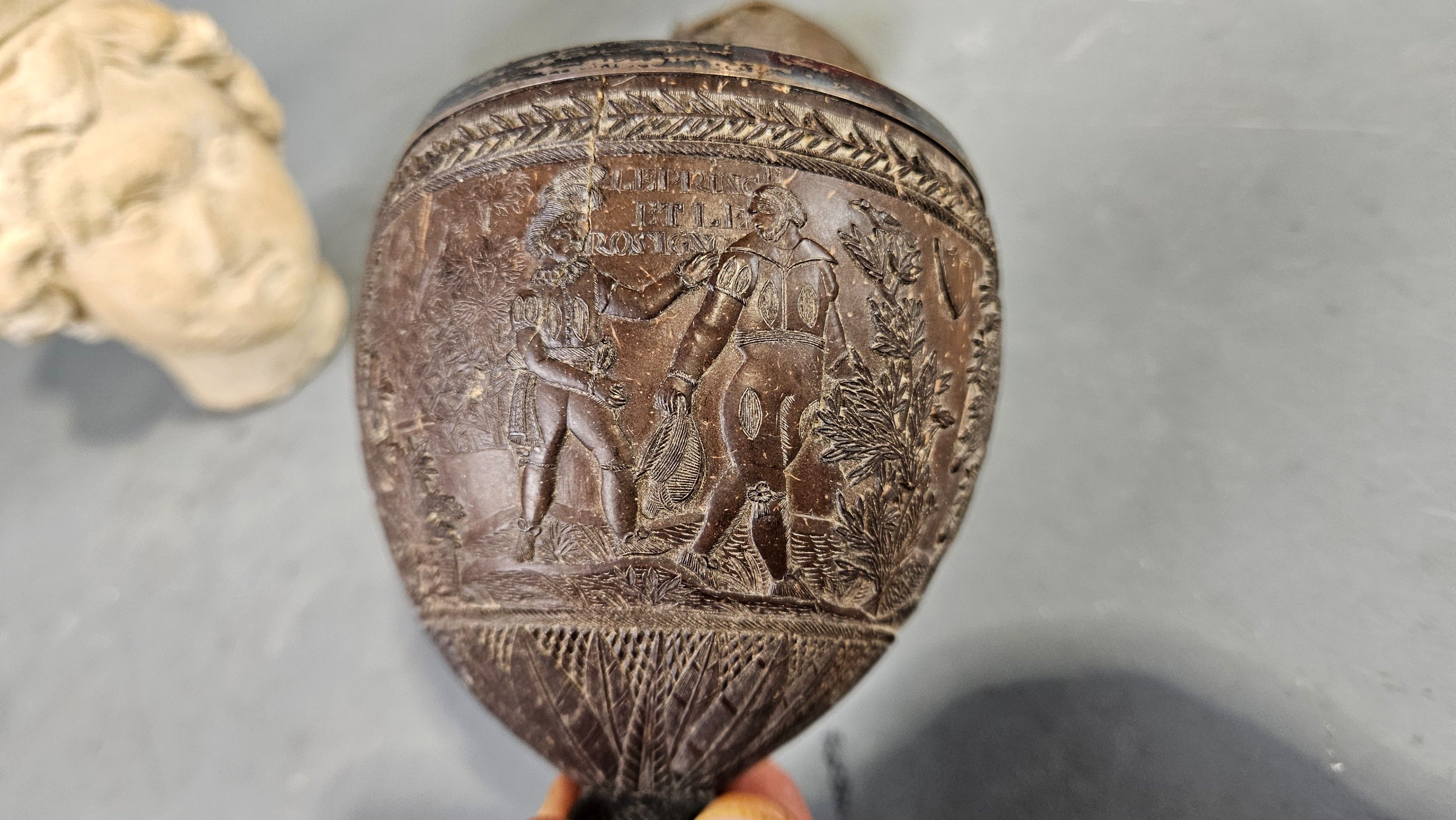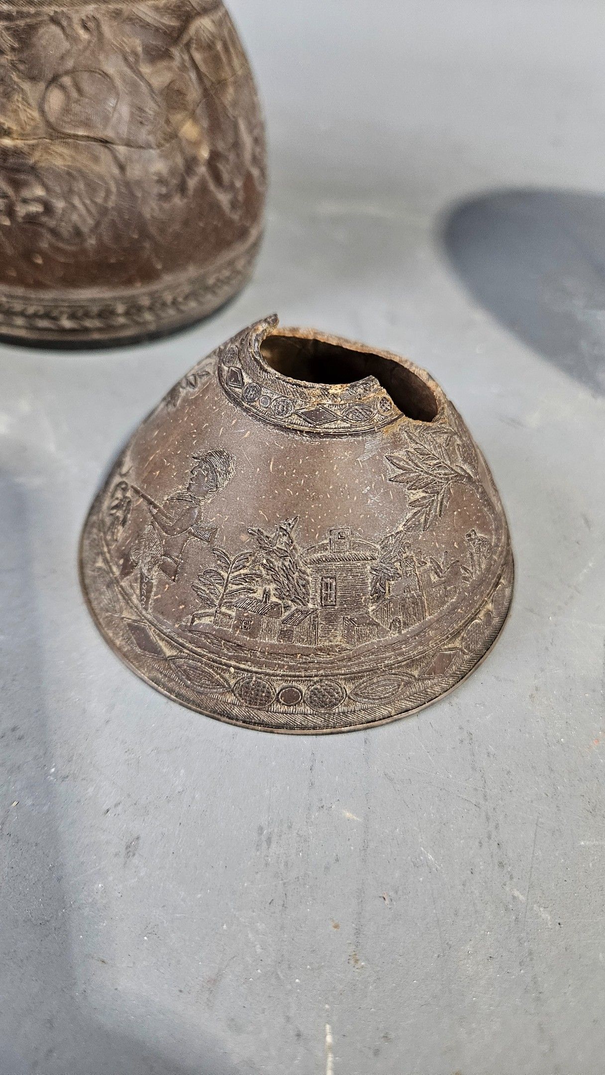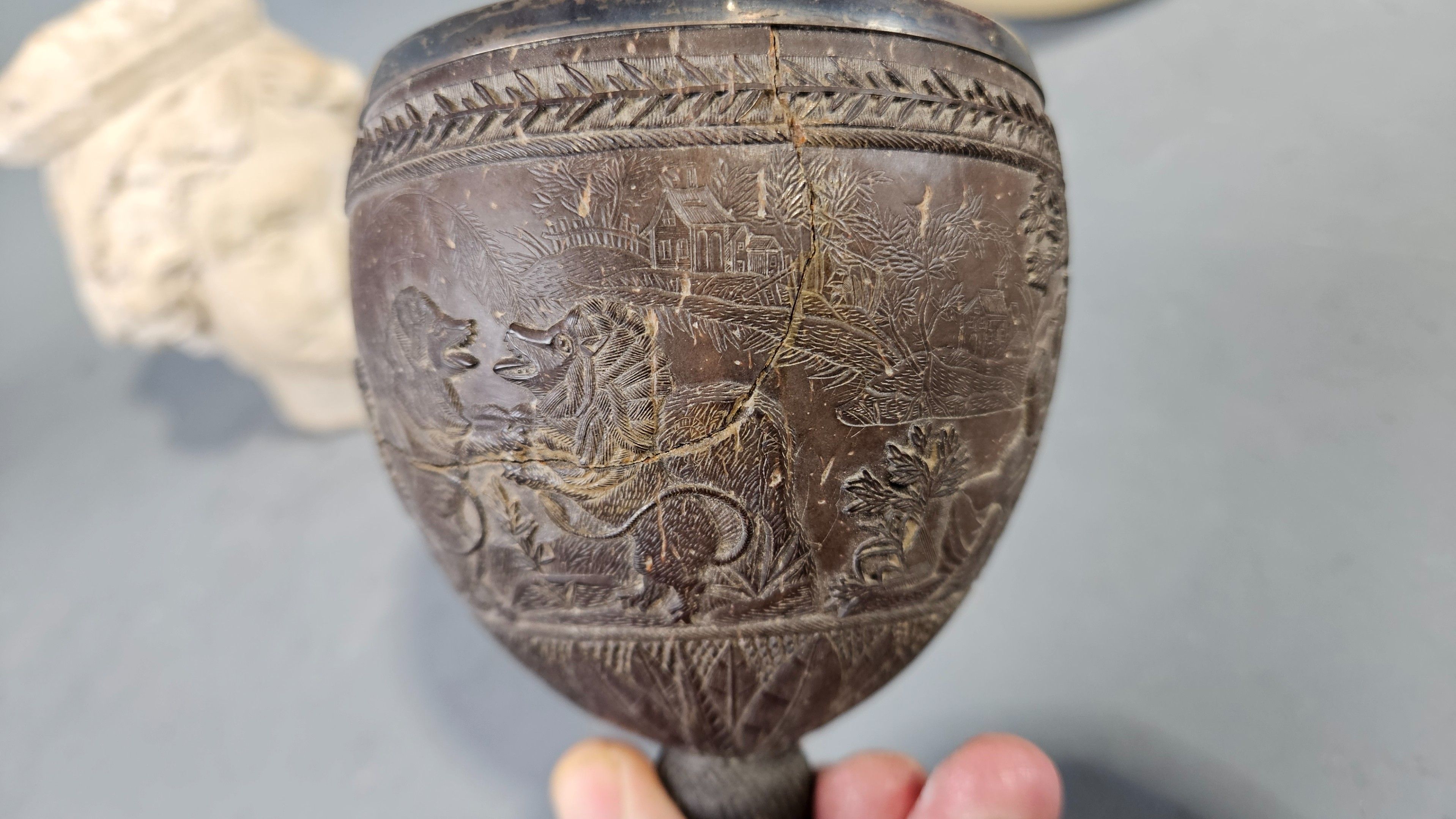 Demi noix finement gravée d’époque XIXème à monture argent supposée (fêlée). On y joint un module assorti malheureusement accidenté et un œuf d’autruche et un petit buste en pierre calcaire dans le goût médiéval