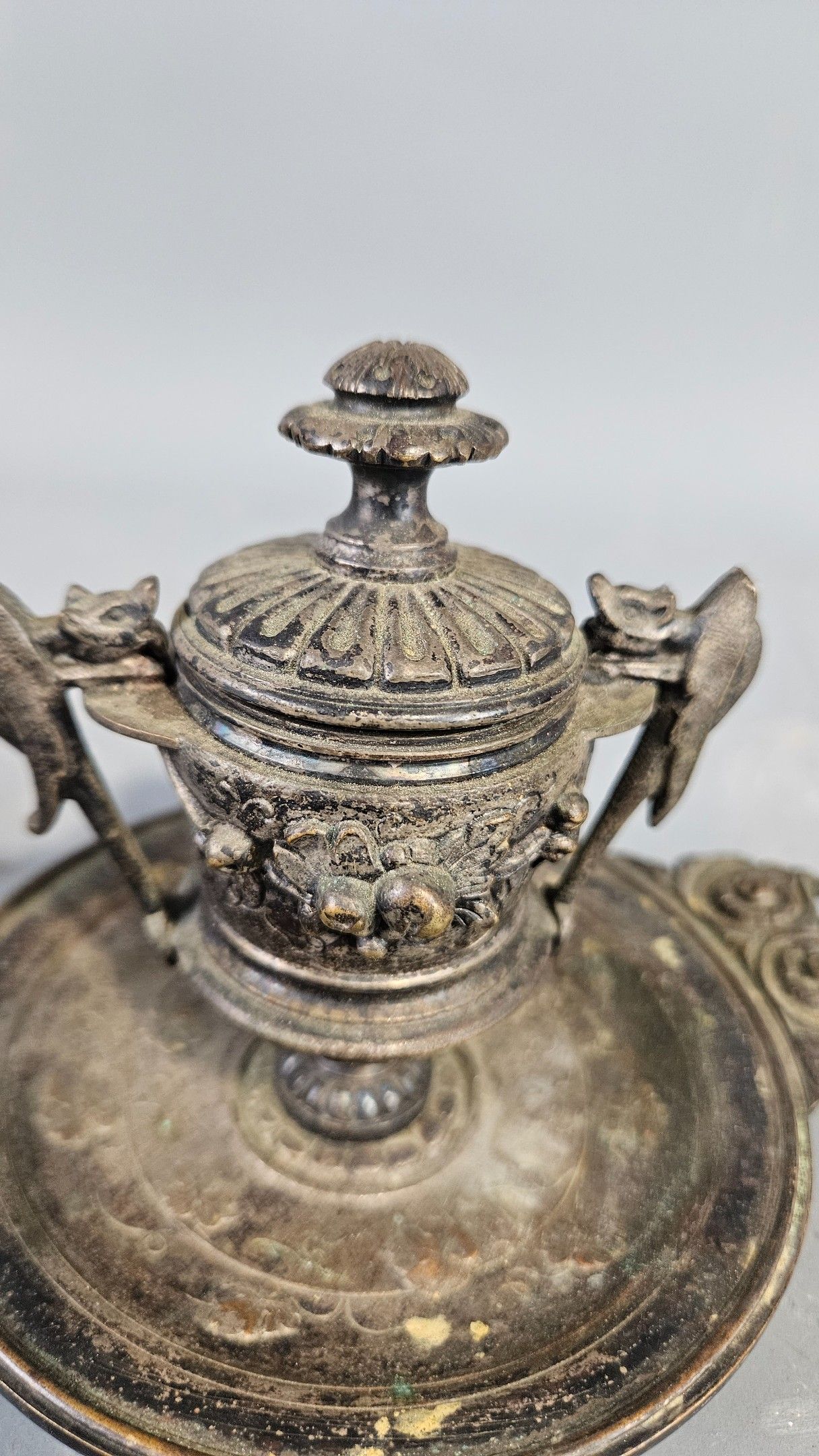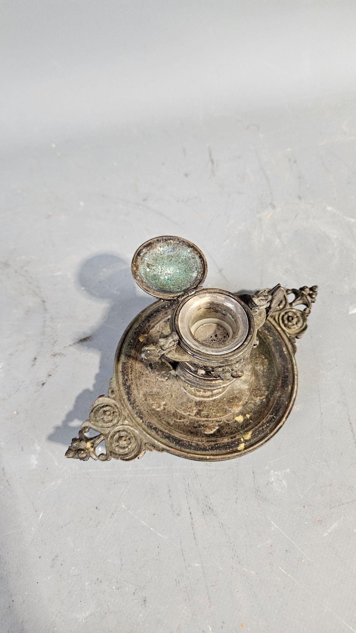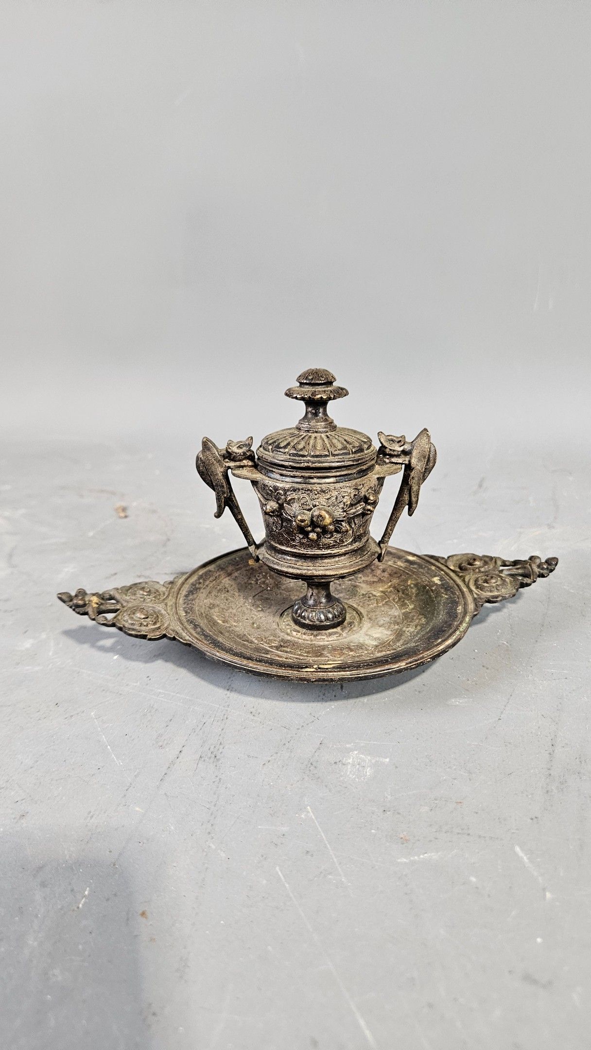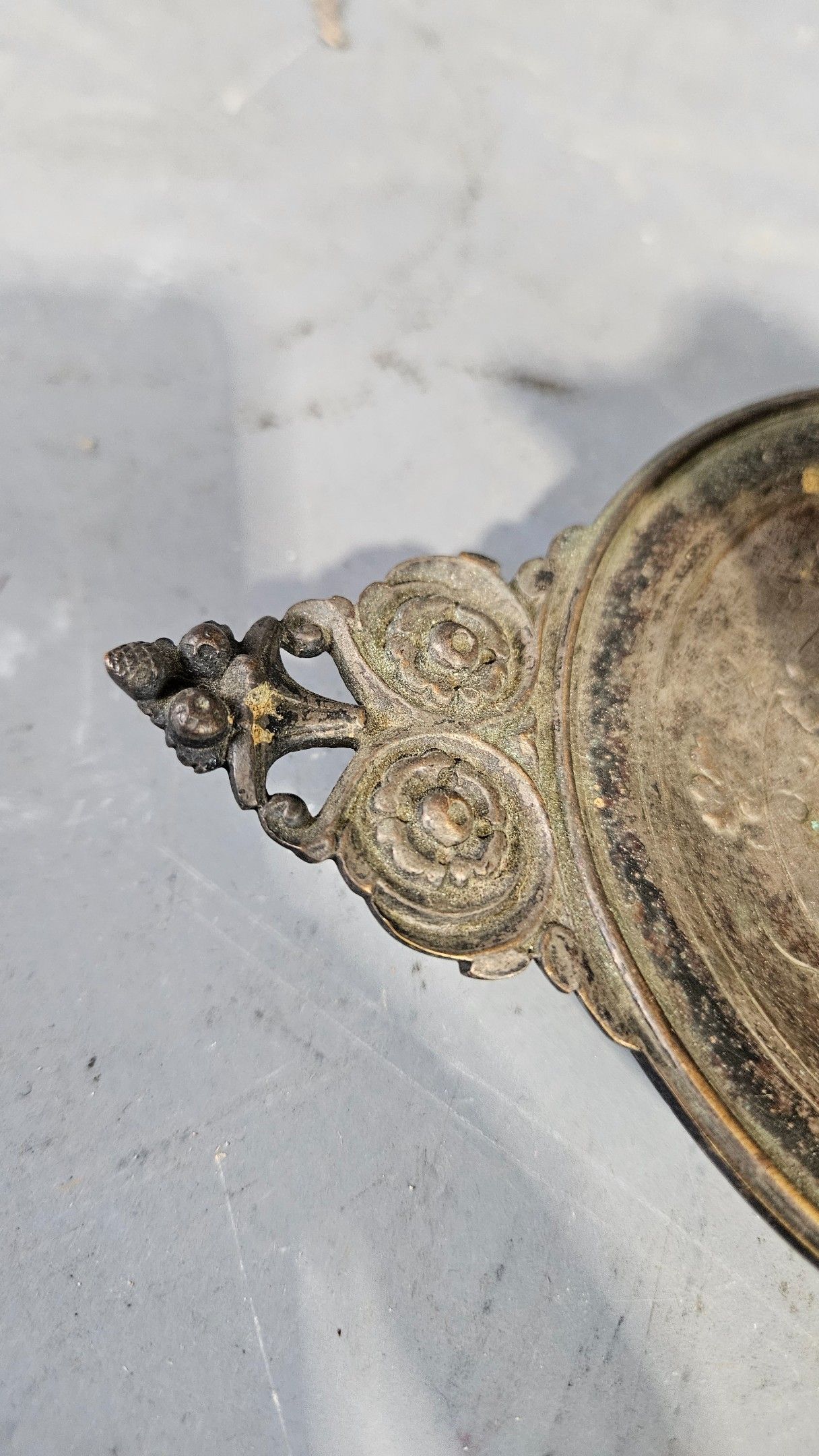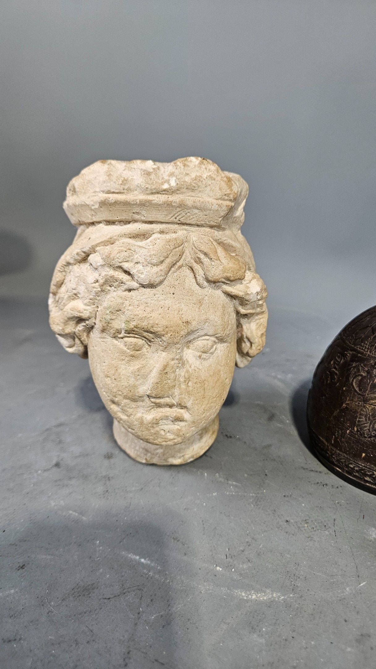 Demi noix finement gravée d’époque XIXème à monture argent supposée (fêlée). On y joint un module assorti malheureusement accidenté et un œuf d’autruche et un petit buste en pierre calcaire dans le goût médiéval