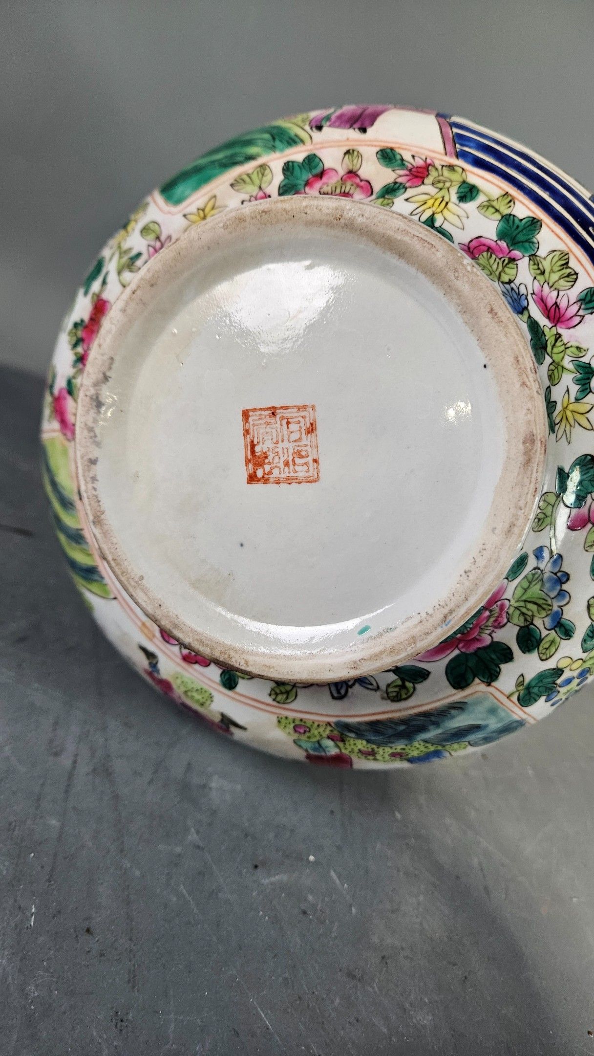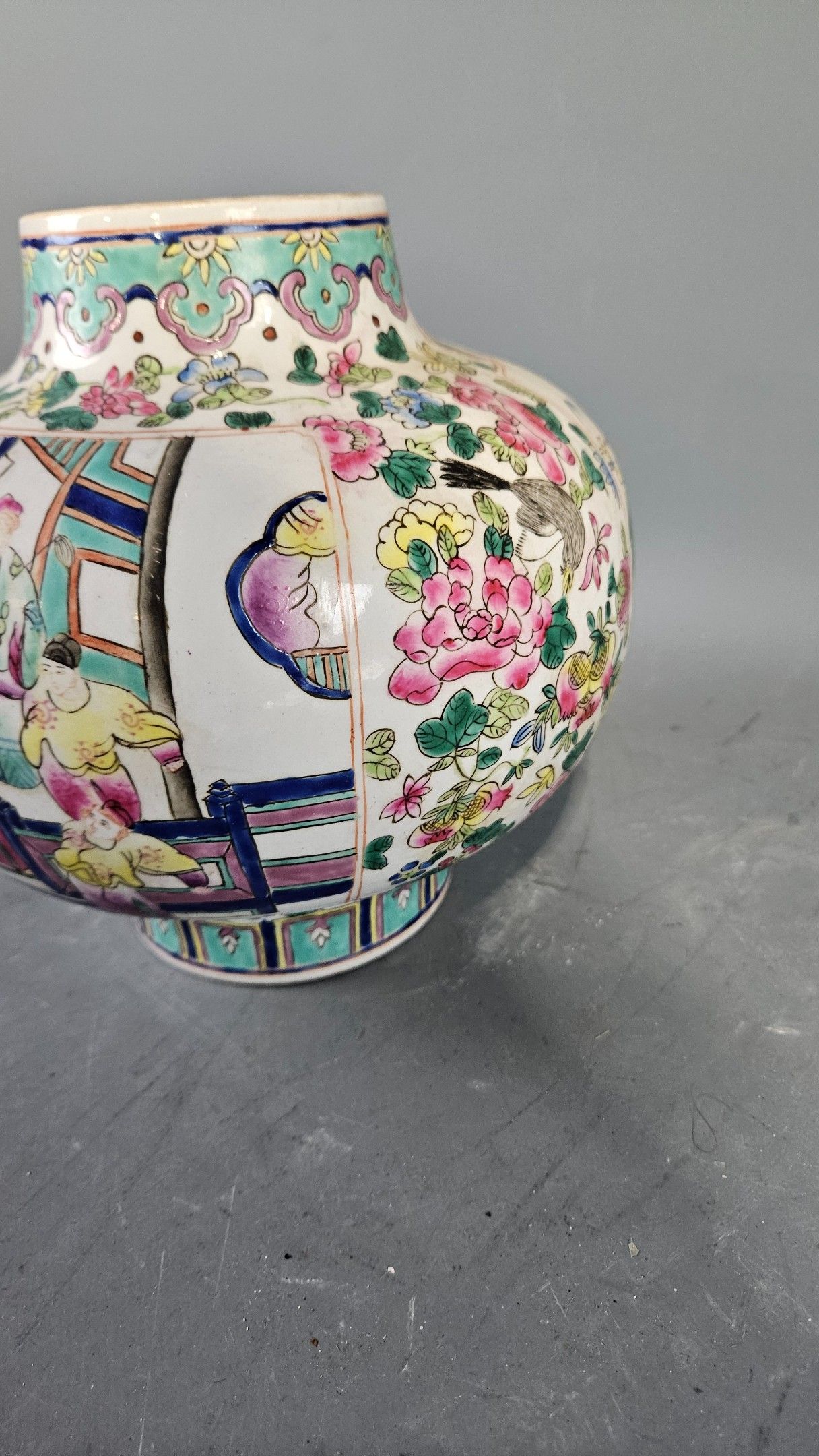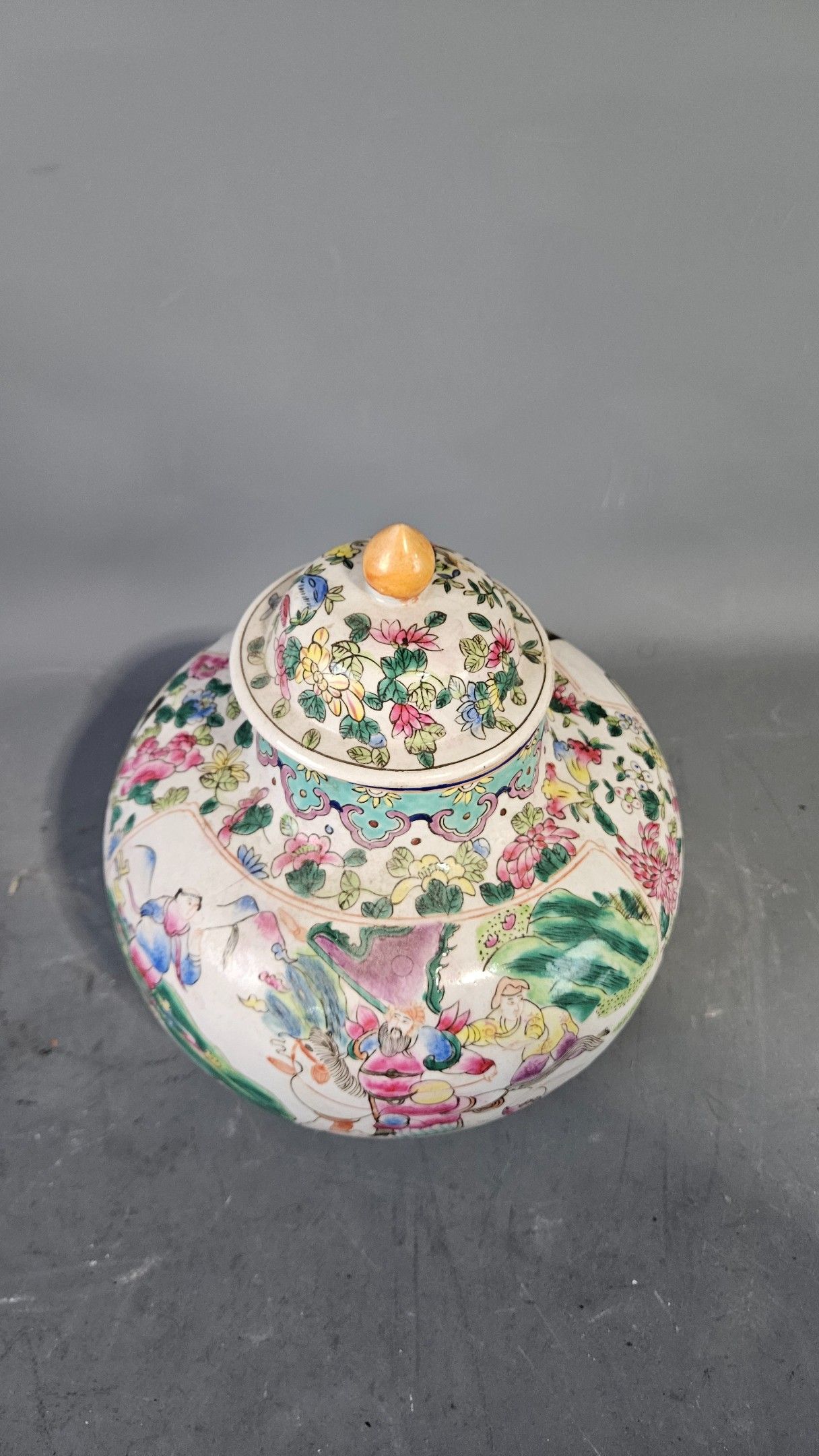 Petite potiche couverte fortement pansue en porcelaine de Chine à décor Famille Rose. Travail première moitié XXème. Hauteur : 29 cm