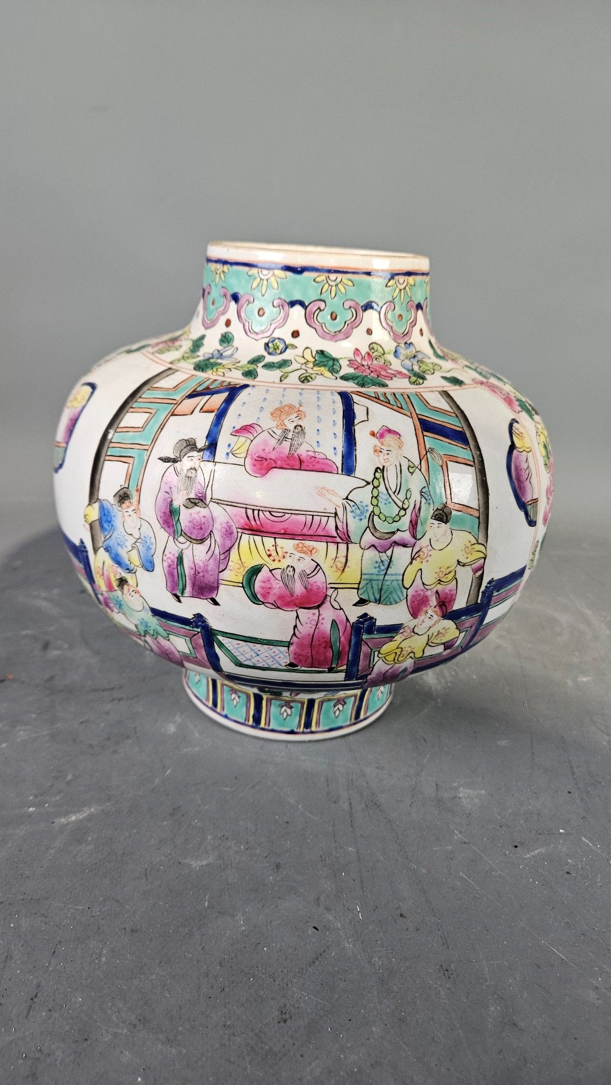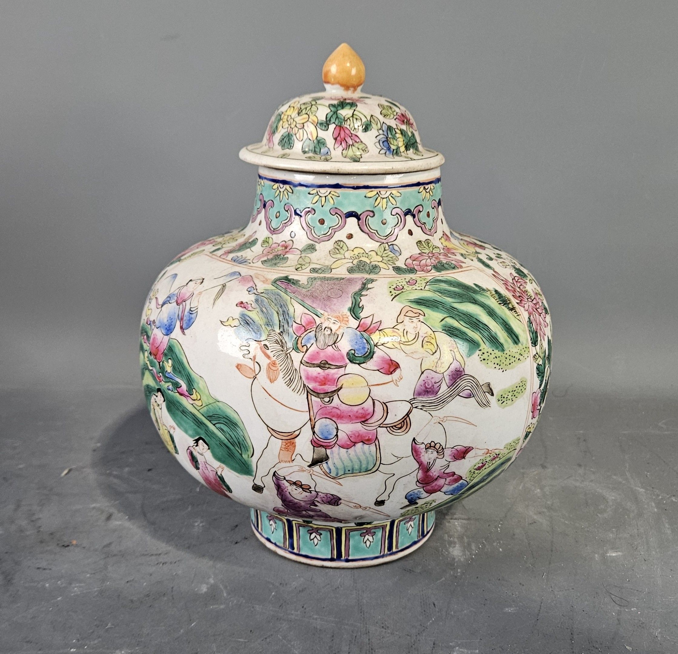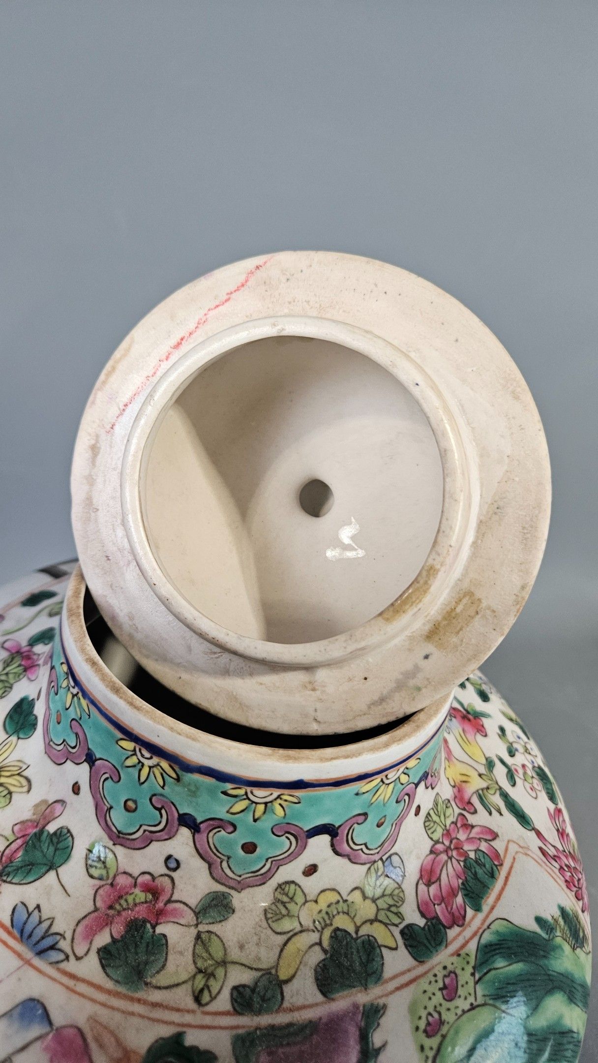 Petite potiche couverte fortement pansue en porcelaine de Chine à décor Famille Rose. Travail première moitié XXème. Hauteur : 29 cm