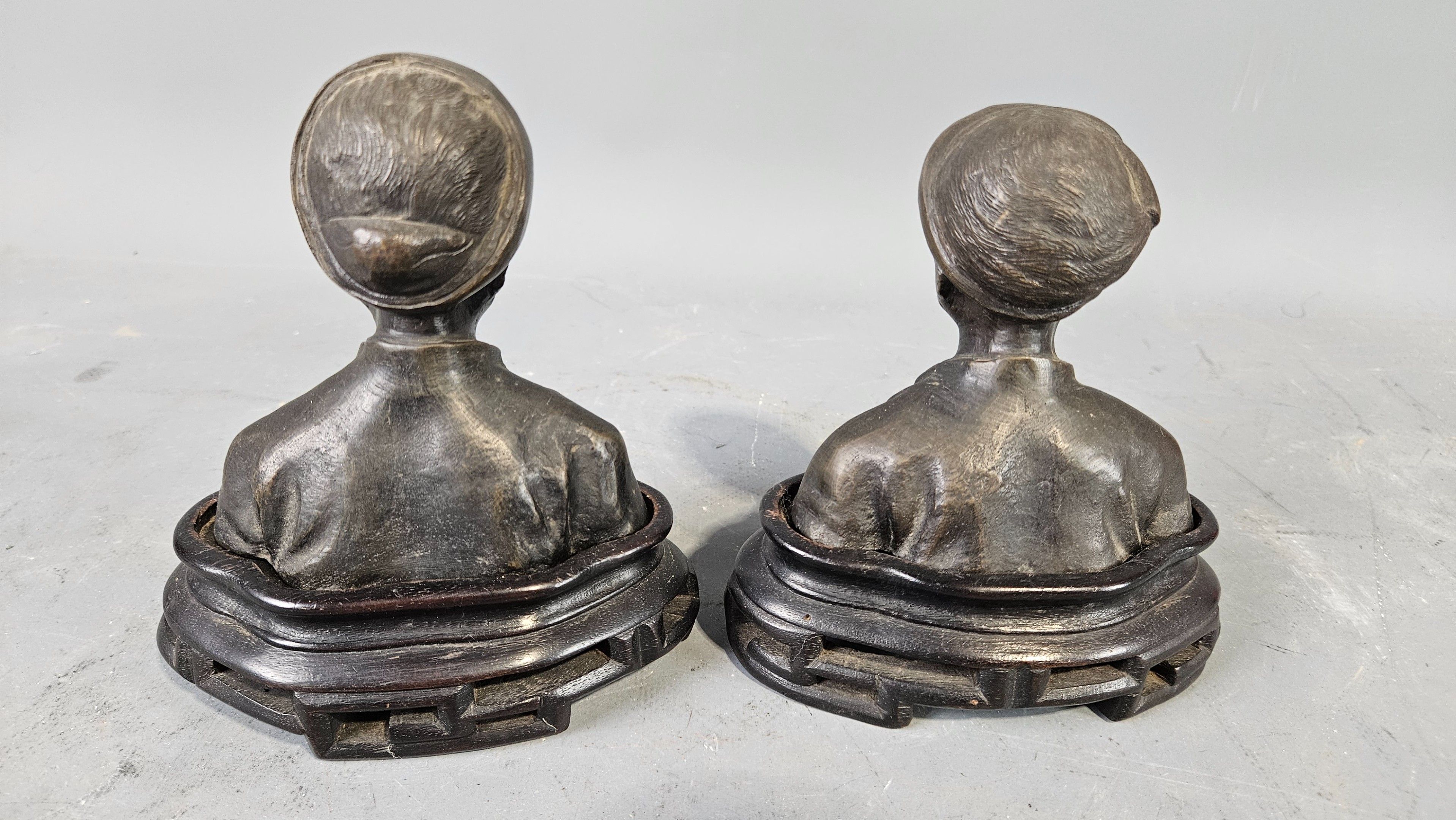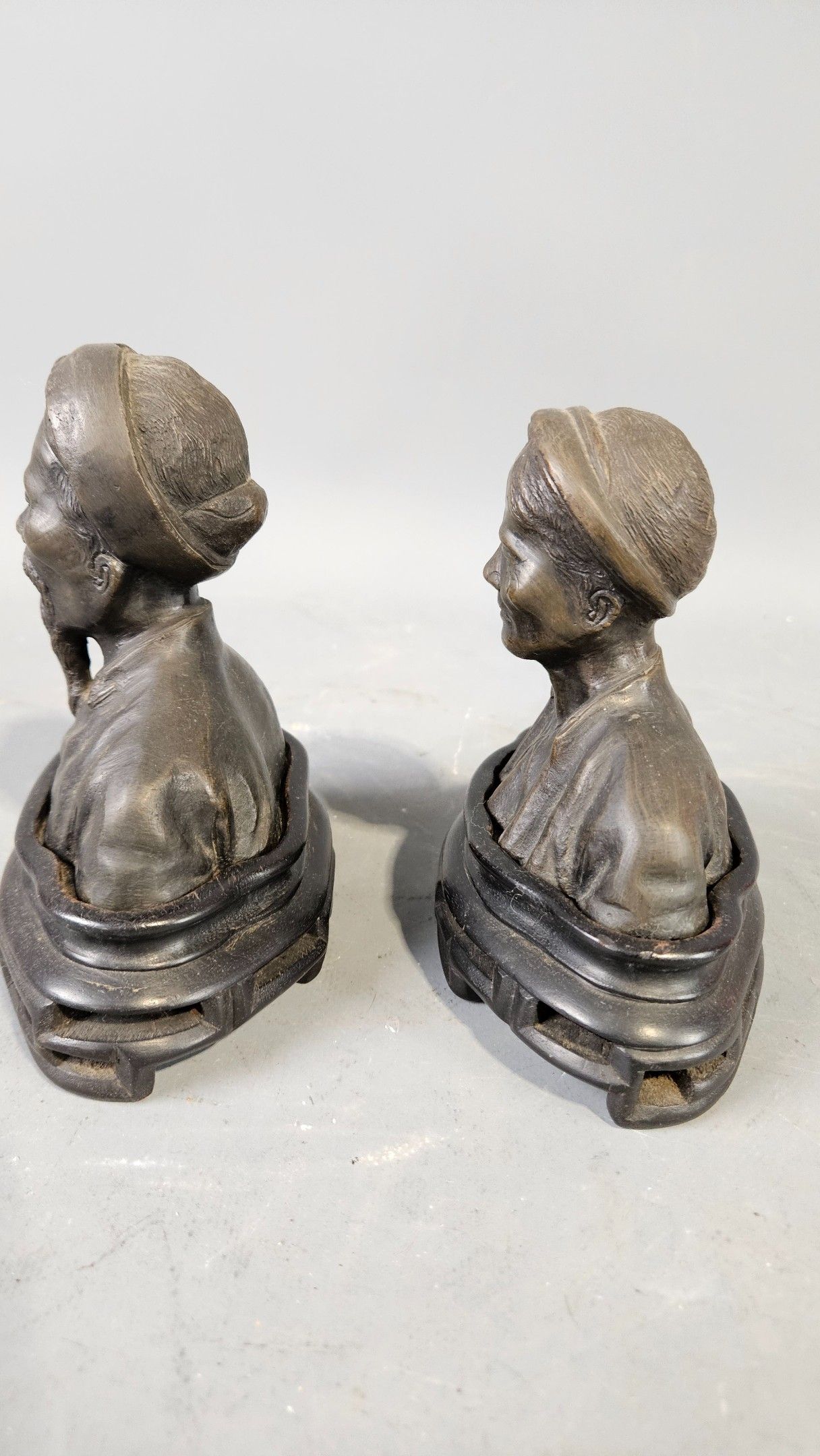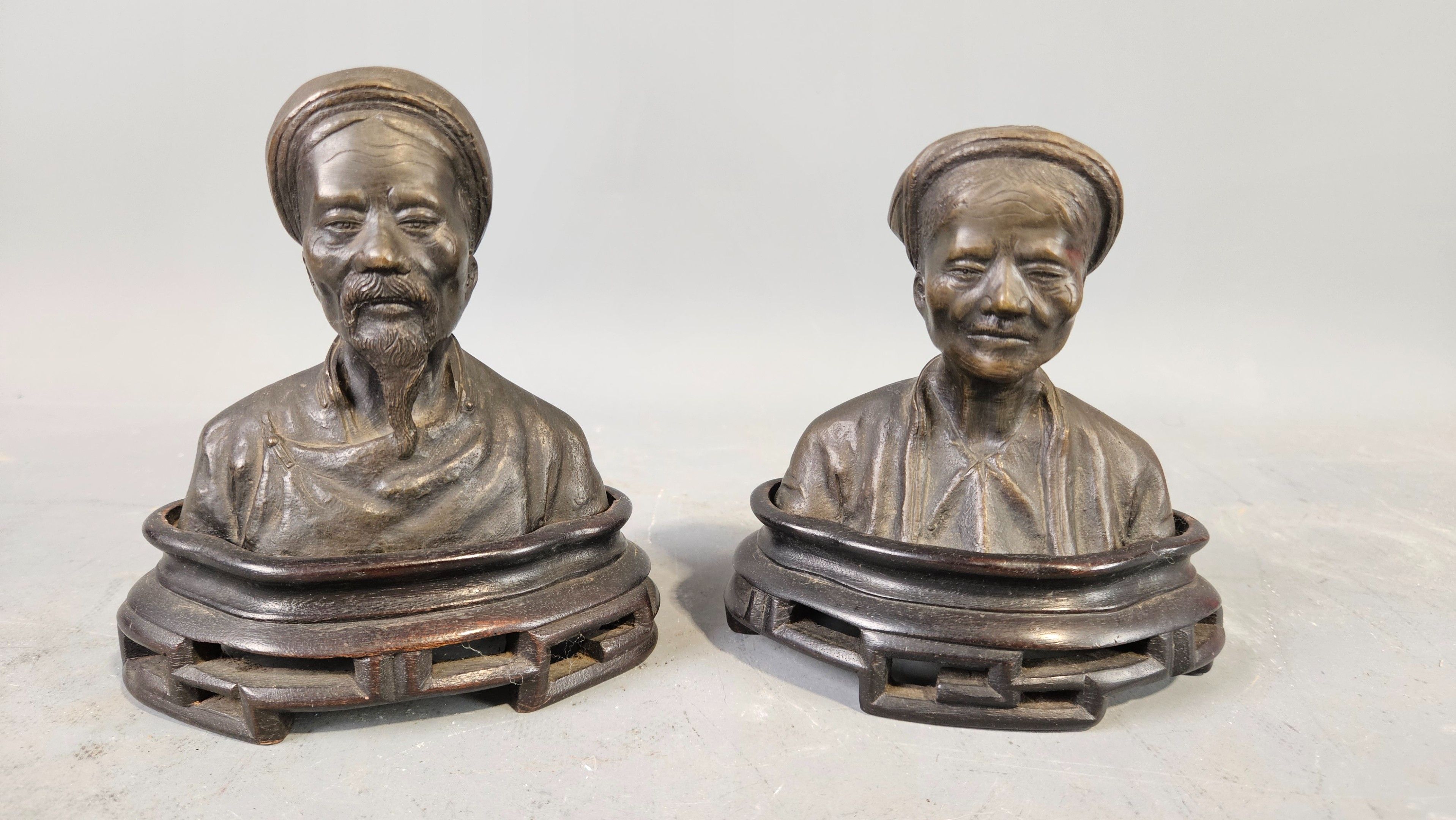 Paire de petits bustes en bronze du Vietnam figurant un couple. Contre-socle en bois noirci. Hauteur : 10,5 cm et 10 cm