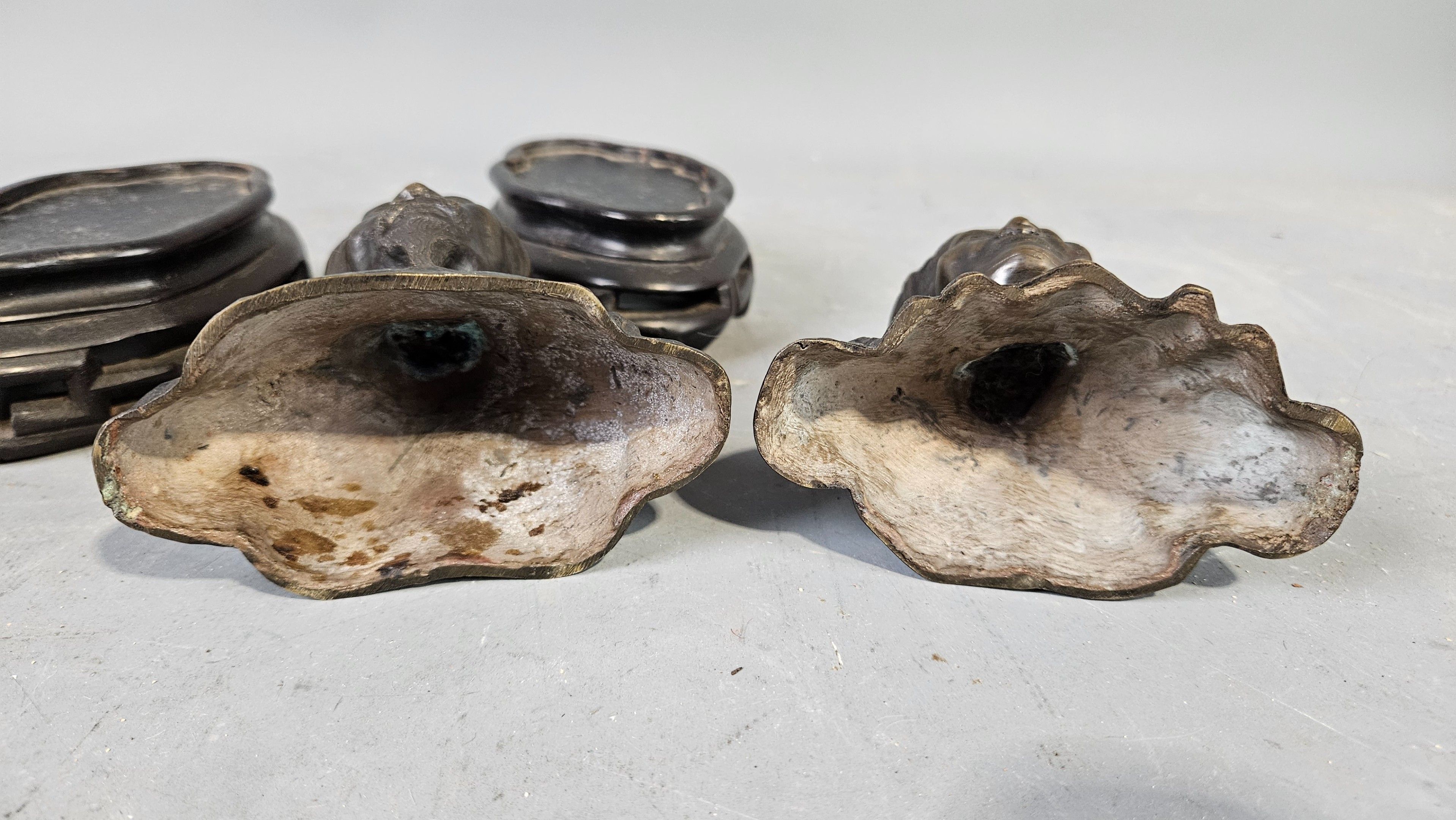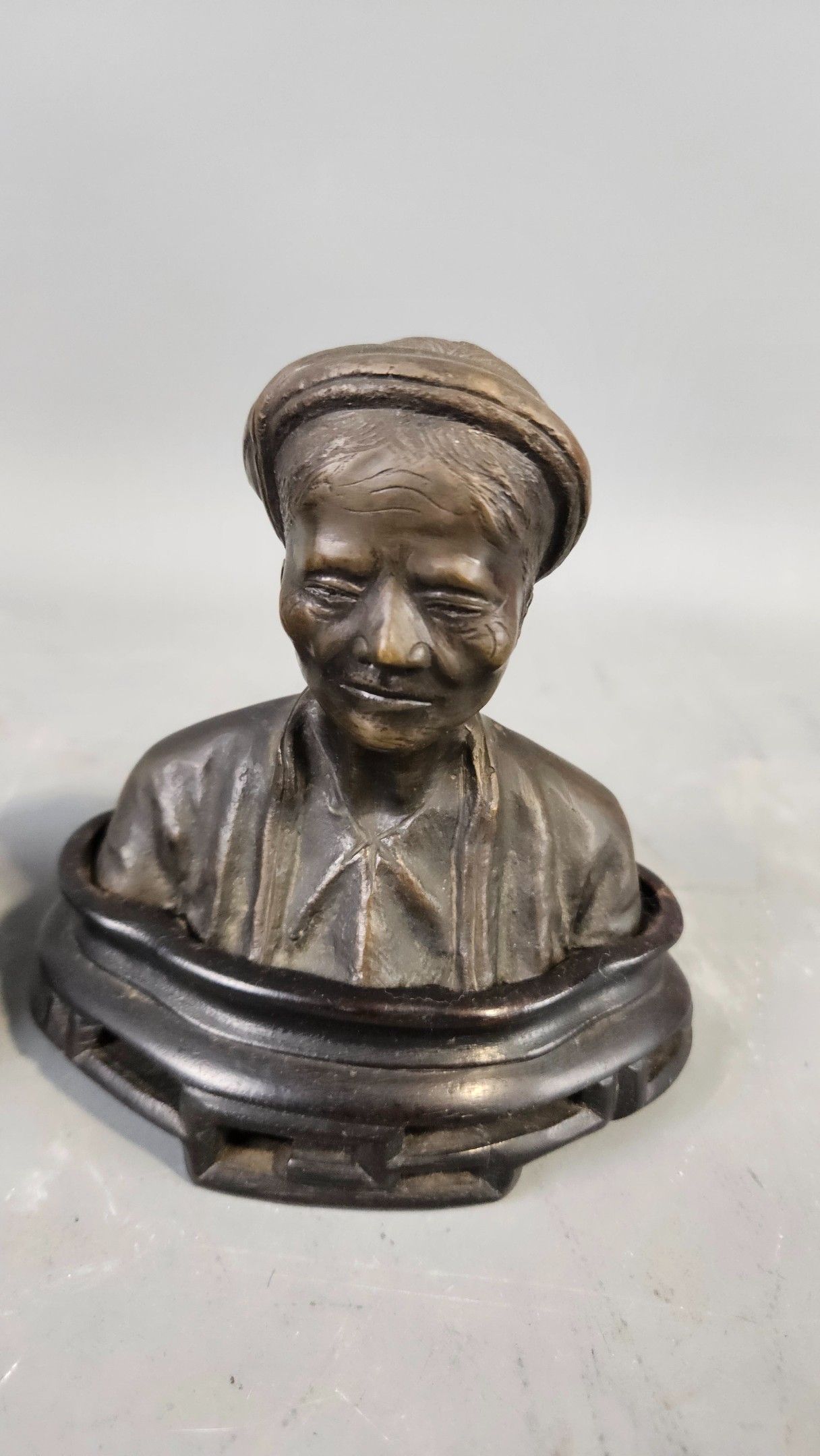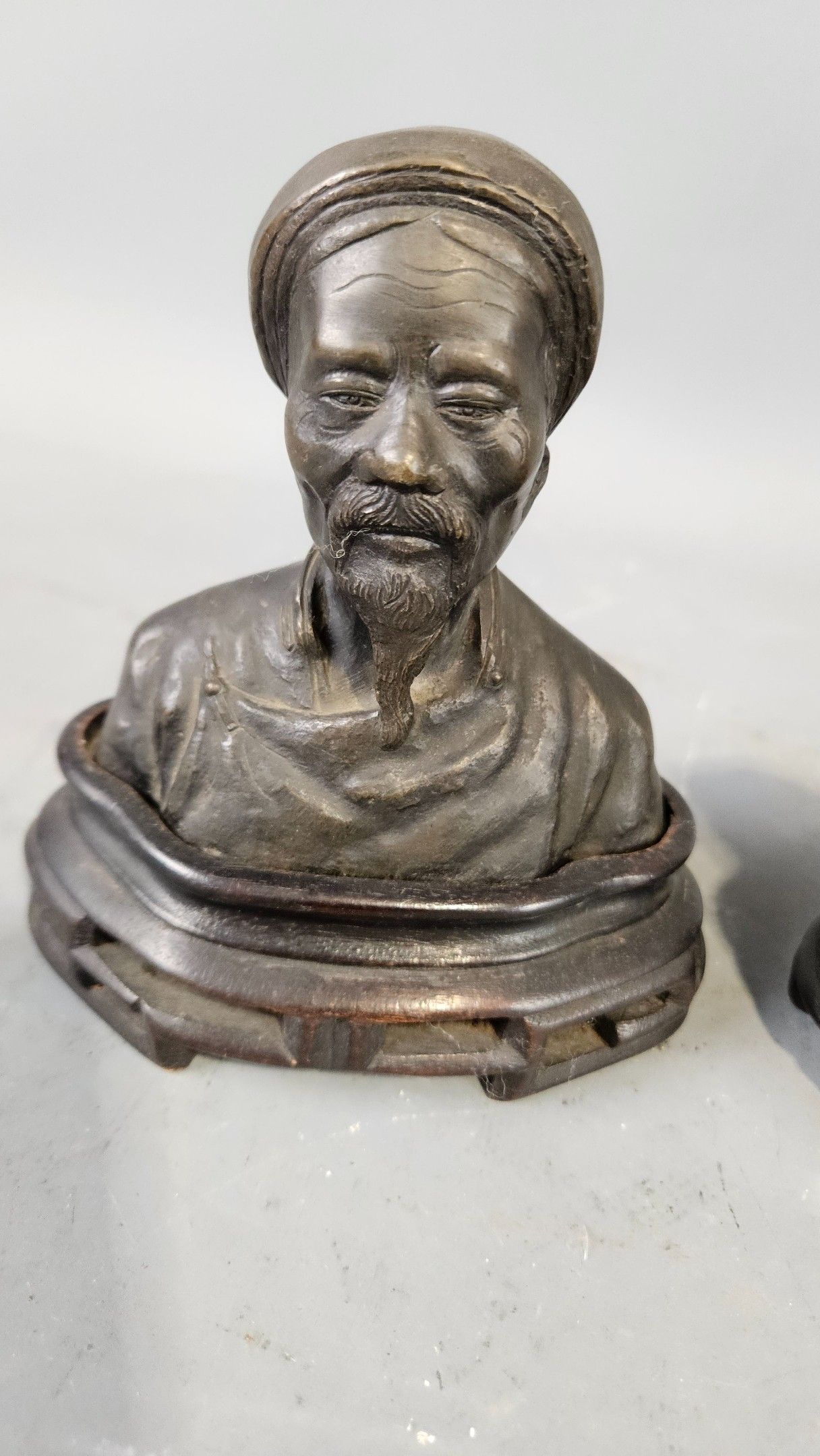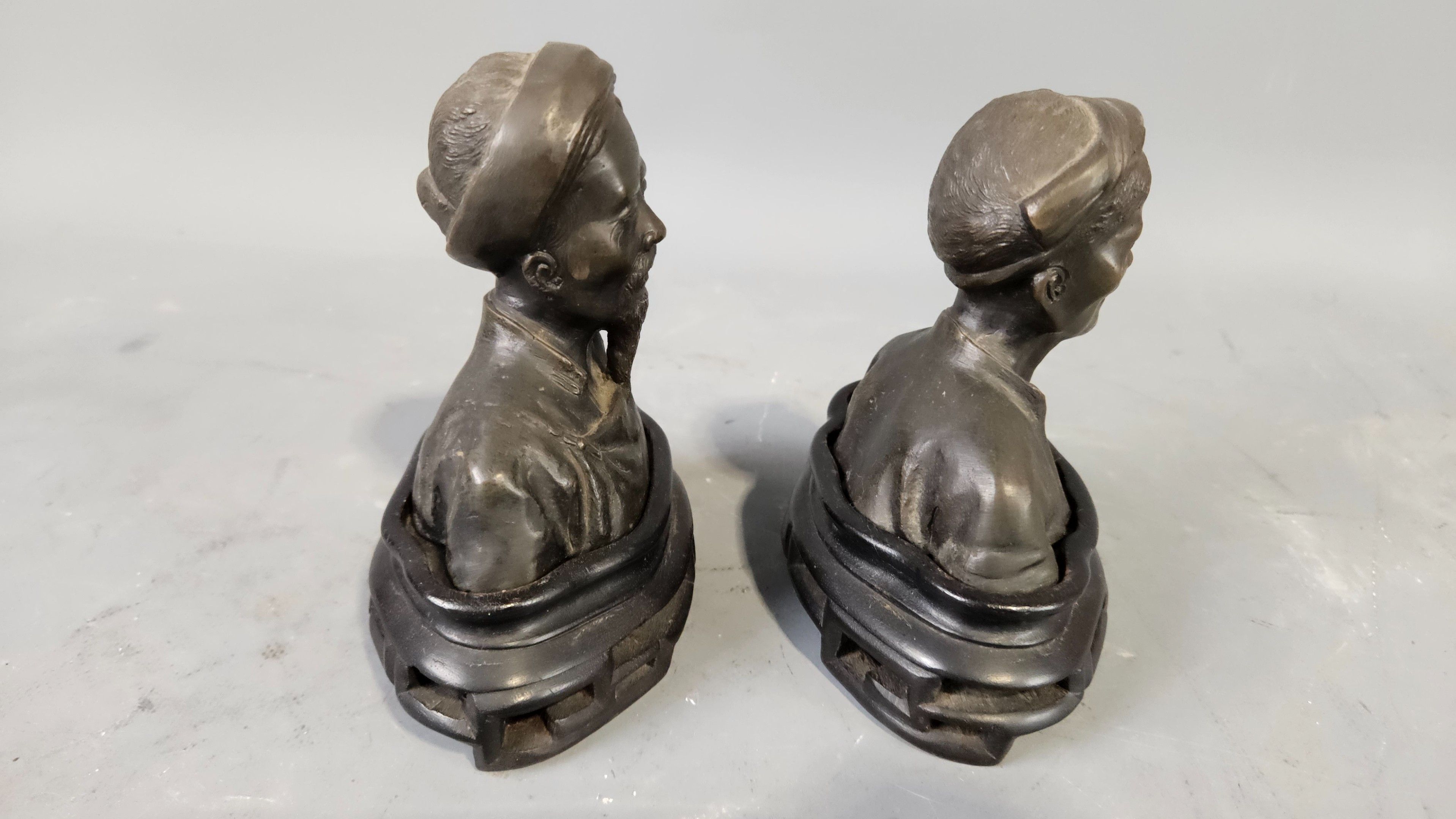 Paire de petits bustes en bronze du Vietnam figurant un couple. Contre-socle en bois noirci. Hauteur : 10,5 cm et 10 cm