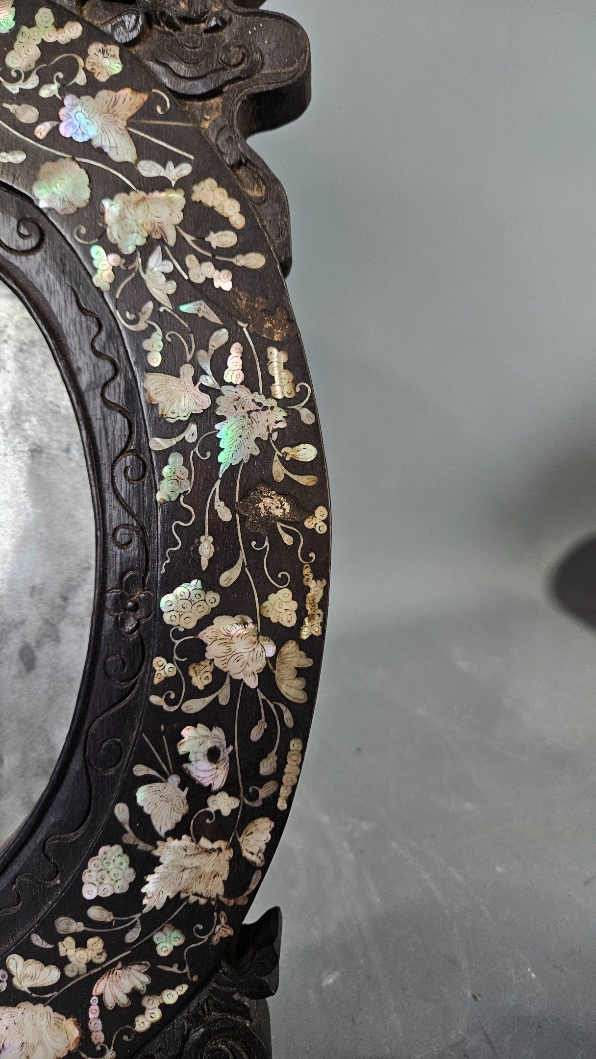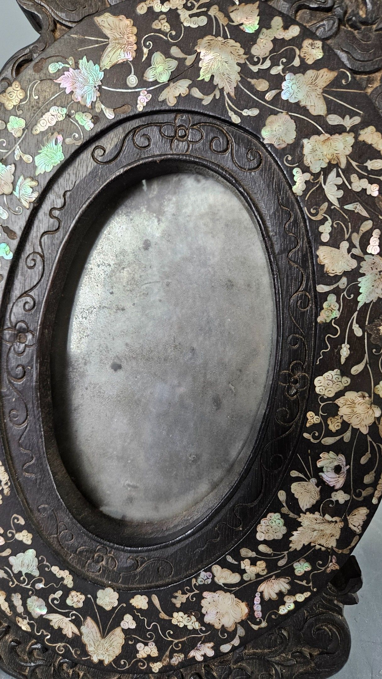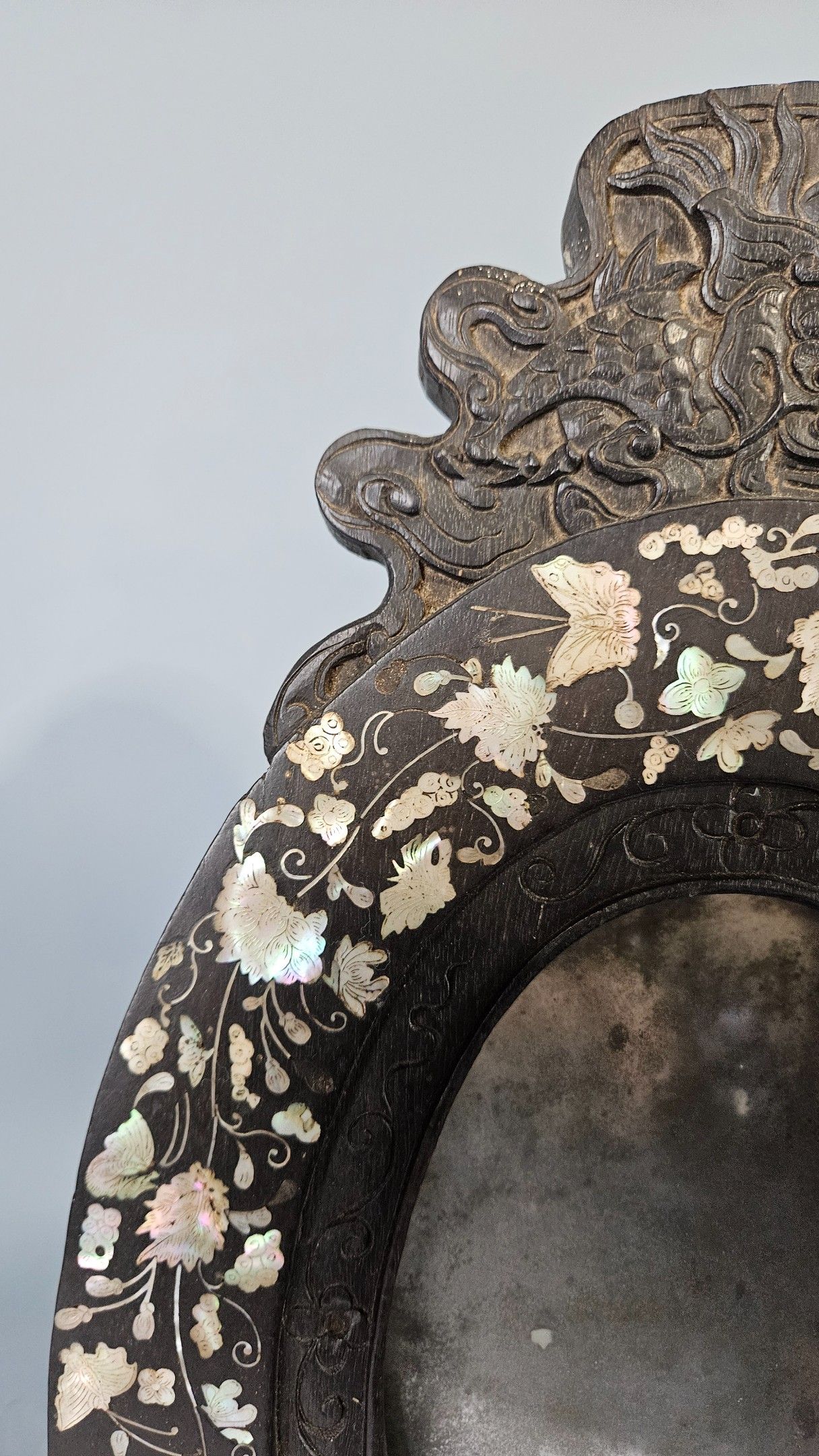 Miroir de table ovale en bois sombre incrusté de nacre décor d’un dragon au fronton. Chine vers 1900. Hauteur : 44 cm. Petits manques au décor, tain très usé