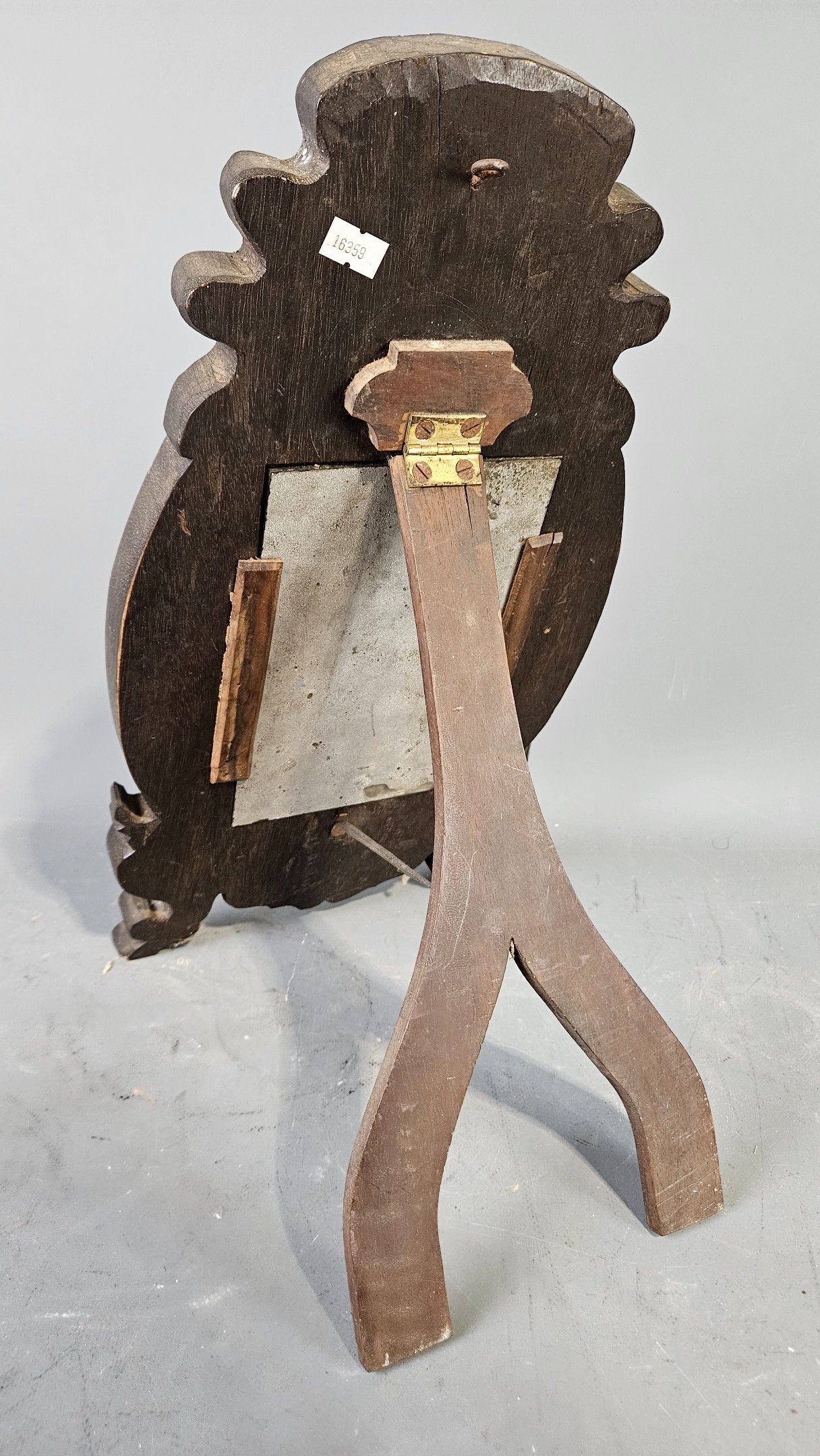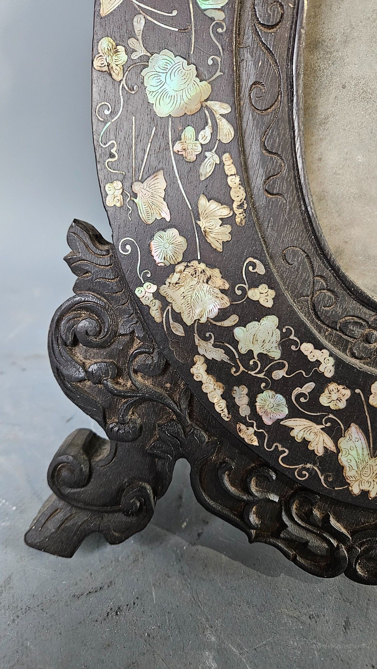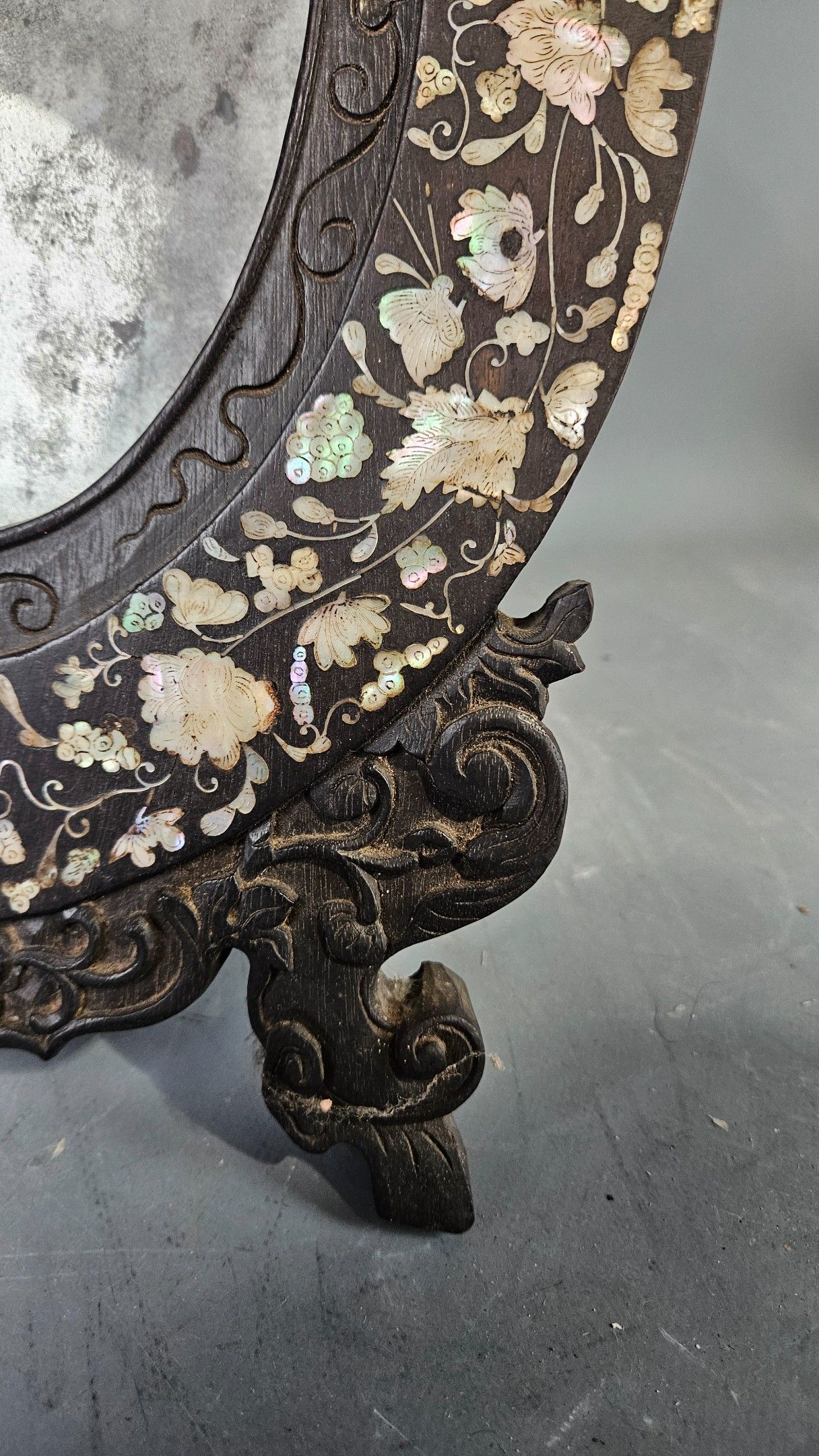 Miroir de table ovale en bois sombre incrusté de nacre décor d’un dragon au fronton. Chine vers 1900. Hauteur : 44 cm. Petits manques au décor, tain très usé