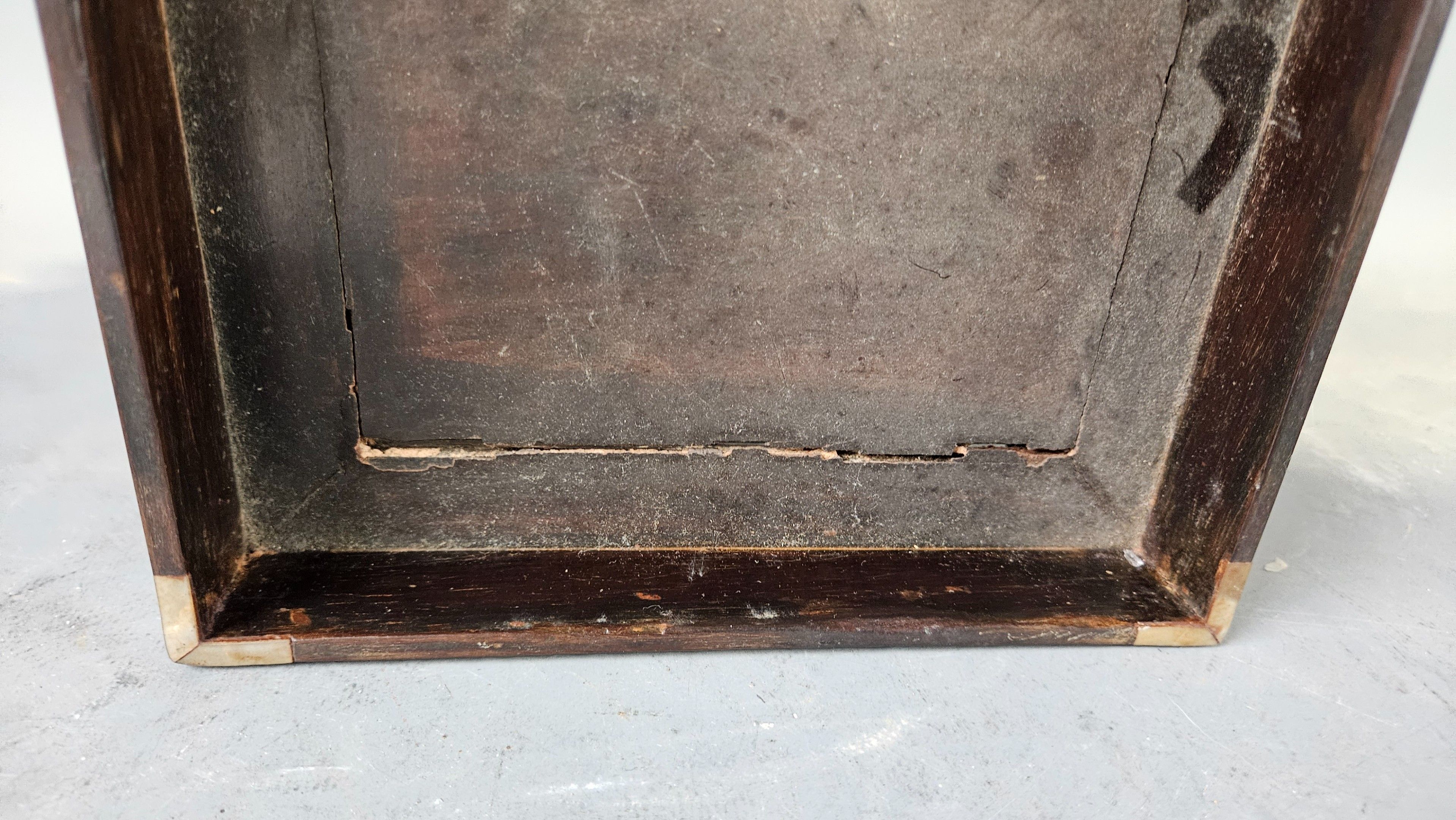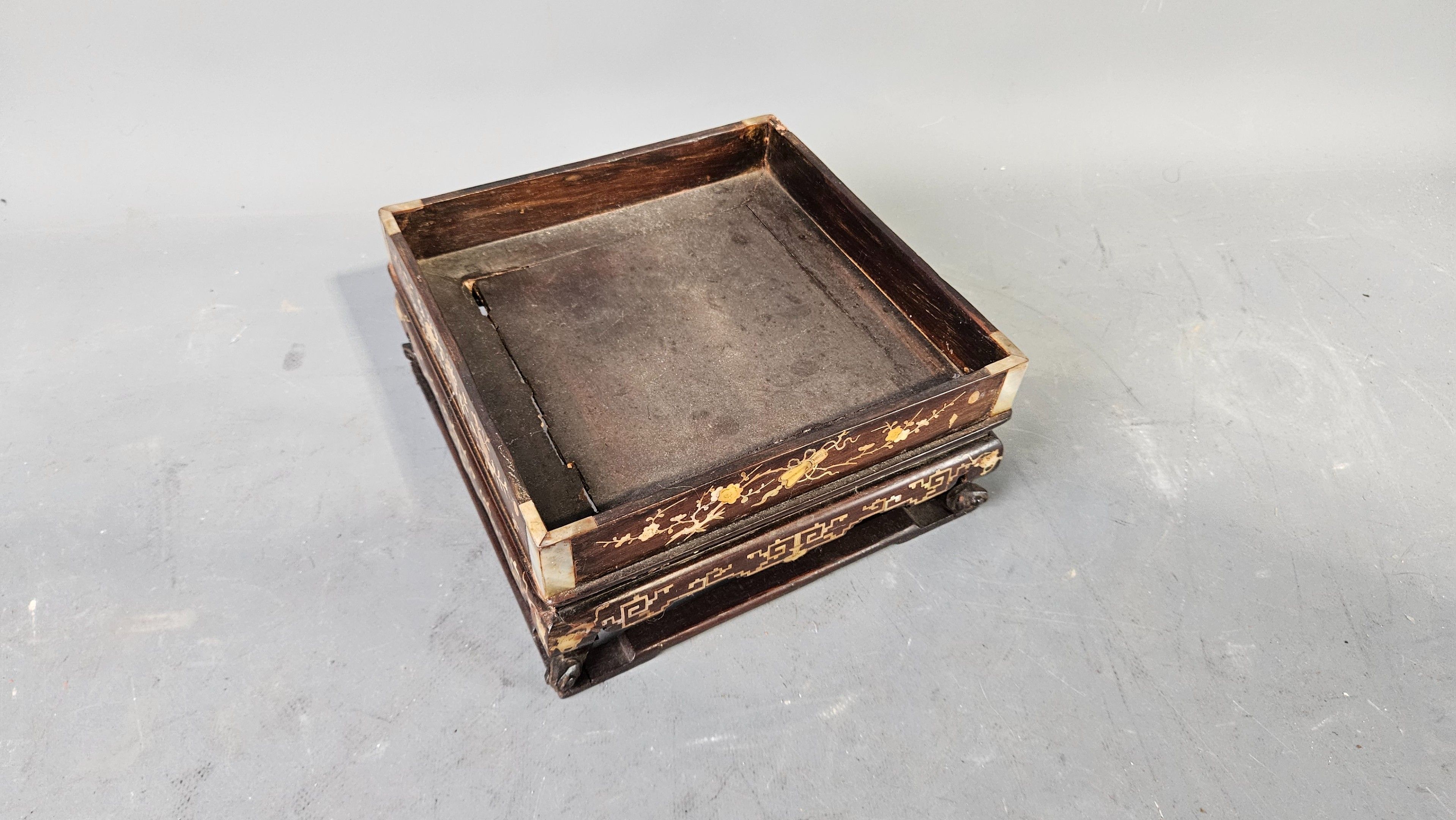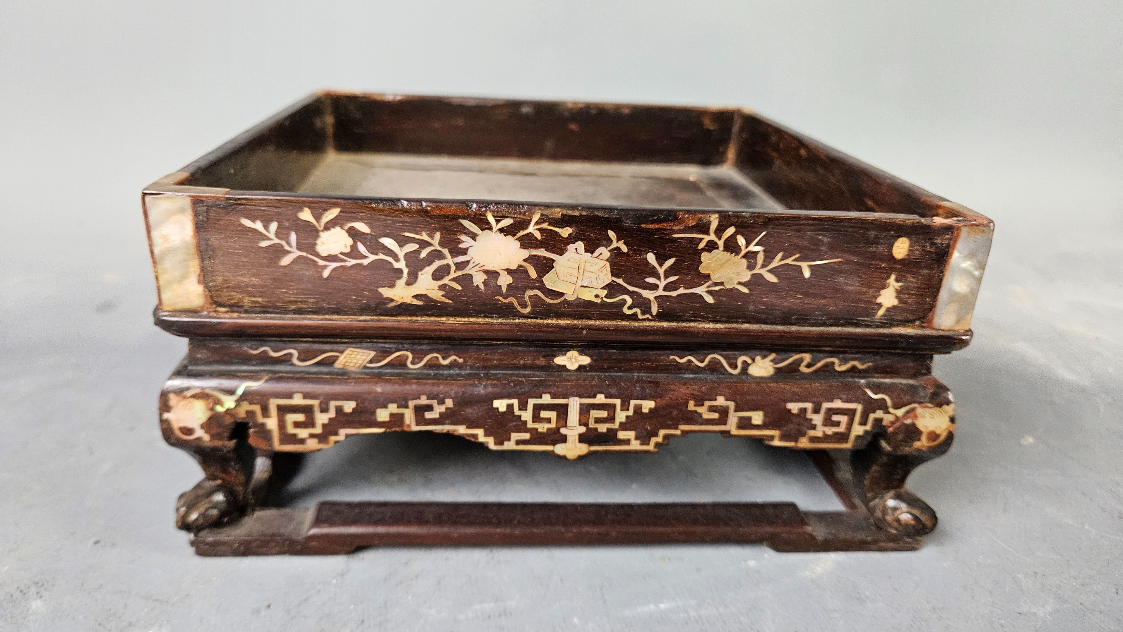 Petit plateau à cuvette à section carrée (20 cm) en bois de rose incrusté de nacre, Chine fin XIXème. Petites fentes et manques