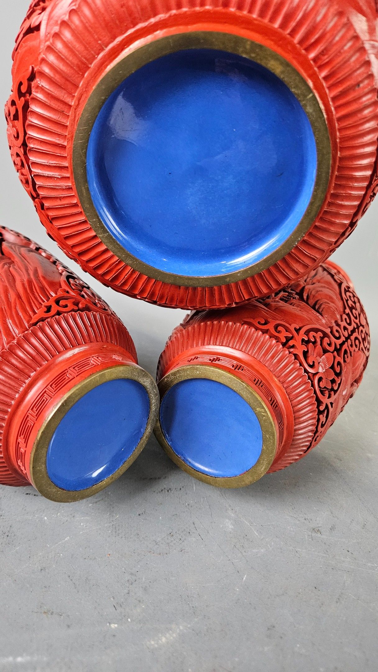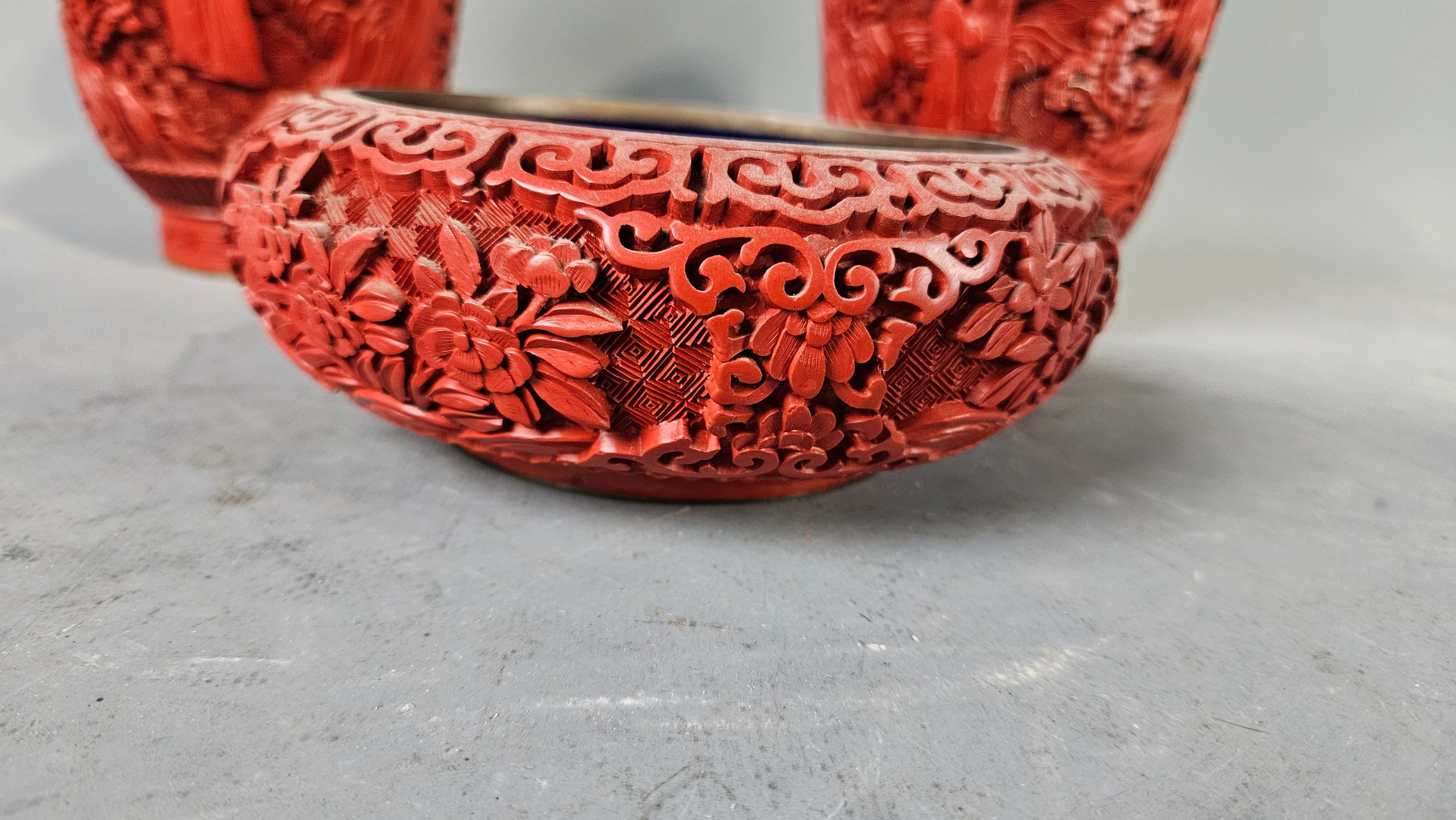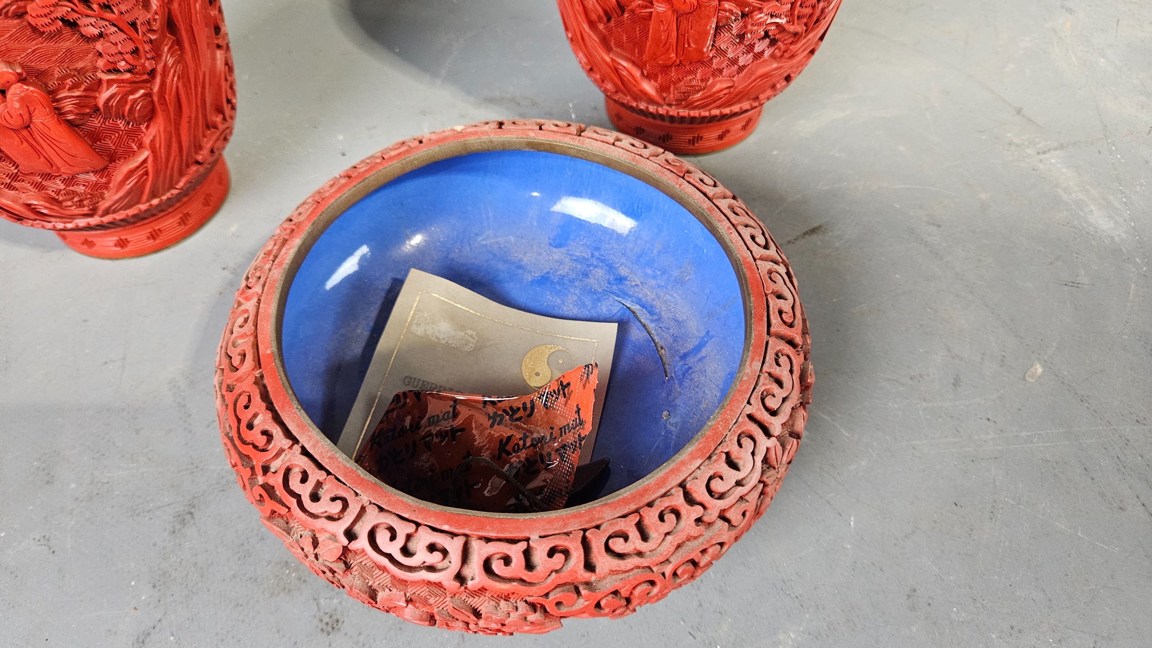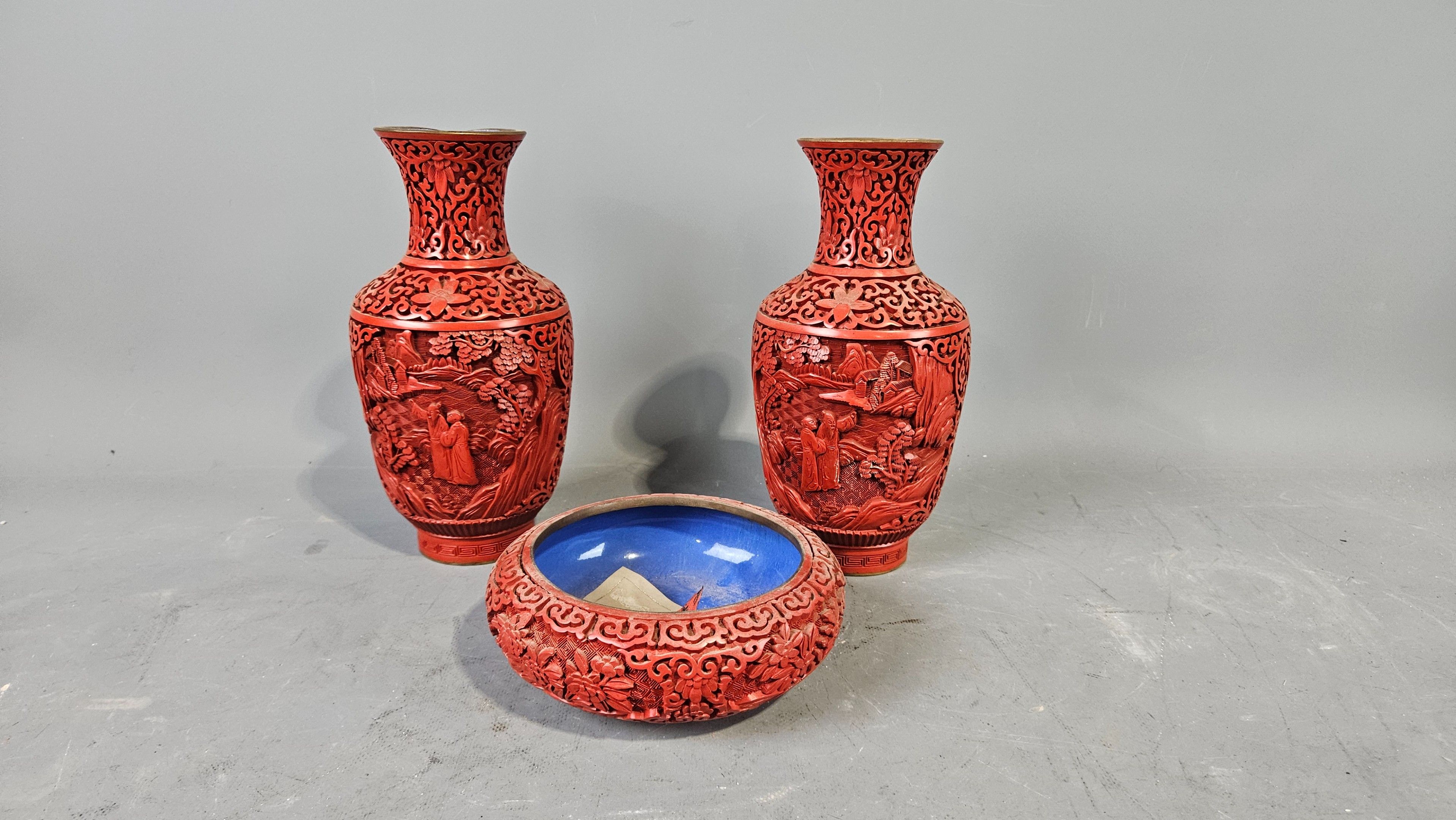 Trois petits sujets en laque rouge de Pékin moderne : une paire de vase (hauteur : 23 cm, enfoncement au col de l'un) et une coupelle (diamètre : 15 cm)