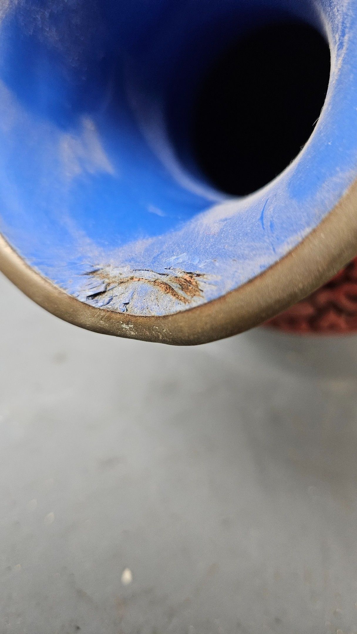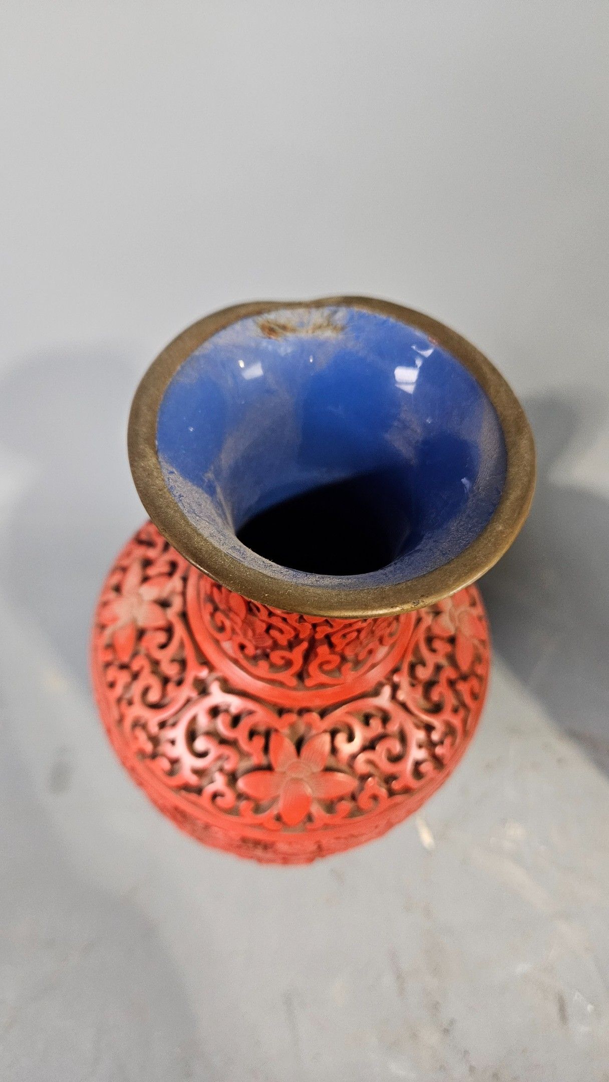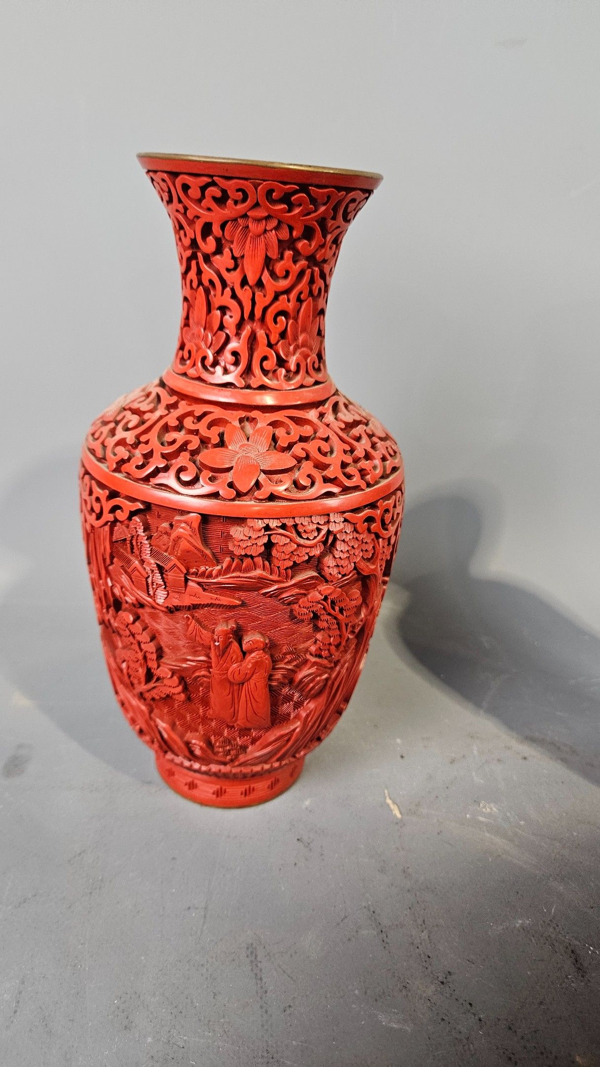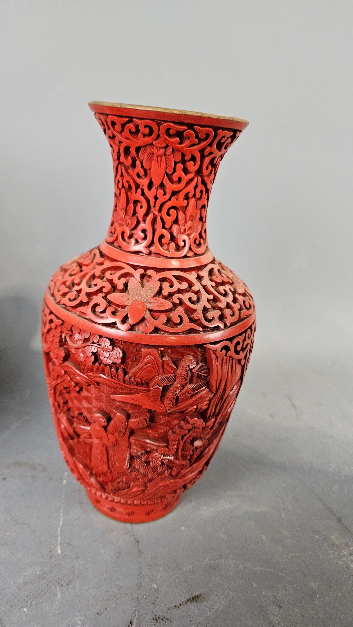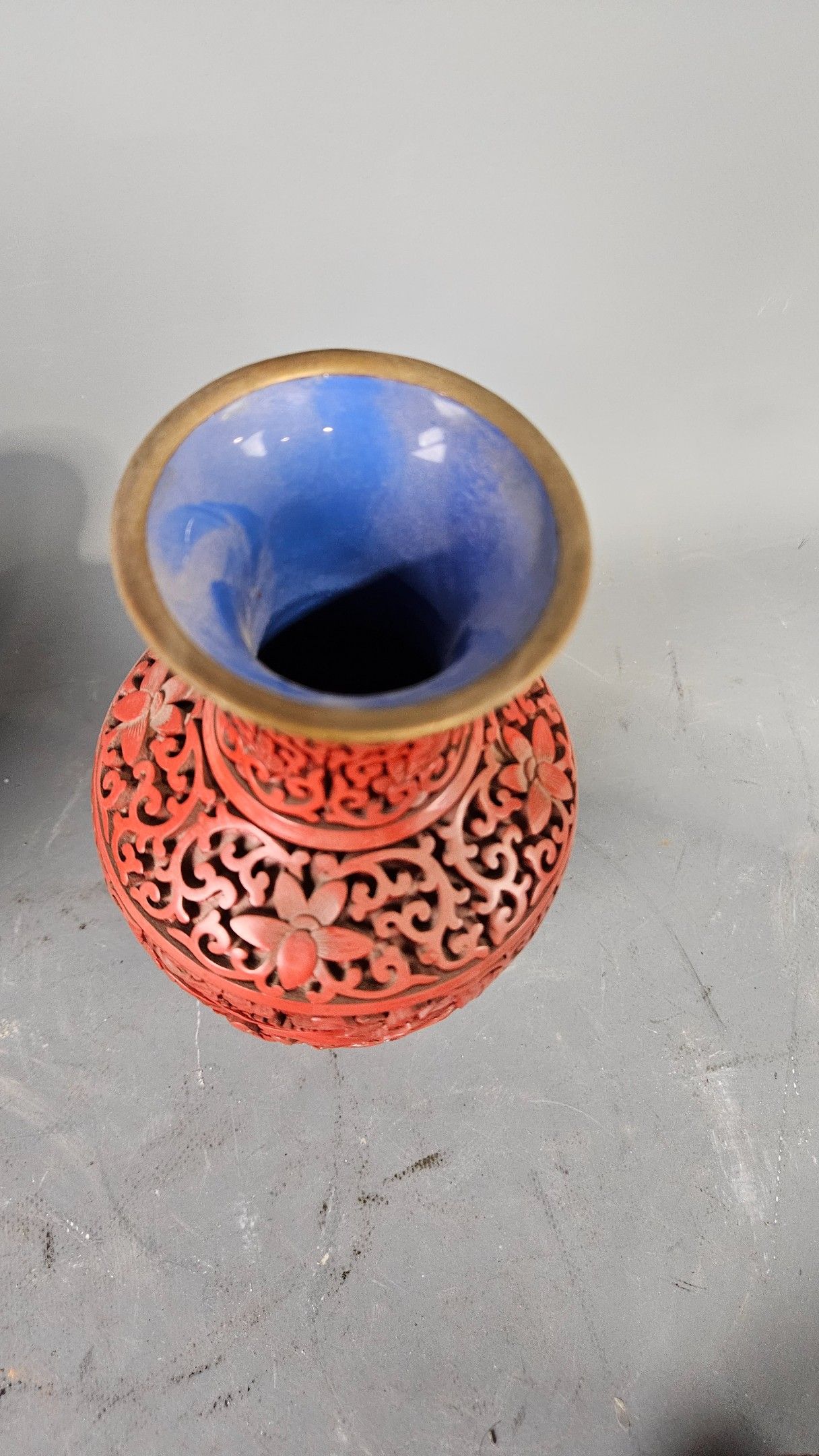 Trois petits sujets en laque rouge de Pékin moderne : une paire de vase (hauteur : 23 cm, enfoncement au col de l'un) et une coupelle (diamètre : 15 cm)