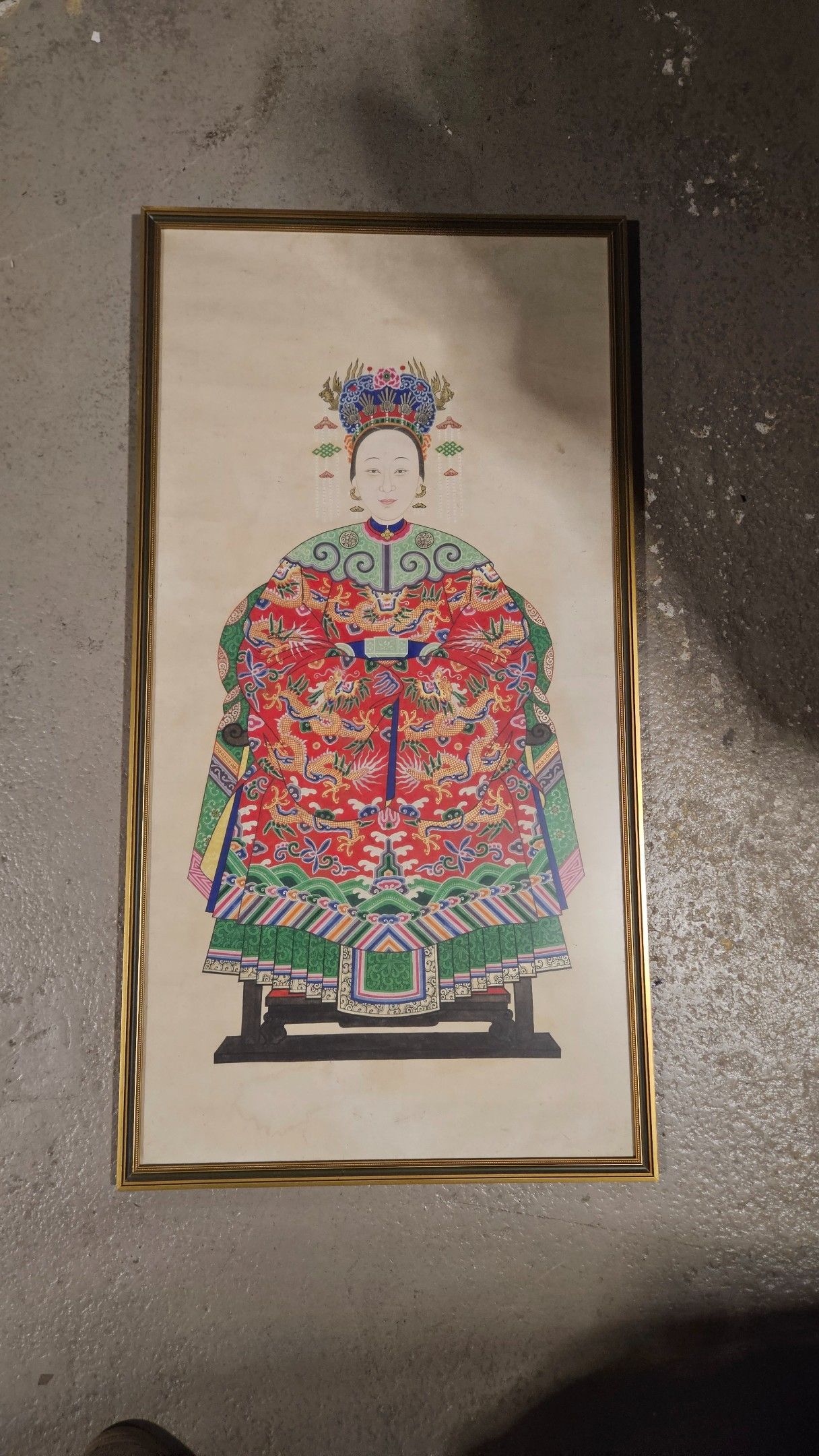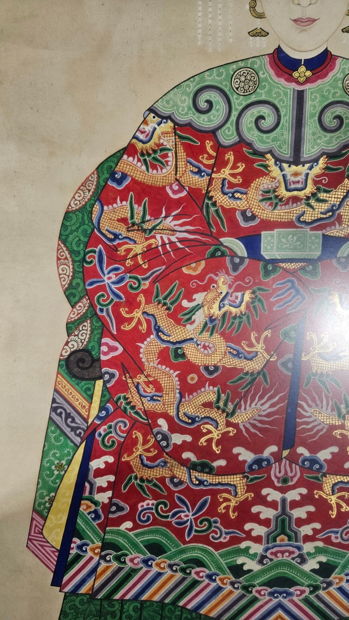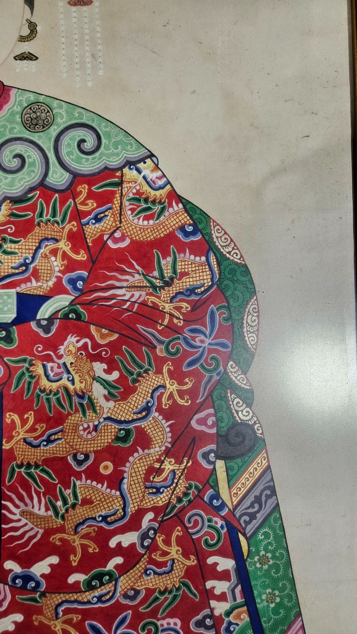 Grande gouache d’Extrême-Orient représentant une dame de cour trônant. 99 x 50 cm à vue. Légères pliures et jaunissures