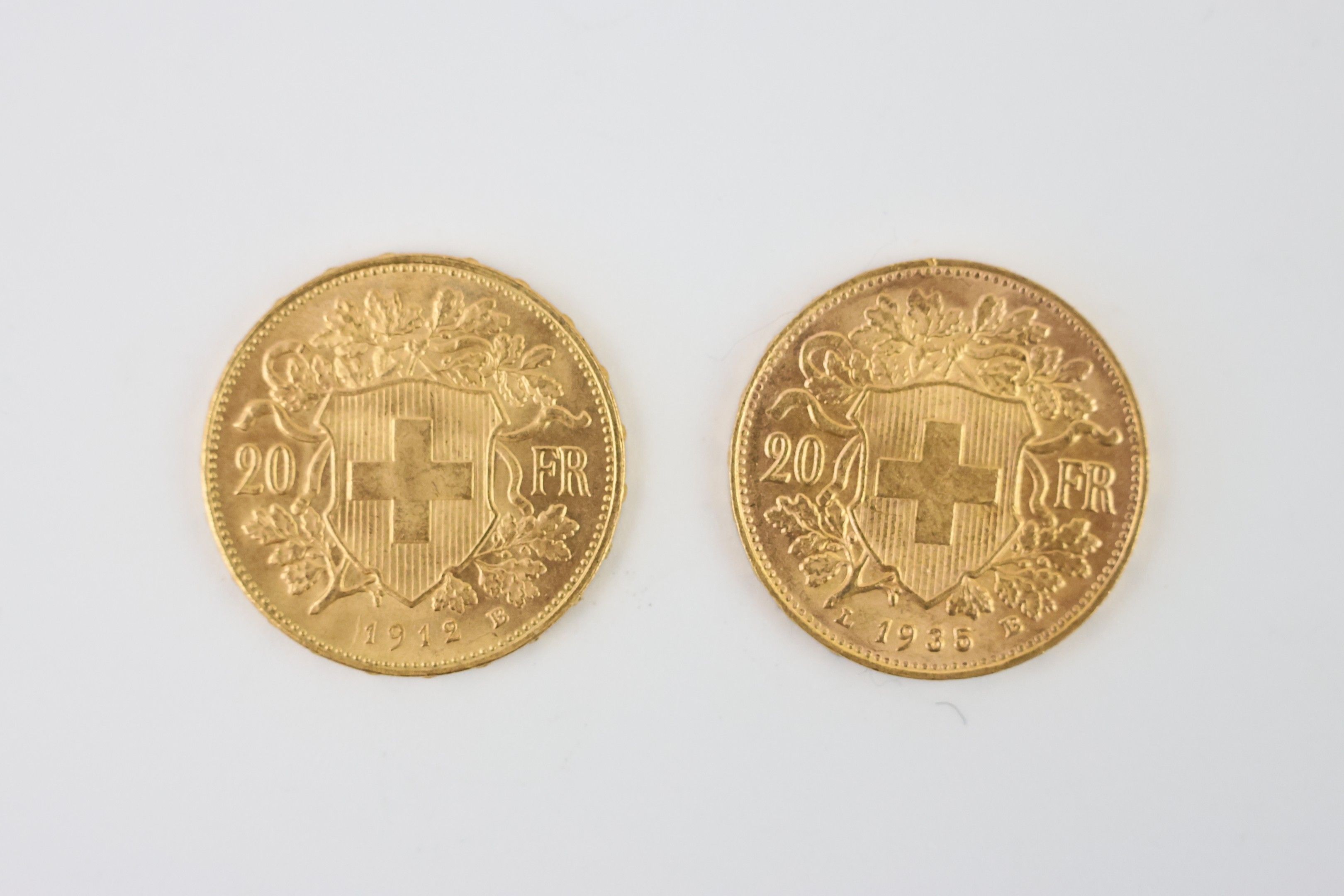 Sur désignation : Lot de 2 pièces de 20 francs or Suisse Helvetia 1912 et 1935, 12,9 g - non visible à l'étude, au coffre de la banque