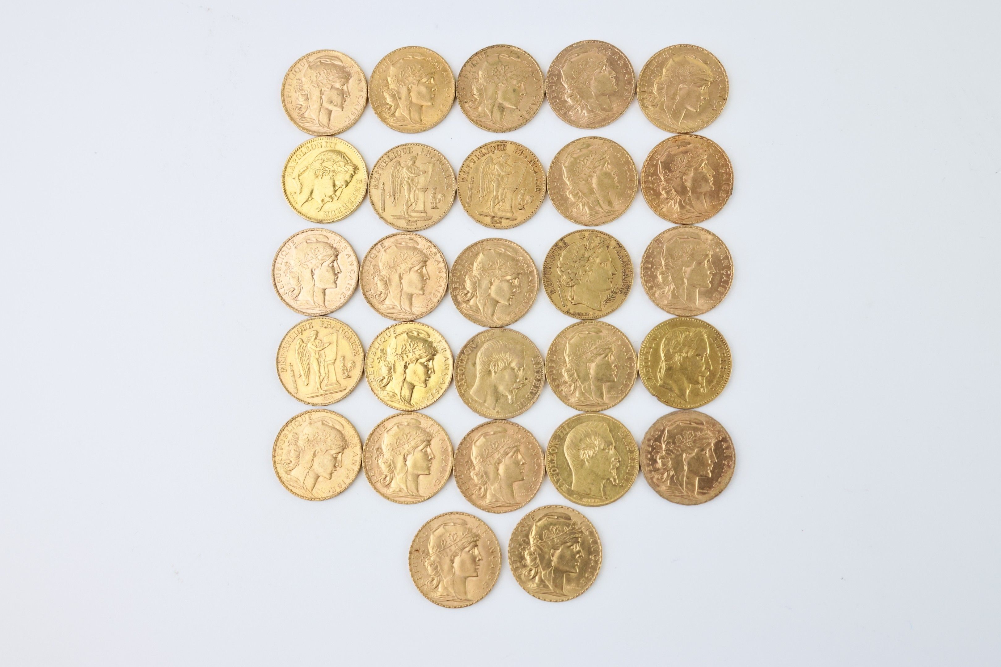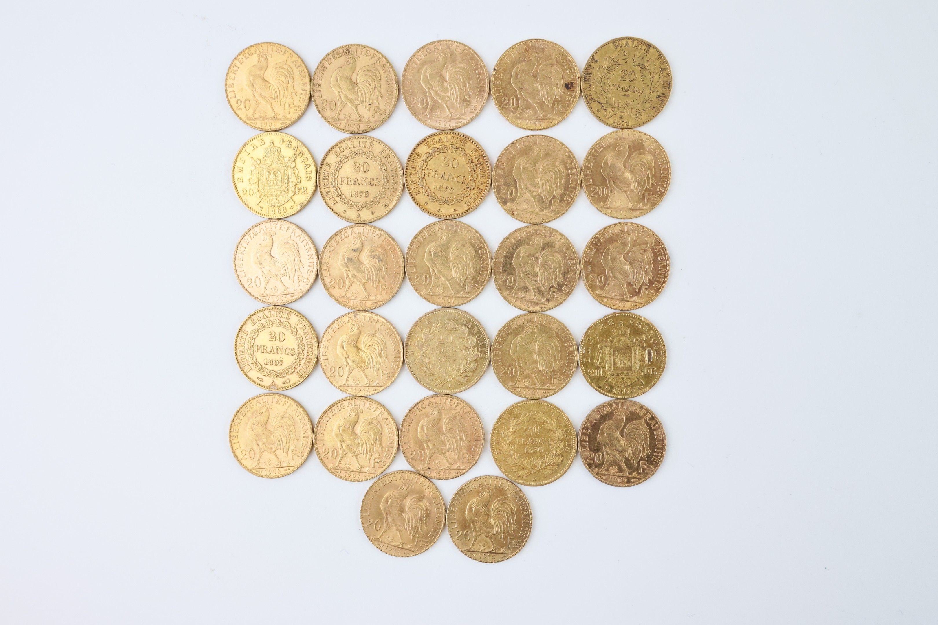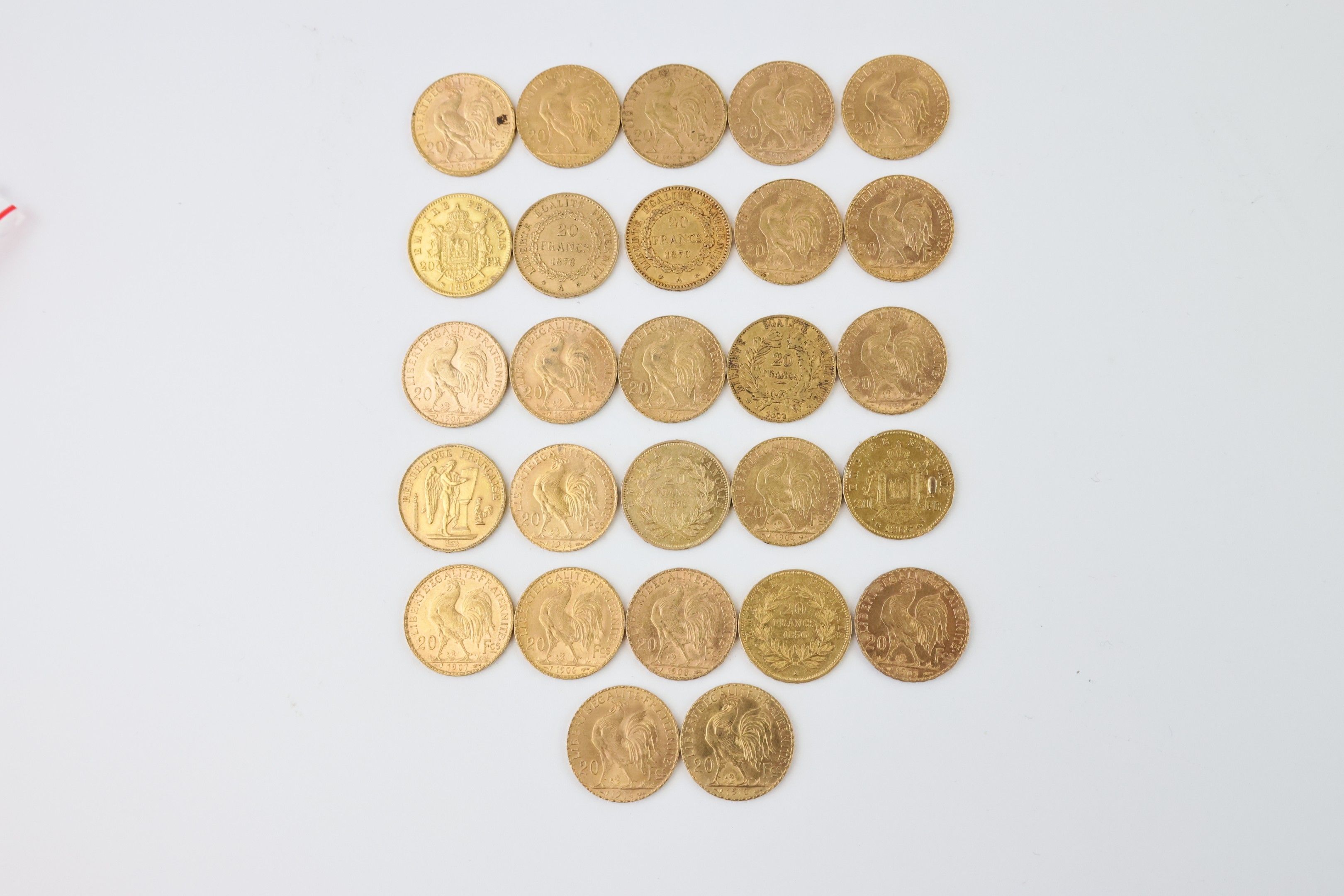 Sur désignation : Lot de 27 pièces de 20 francs or comprenant Cérès 1851 ; Napoléon III 1856 x 2, 1866 x 2 ; Génie 1876 x 2, 1897 ; Coq 1901, 1904 x 2, 1906 x 2, 1907 x 3, 1908 x 3, 1909 x 4, 1910, 1912, 1914 x 2, 173,8 g - non visible à l'étude, au coffre de la banque