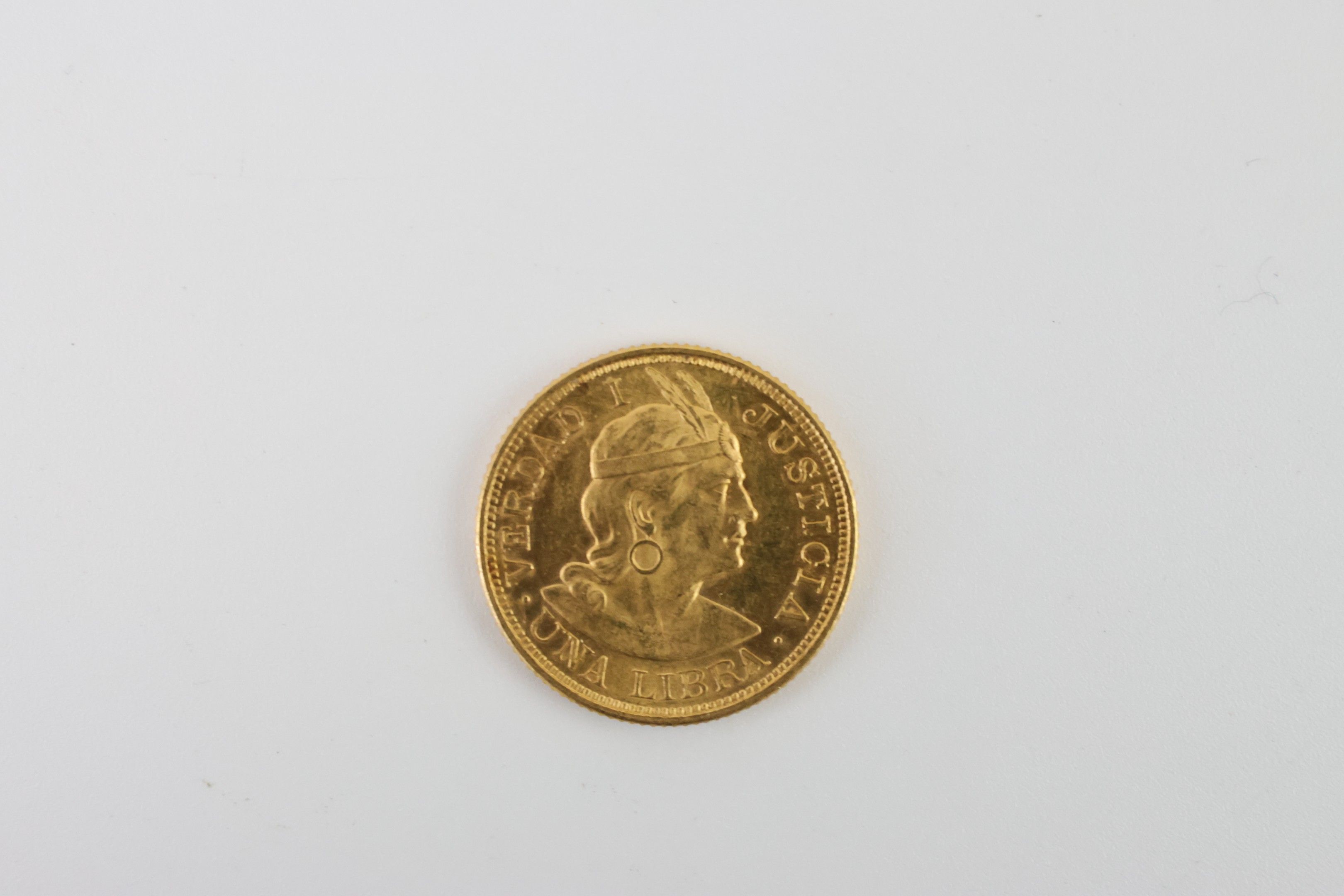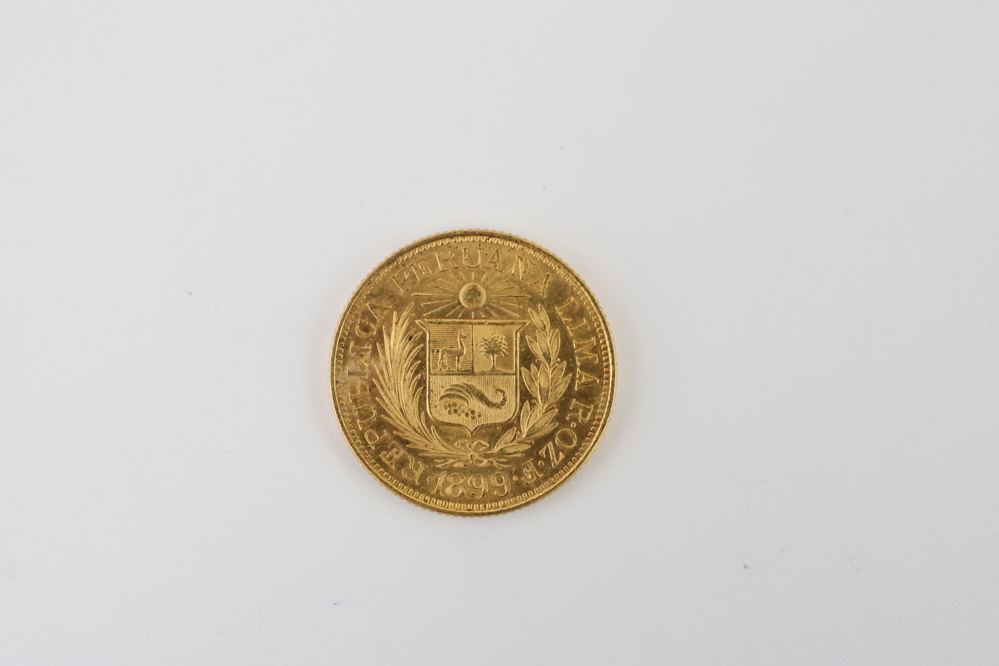 Sur désignation : Pièce de una libra en or Pérou 1899, 8 g - non visible à l'étude, au coffre de la banque