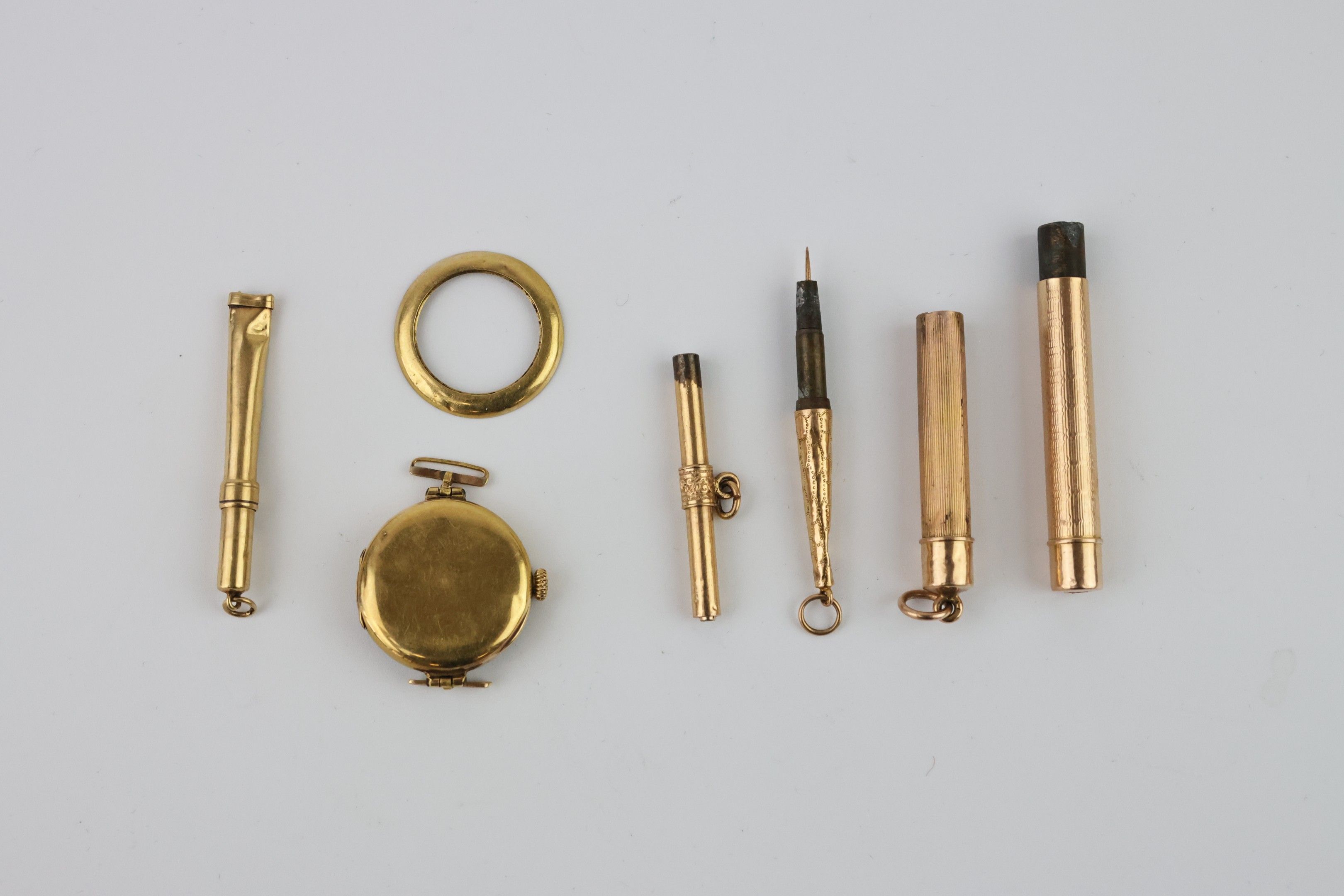 Lot d'or (750) comprenant une montre de gousset (le verre et le cadran manquants), une clé de montre, 4 stylets (accidentés), 32,1 gbt