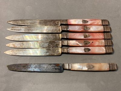 6 couteaux à manches en nacre dont 5 à lames en vermeil, ép …