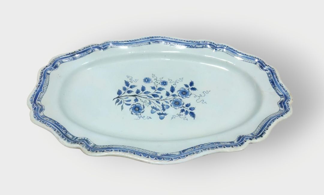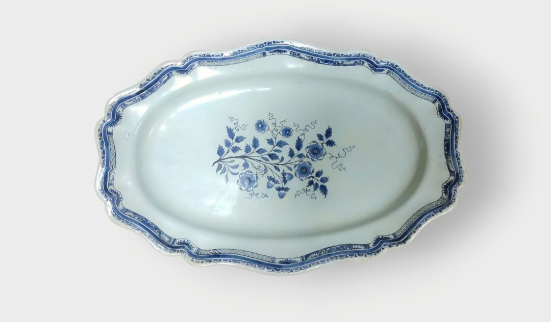Grand plat ovale à bord chantourné en faïence à décor en camaïeu bleu d'un bouquet entouré d'une frise de feuillages et d'oves. Légers sauts d'émail. Dimensions : 37 x 56 cm. - Ce lot chez vous partout en France métropolitaine à partir de 14,04 € - Ce lot chez vous partout en Europe à partir de 24,00 €
