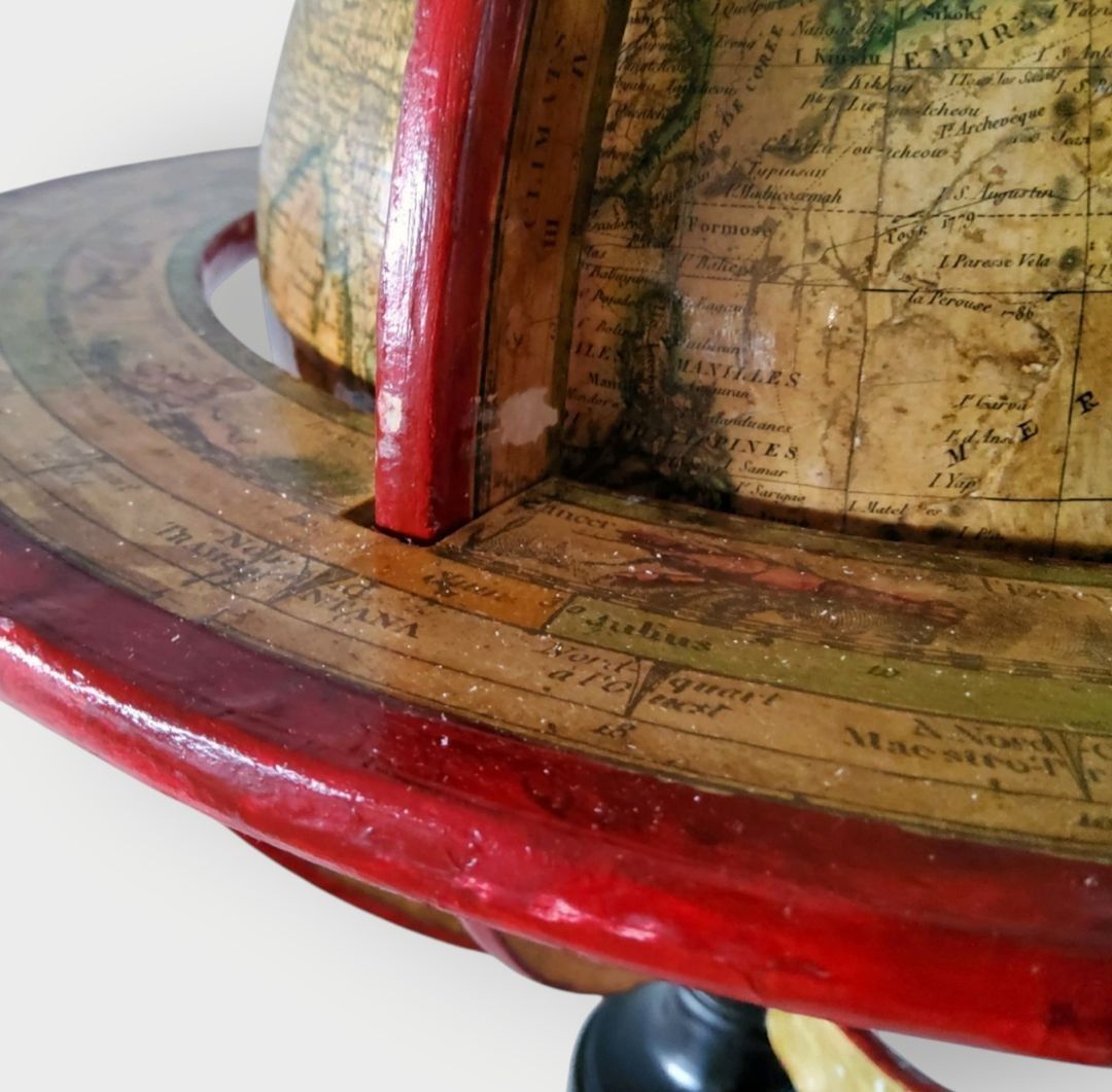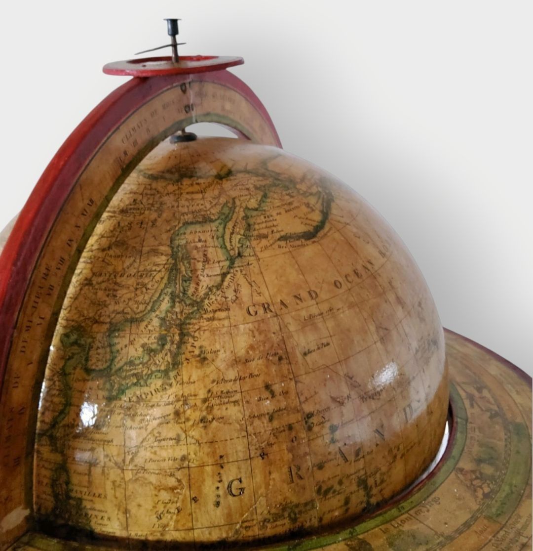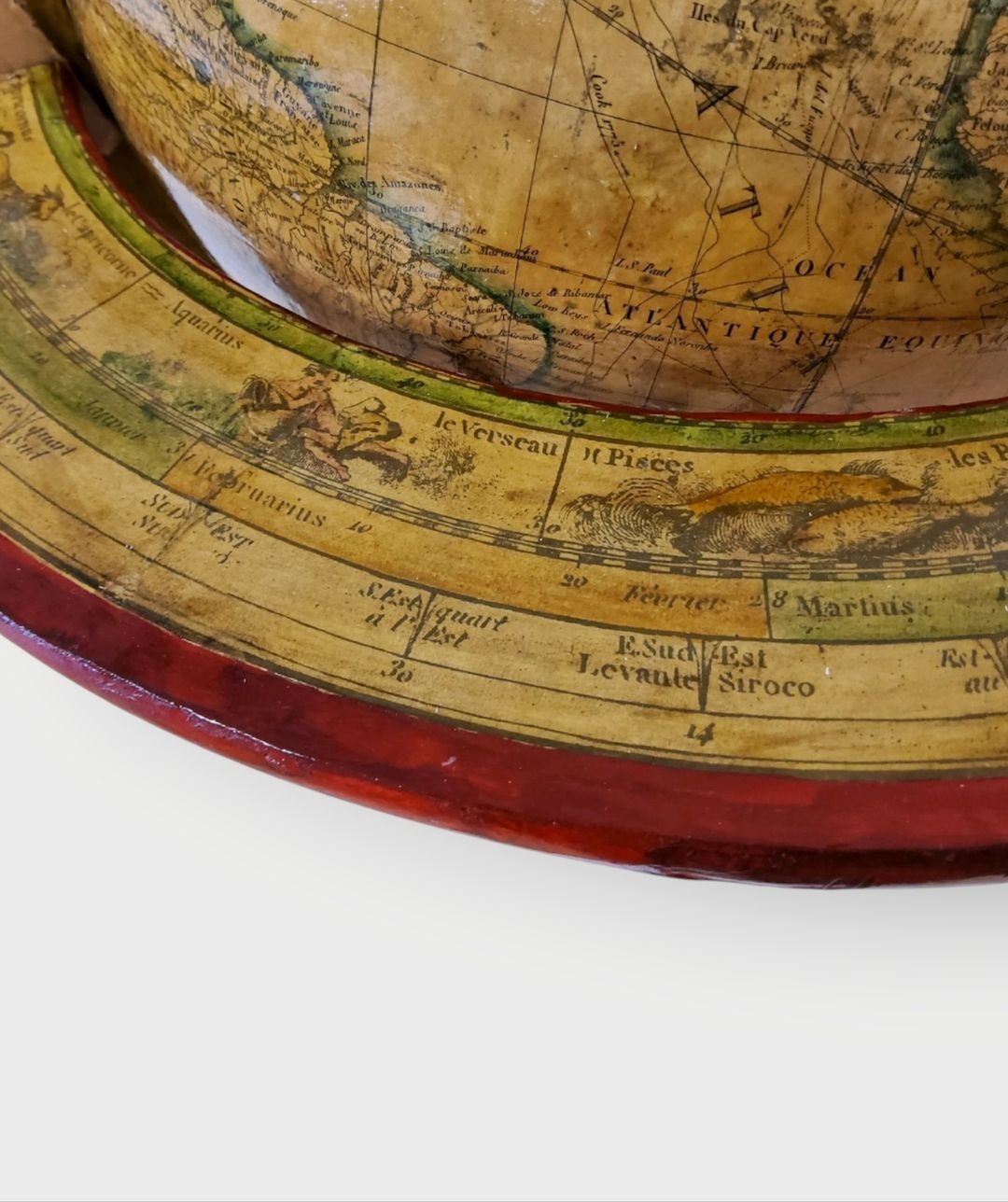 Globe terrestre de table en plâtre et papier lithographié reposant sur un piètement en bois tourné, mouluré et noirci. Table équatoriale zodiacale. Dressé par P. Lapie géographe, colon au Corps royal d’Etat Major, au compas d’Uranie, chez Bastien Ainé, éditeur rue St André des Arts à Paris. Milieu du XIXe siècle. H.70 cm. Diamètre : 42 cm env.(Bon état général, petites déchirures et restaurations) - Ce lot chez vous partout en France métropolitaine à partir de 15,72 € - Ce lot chez vous partout en Europe à partir de 30,00 €