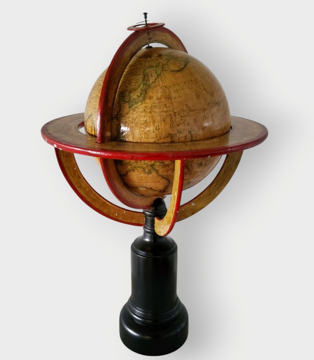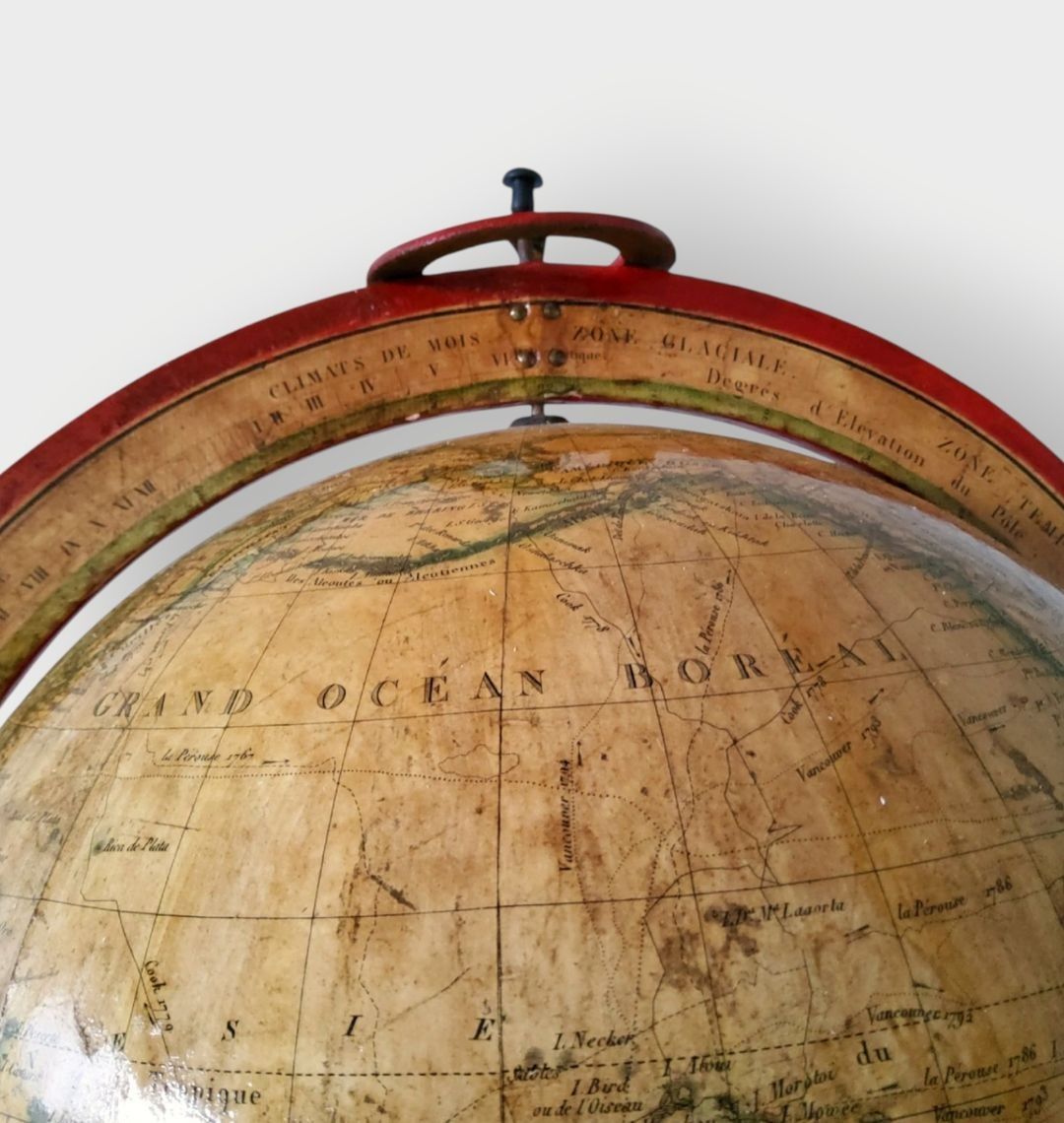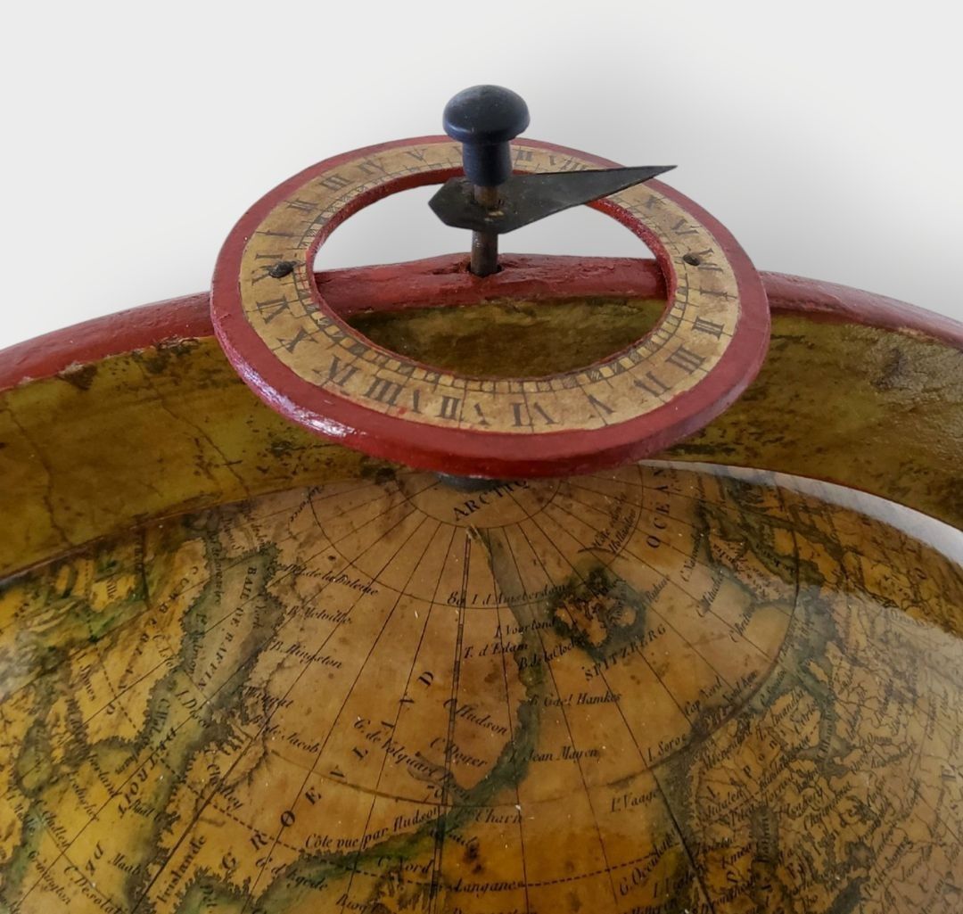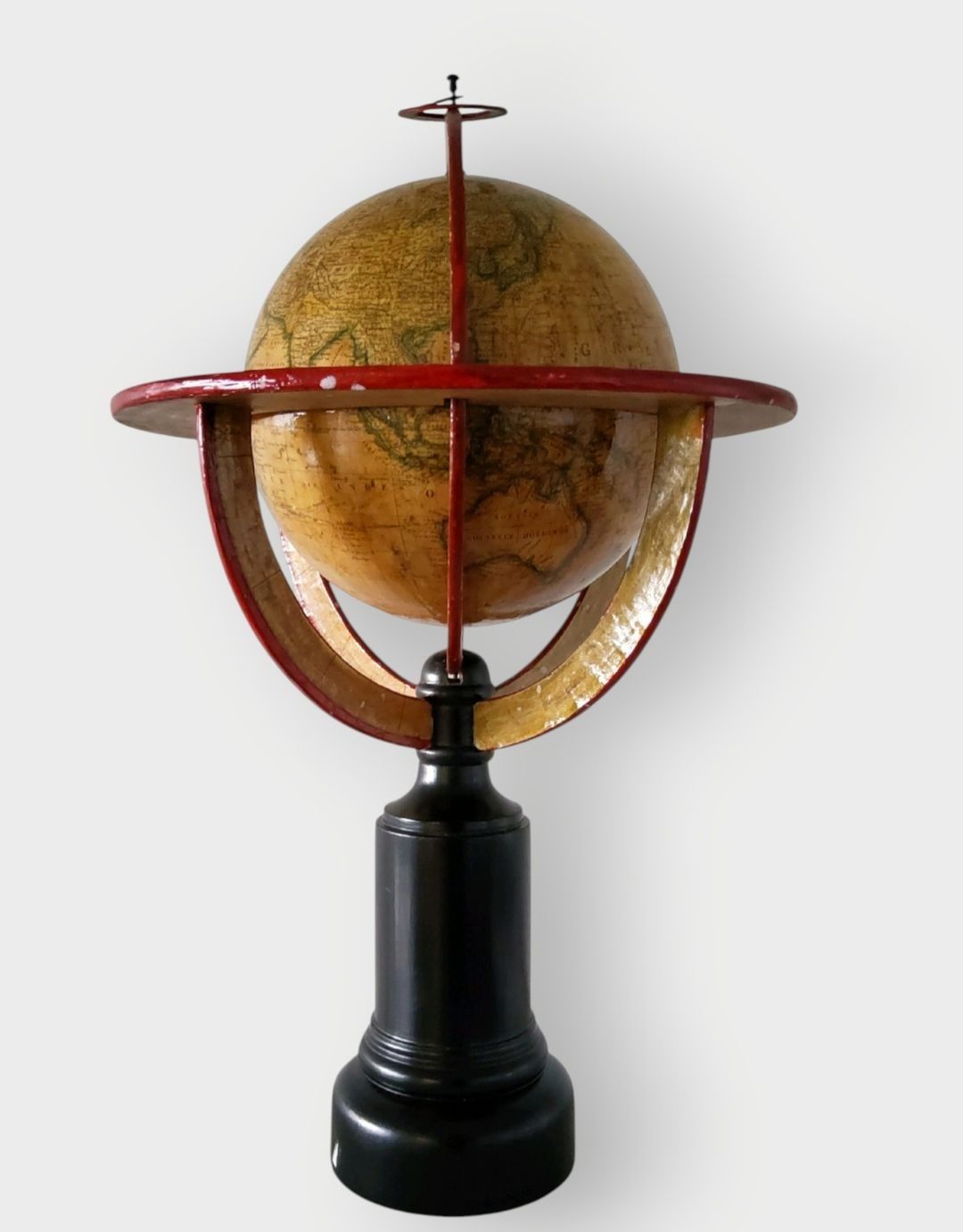 Globe terrestre de table en plâtre et papier lithographié reposant sur un piètement en bois tourné, mouluré et noirci. Table équatoriale zodiacale. Dressé par P. Lapie géographe, colon au Corps royal d’Etat Major, au compas d’Uranie, chez Bastien Ainé, éditeur rue St André des Arts à Paris. Milieu du XIXe siècle. H.70 cm. Diamètre : 42 cm env.(Bon état général, petites déchirures et restaurations) - Ce lot chez vous partout en France métropolitaine à partir de 15,72 € - Ce lot chez vous partout en Europe à partir de 30,00 €