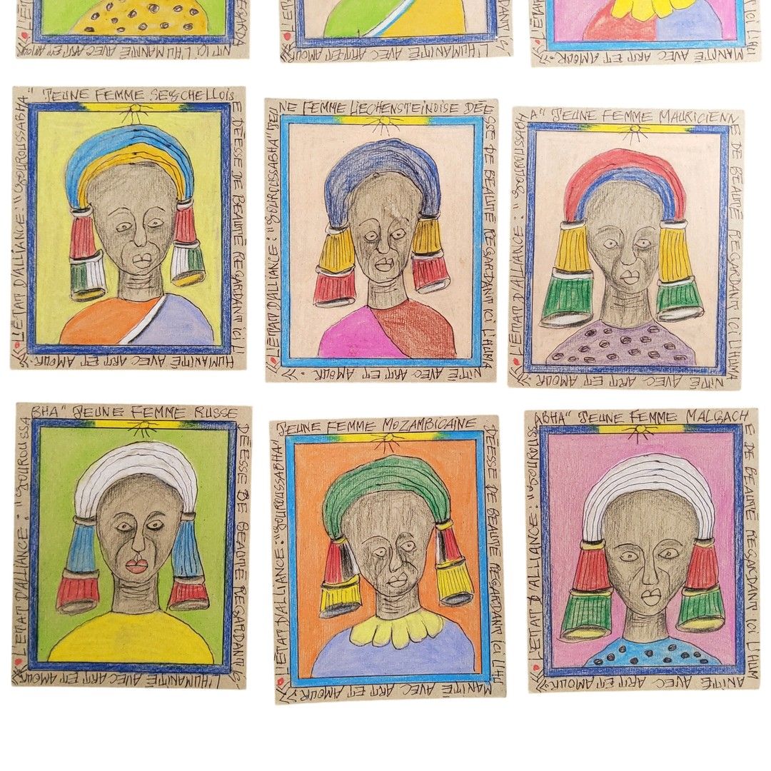 FRÉDÉRIC BRULY BOUABRÉ (1923-2014). L'état d'alliance "Youroussabha", jeune femme déesse de beauté regardant ici l'humanité avec art et amour. Série de 22 dessins à l'encre et crayons de couleur sur papier, signés au revers - Ce lot chez vous partout en France métropolitaine à partir de 12,24 € - Ce lot chez vous partout en Europe à partir de 18,00 €