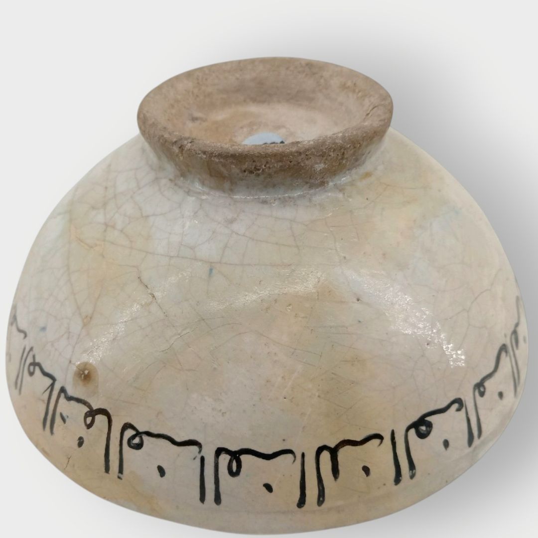 debout, des oiseaux et des mandorles. Une frise de calligraphie cursive noire orne la surface extérieure de la