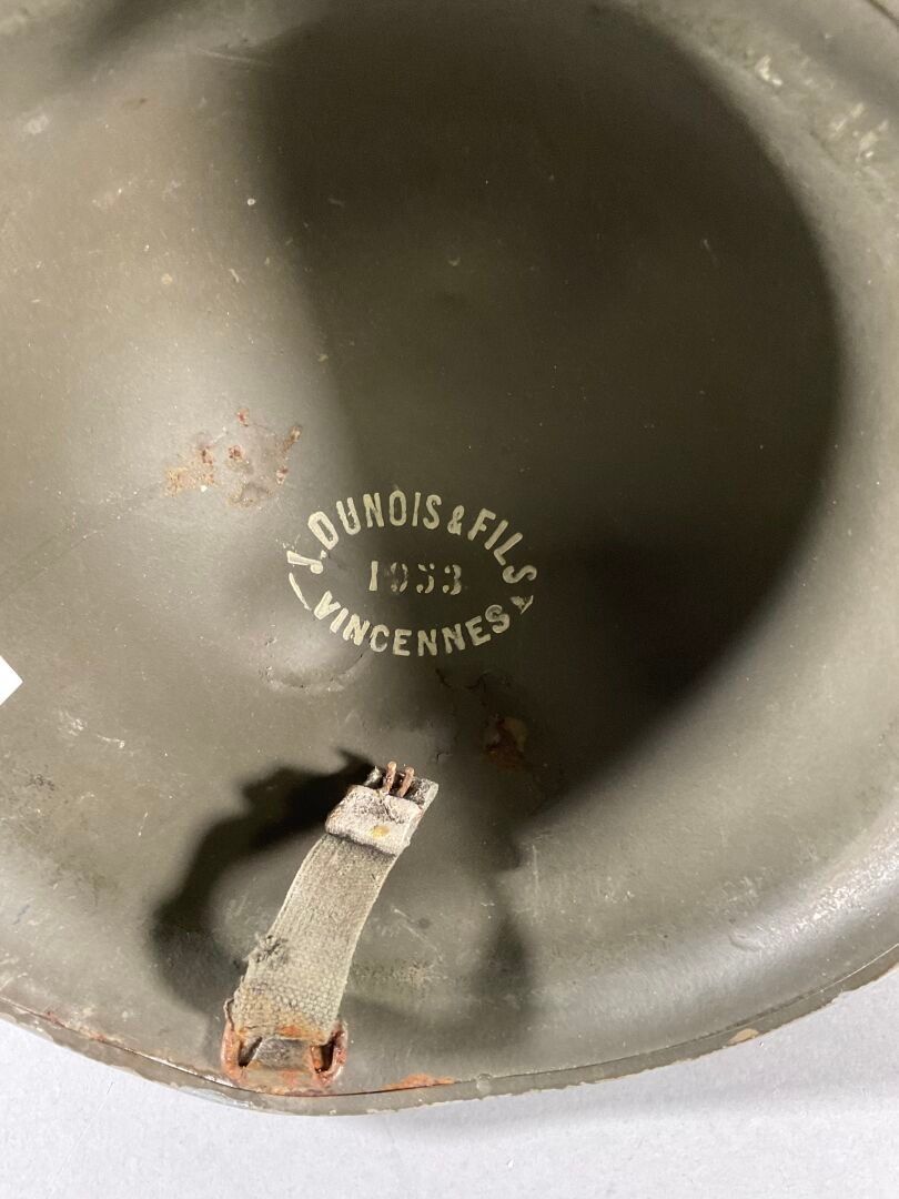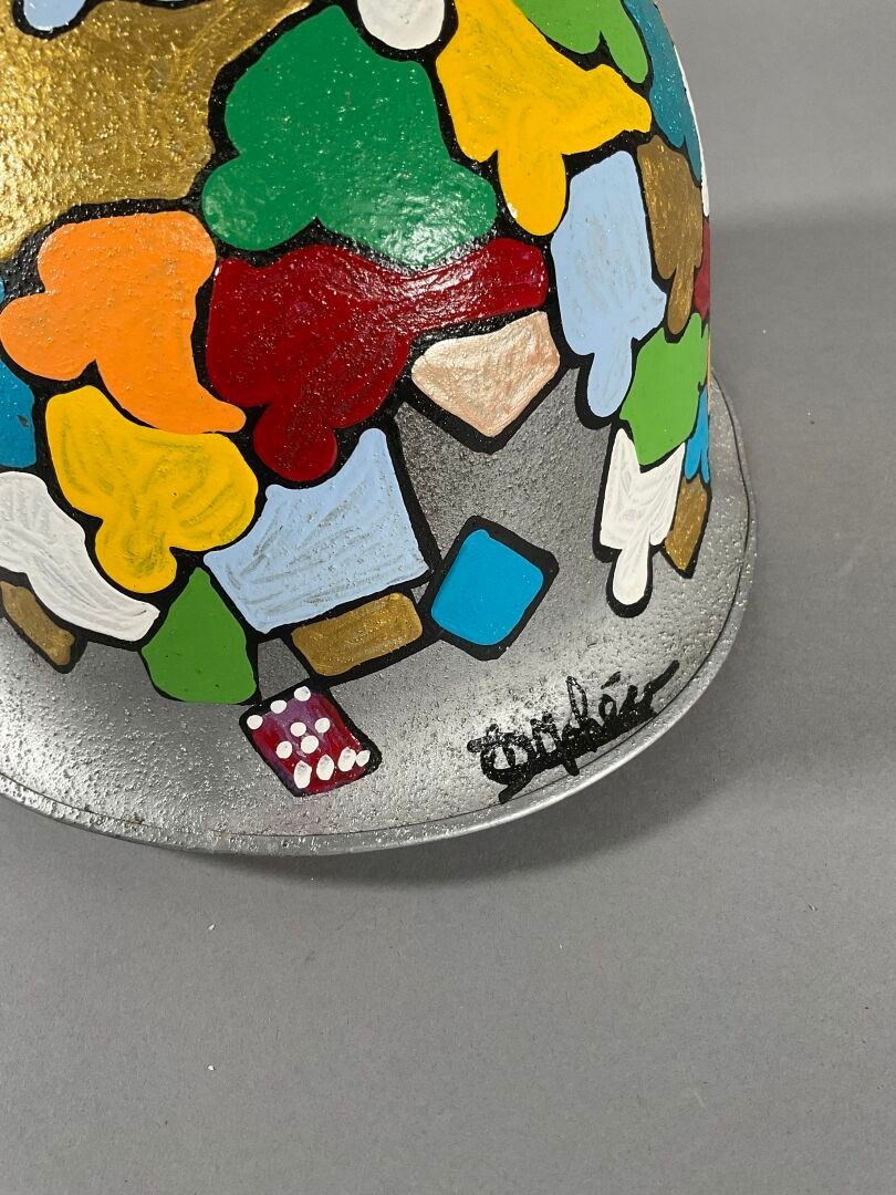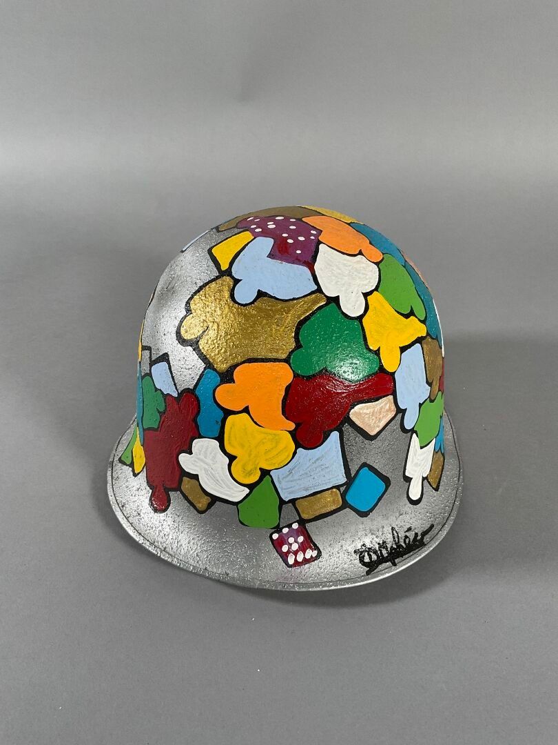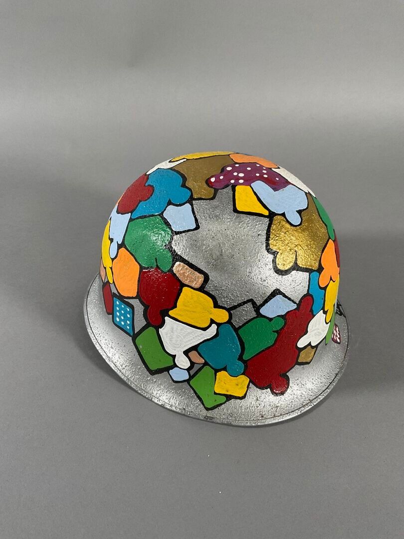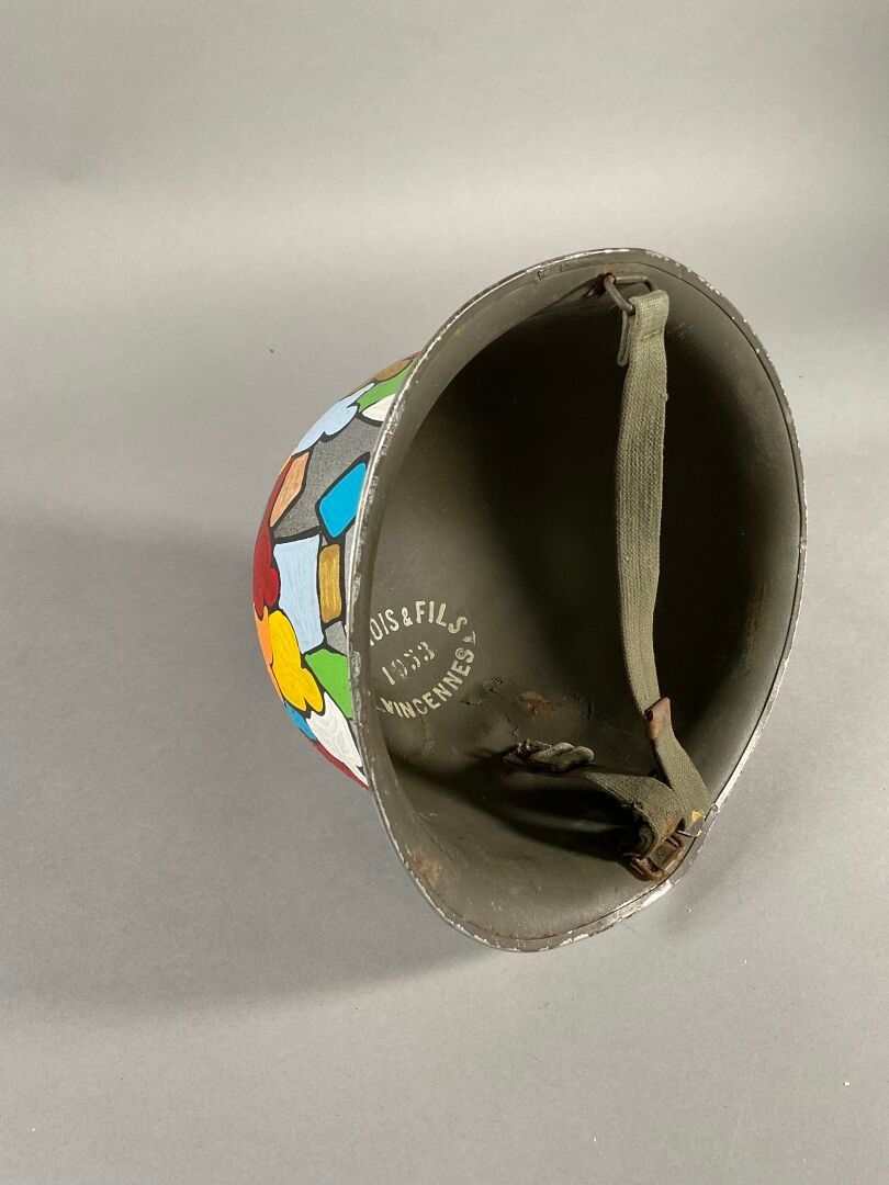 Casque militaire peint à l'acrylique polychrome sur fond argenté, avec inscriptions "J.DUNOIS&FILS/1953/VINCENNE" à l'intérieur. Signé (Chocs)