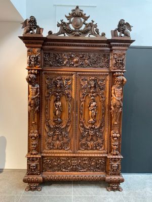 Armoire en bois teinté mouluré et sculpté à riche décor de m…