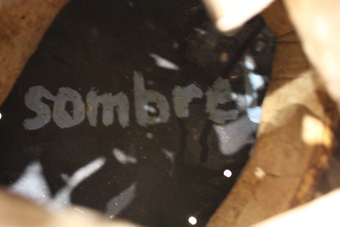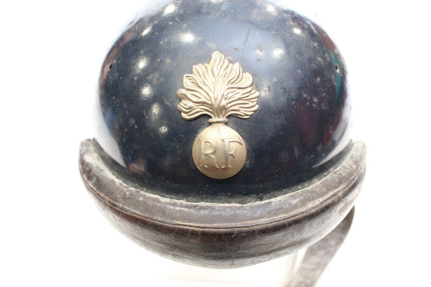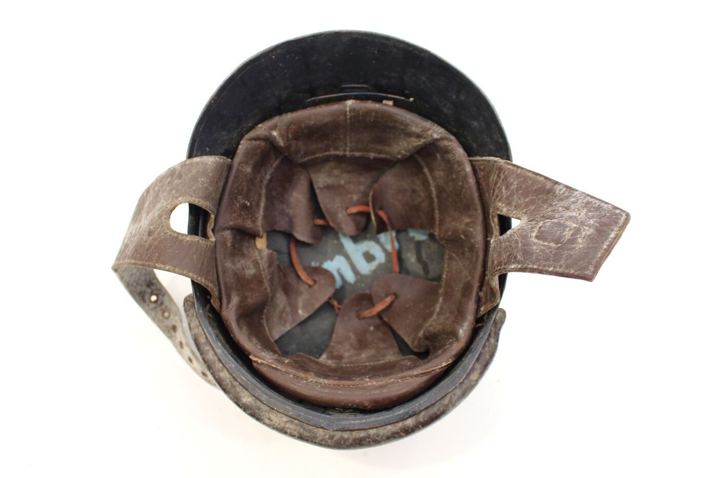 Casque modèle 35 des motocyclistes de la gendarmerie en acier peint en bleu nuit, insigne frontal à la grenade en métal argenté, coiffe intérieure à bavolets en cuir marron. ABE