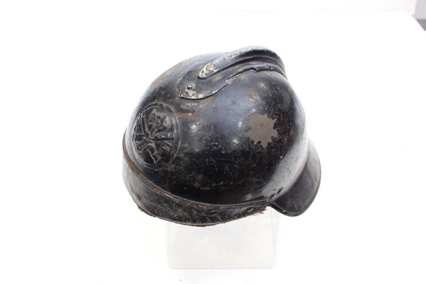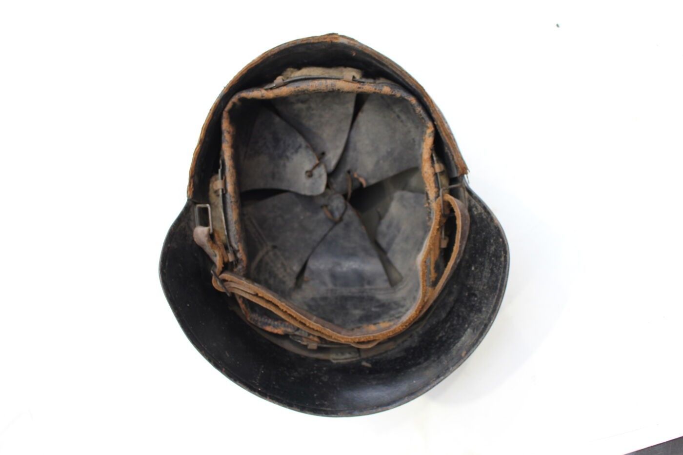 Casque des chars de combat modèle 1923 en acier peint en noir, cimier en aluminium, insigne frontal modèle 1919, coiffe intérieure en cuir noir modèle 1915 2e type, avec sa jugulaire. ABE