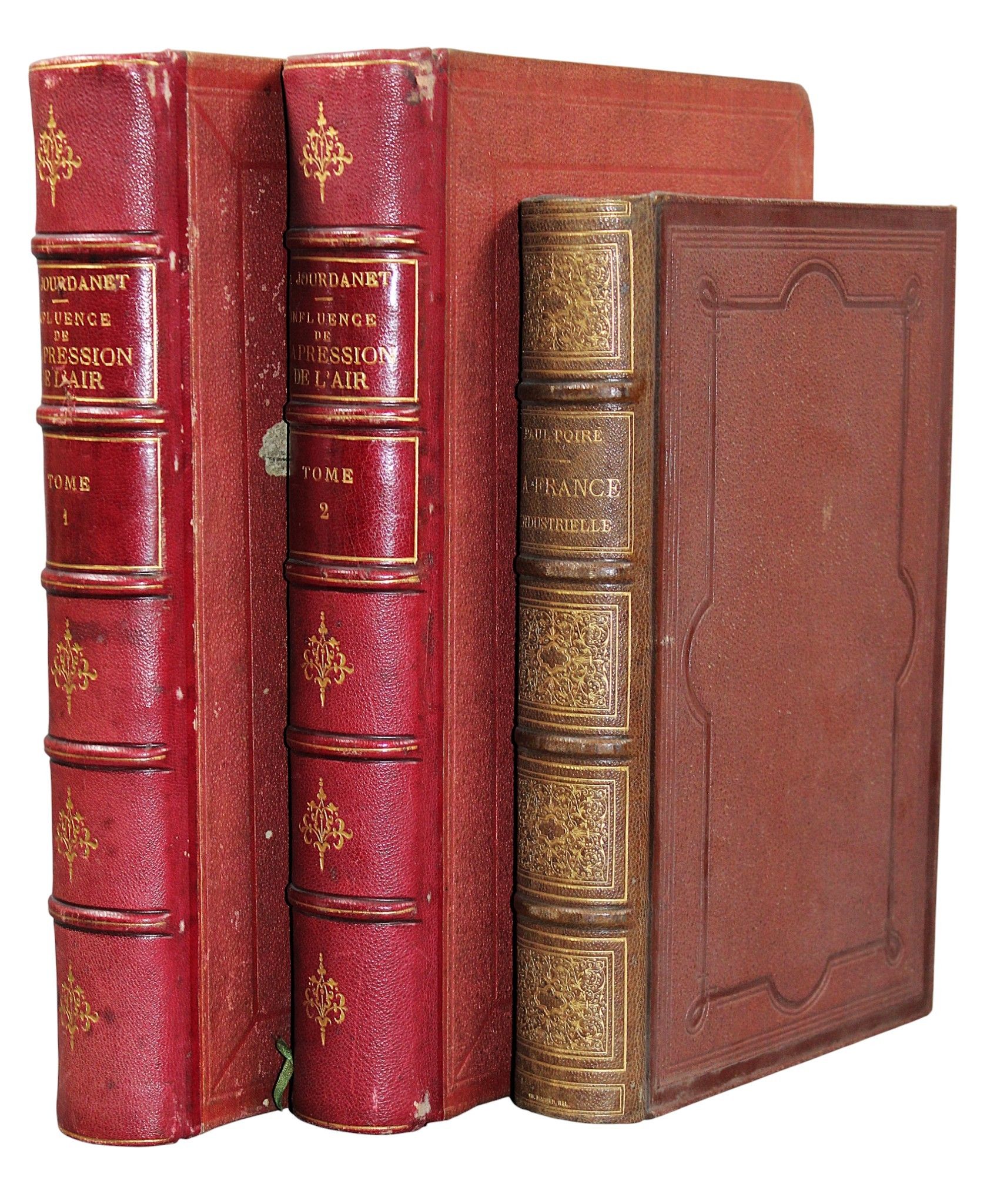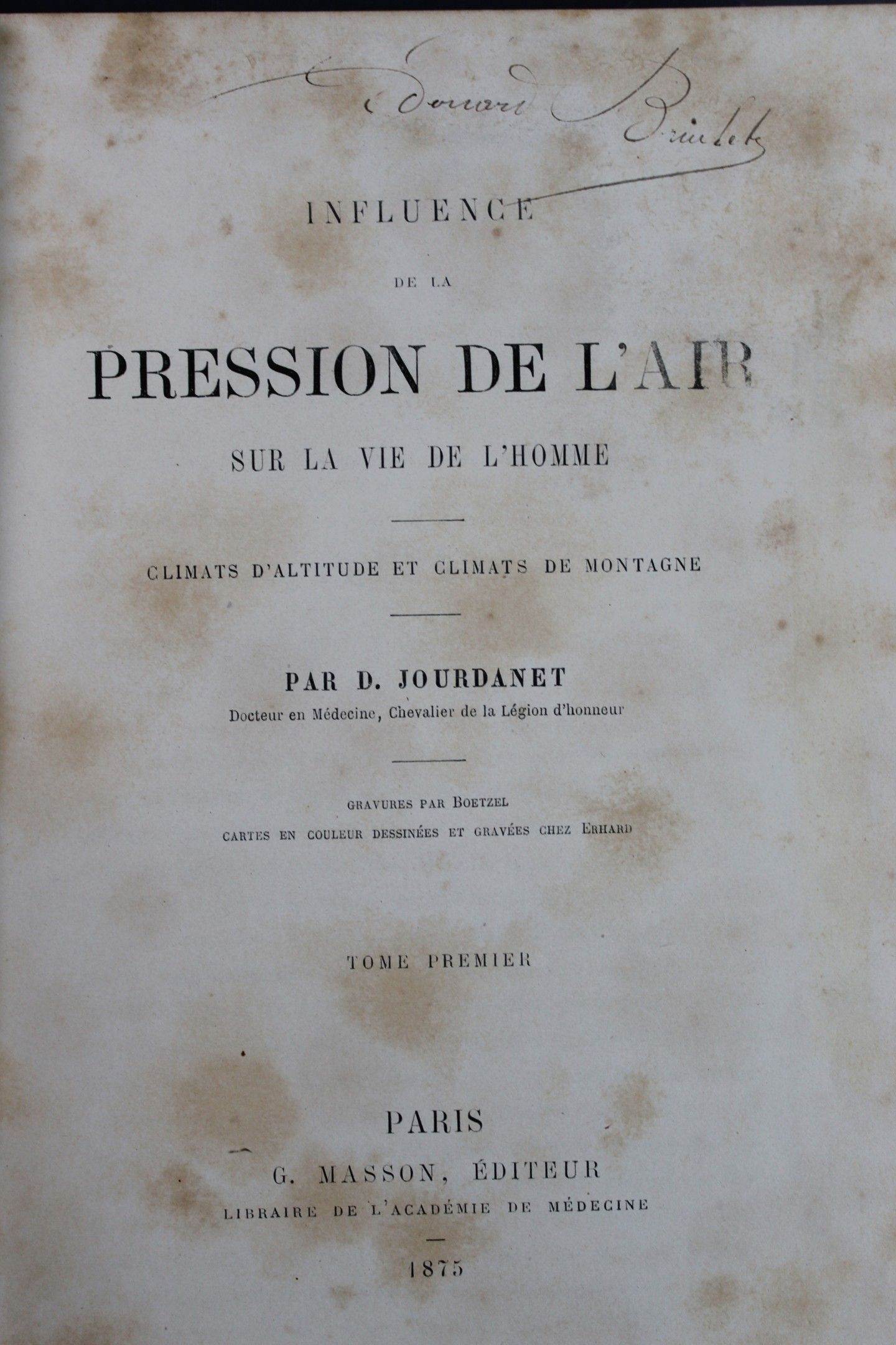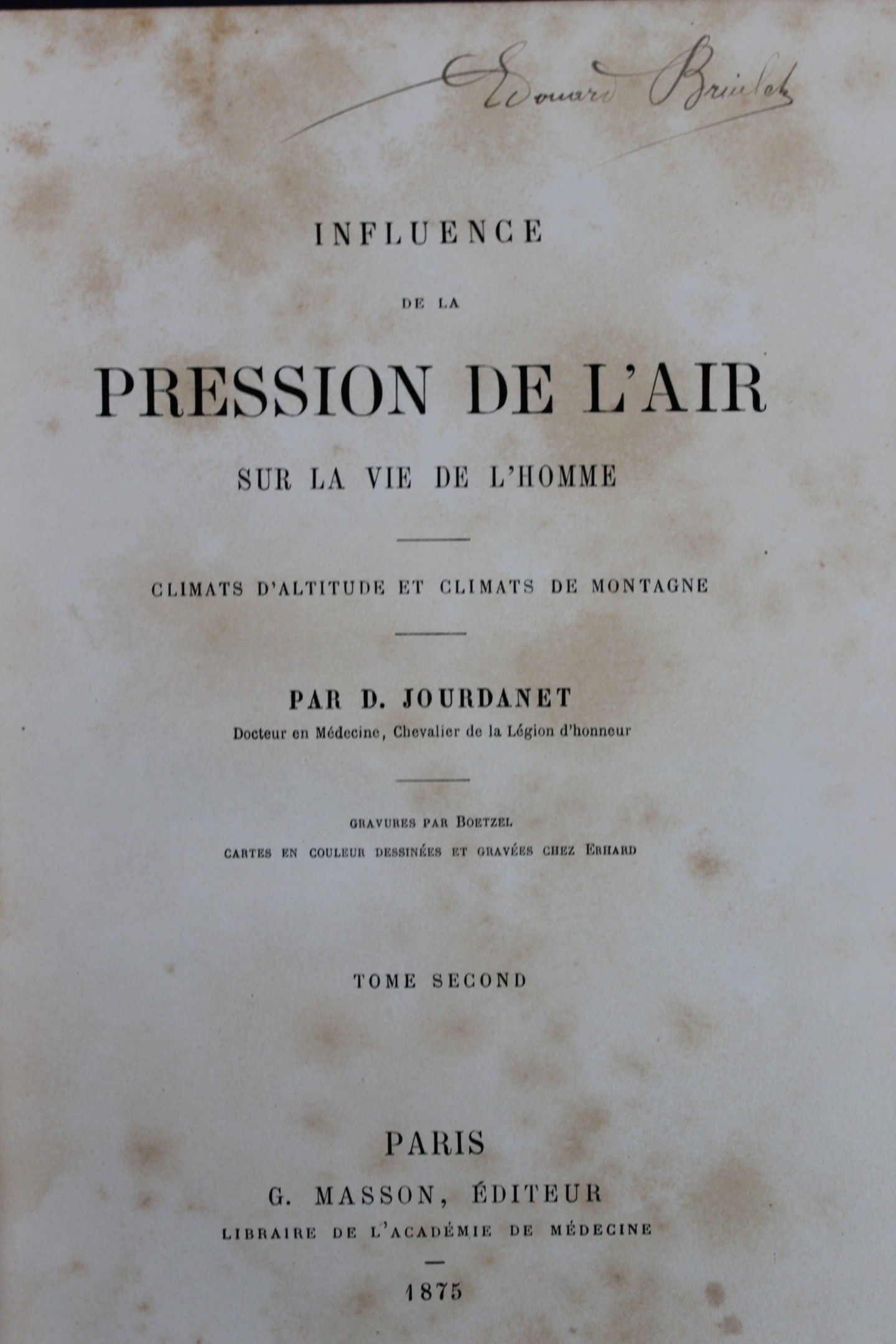 D. JORDANNET, "Influence de la pression de l'air", Masson éditeur, Paris 1875, 2 tomes, reliure en percaline. Joint "La France industrielle" par Paul POIRE, librairie Hachette, 1873.