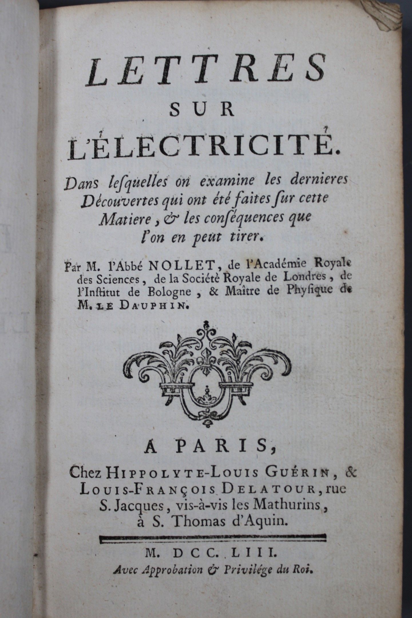 Abbé NOLLET, "Lettres sur l'électricité", chez Guérin et Del…