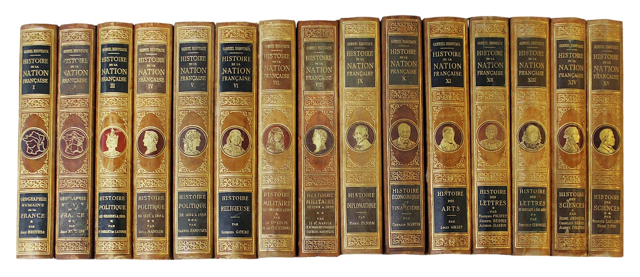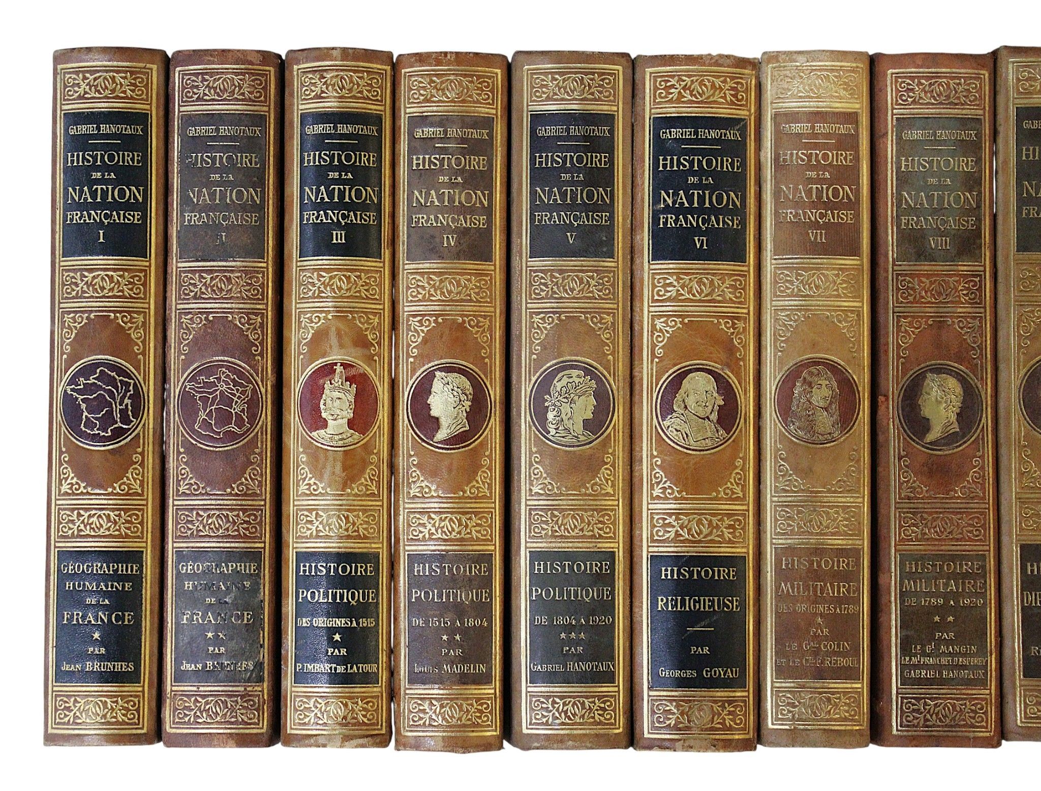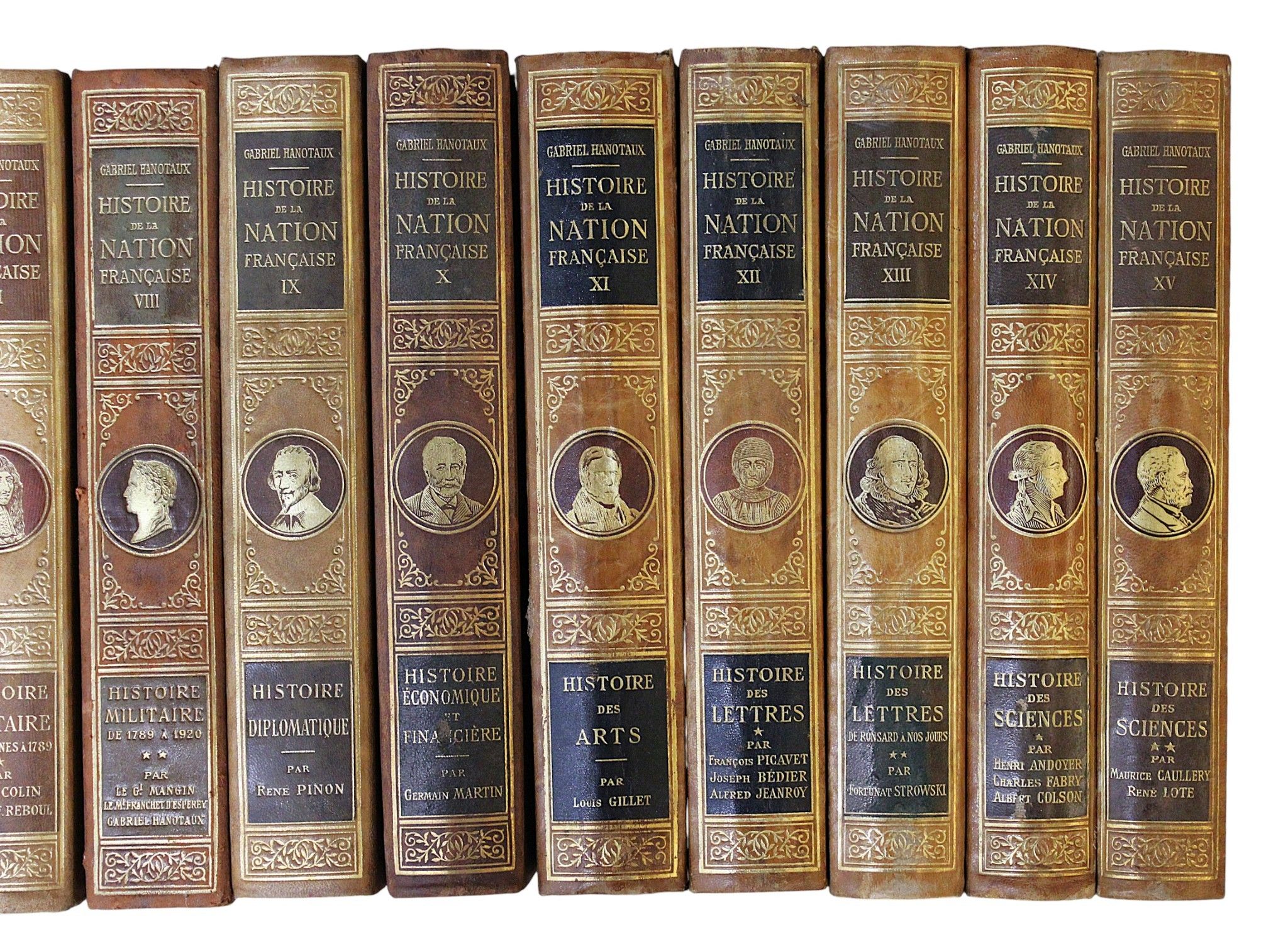 Gabriel HANOTAUX, "Histoire de la nation française", 15 tomes, plans et cartes, nombreuses illustrations, 1921, Librairie Plon, in-4, reliures demi-veau glacé havane à coins.