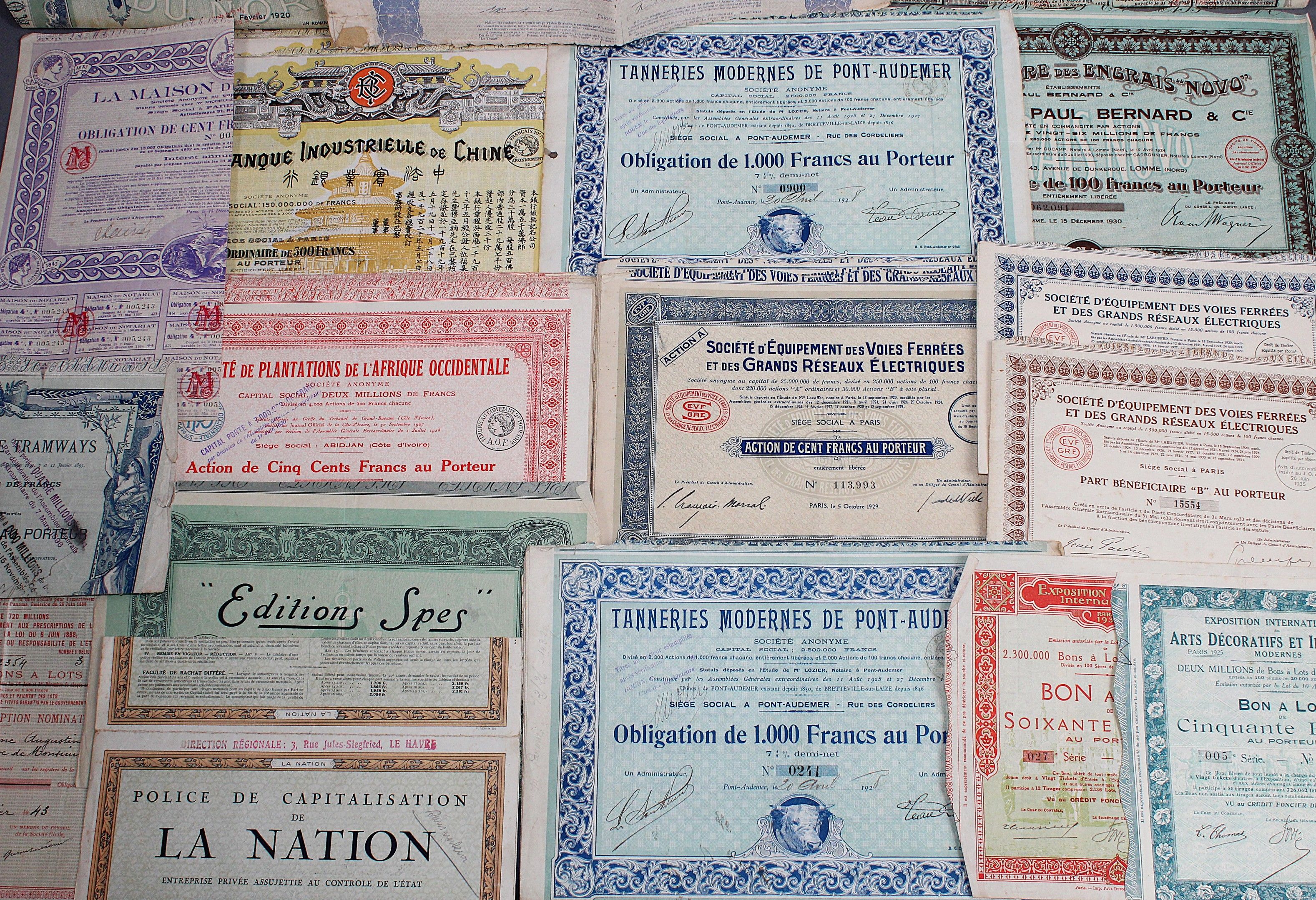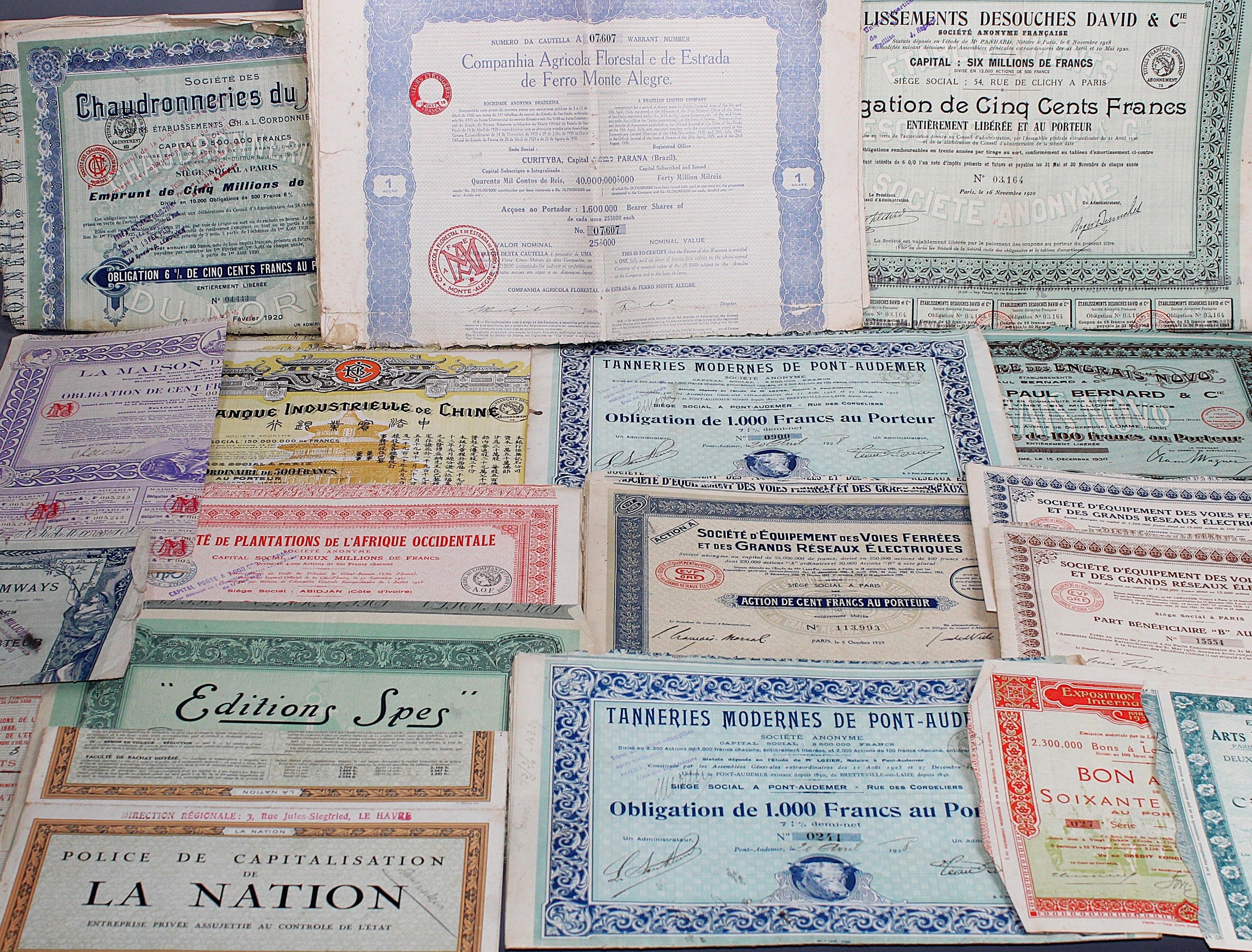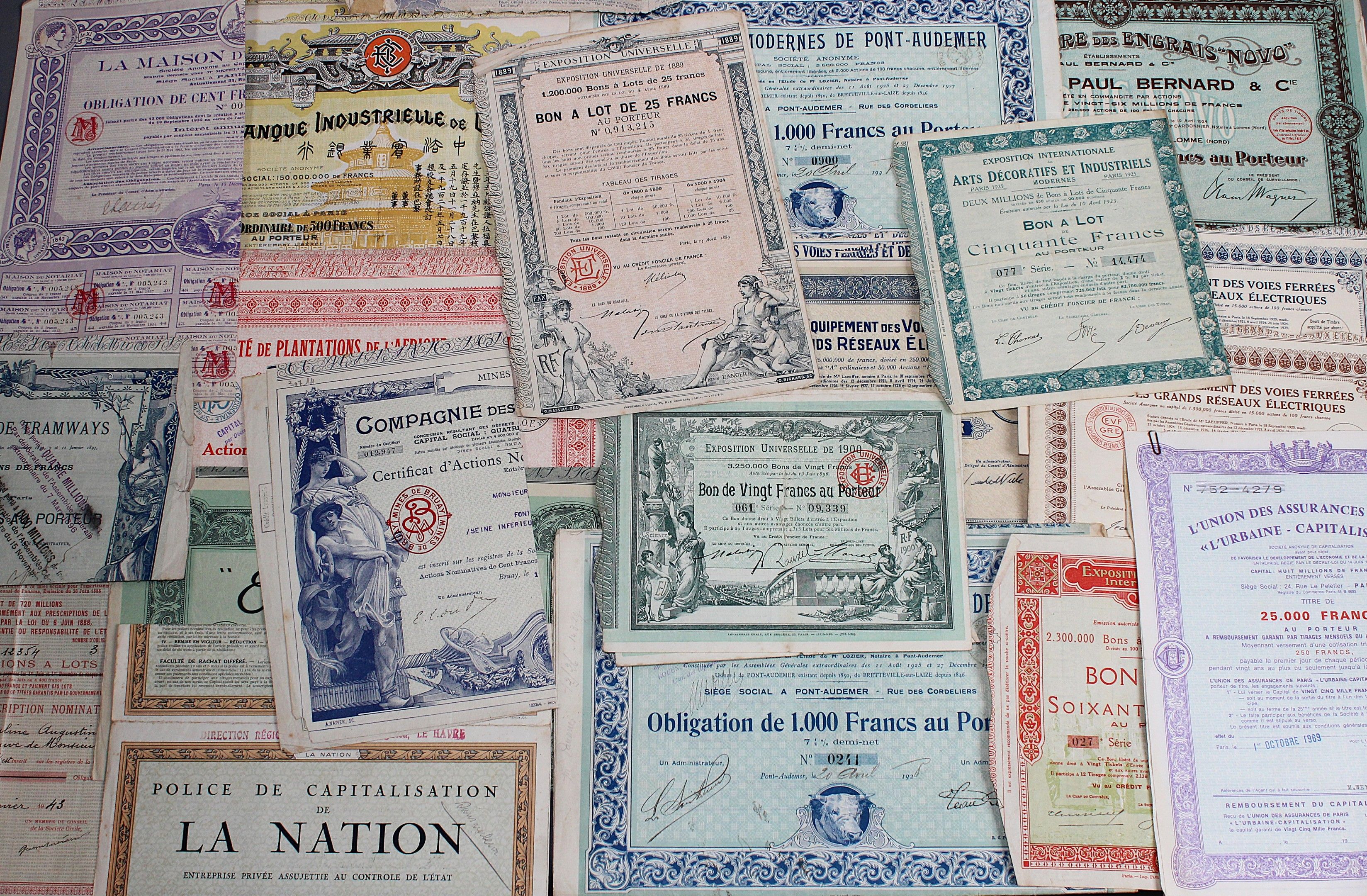 Important ensemble d’ACTIONS dont BANQUE INDUSTRIELLE DE CHINE x 7, TANNERIES MODERNES DE PONT-AUDEMER x 6, ETABLISSEMENTS DESOUCHES DAVID & Cie x 8, SOCIETE D’EQUIPEMENT DES VOIES FERREES ET DES GRANDS RESEAUX ELECTRIQUES x 16, EXPOSITION COLONIALE INTERNATIONALE DE 1931 x 2, CANAL DE PANAMA, COMPAGNIE LYONNAISE DE TRAMWAYS, LA SEQUANAISE CAPITALISATION, EXPOSITION UNIVERSELLE DE 1900 x 2, EXPOSITION UNIVERSELLE DE 1889 x 4, EDITIONS SPES, CHAUDRONNERIES DU NORD x 20, CONSERVES VEUVE AUBIN-SALLES, SA D’INSTALLATIONS MECANIQUES ET AGRICOLES, CREDIT FONCIER DU BRESIL, VOIES FERREES ECONOMIQUES, FRANCO CANADIENNE DE PARTICIPATIONS, SOCIETE DE PLANTATIONS DE L’AFRIQUE OCCIDENTALE x 55…