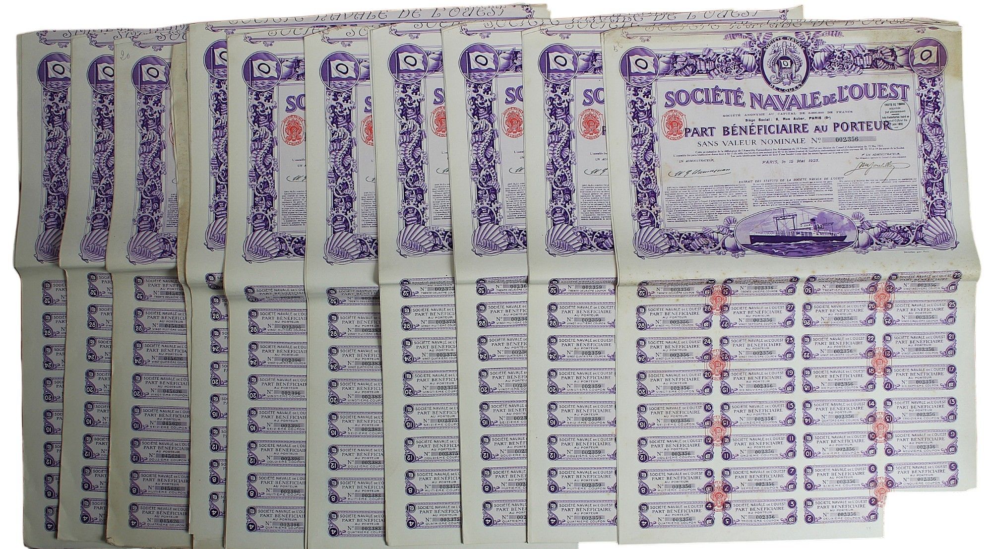 Ensemble comprenant environ 65 ACTIONS de la SOCIETE NAVALE DE L'OUEST, années 1920.