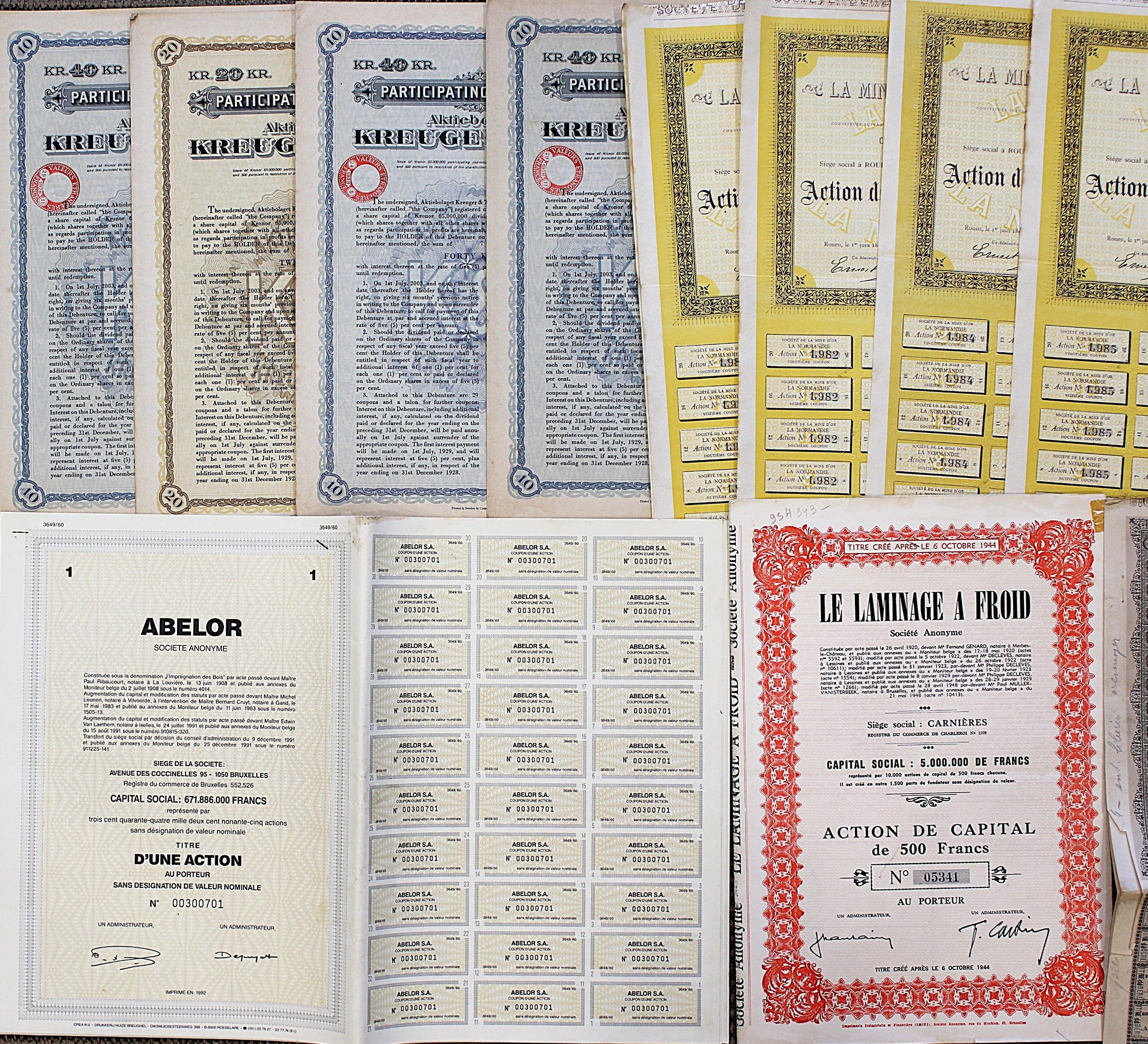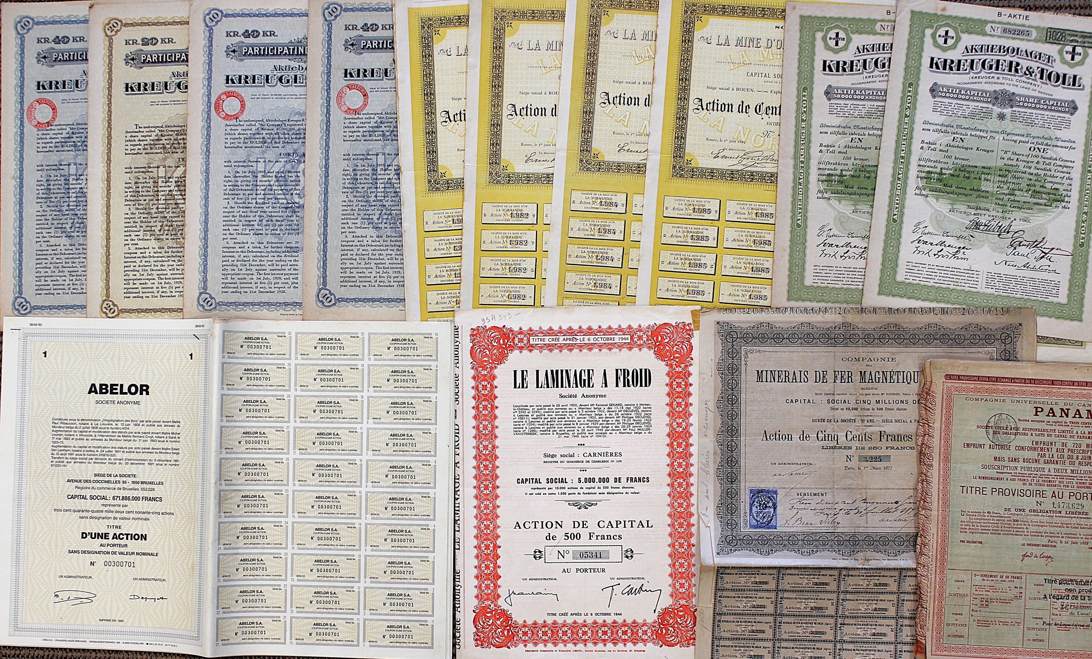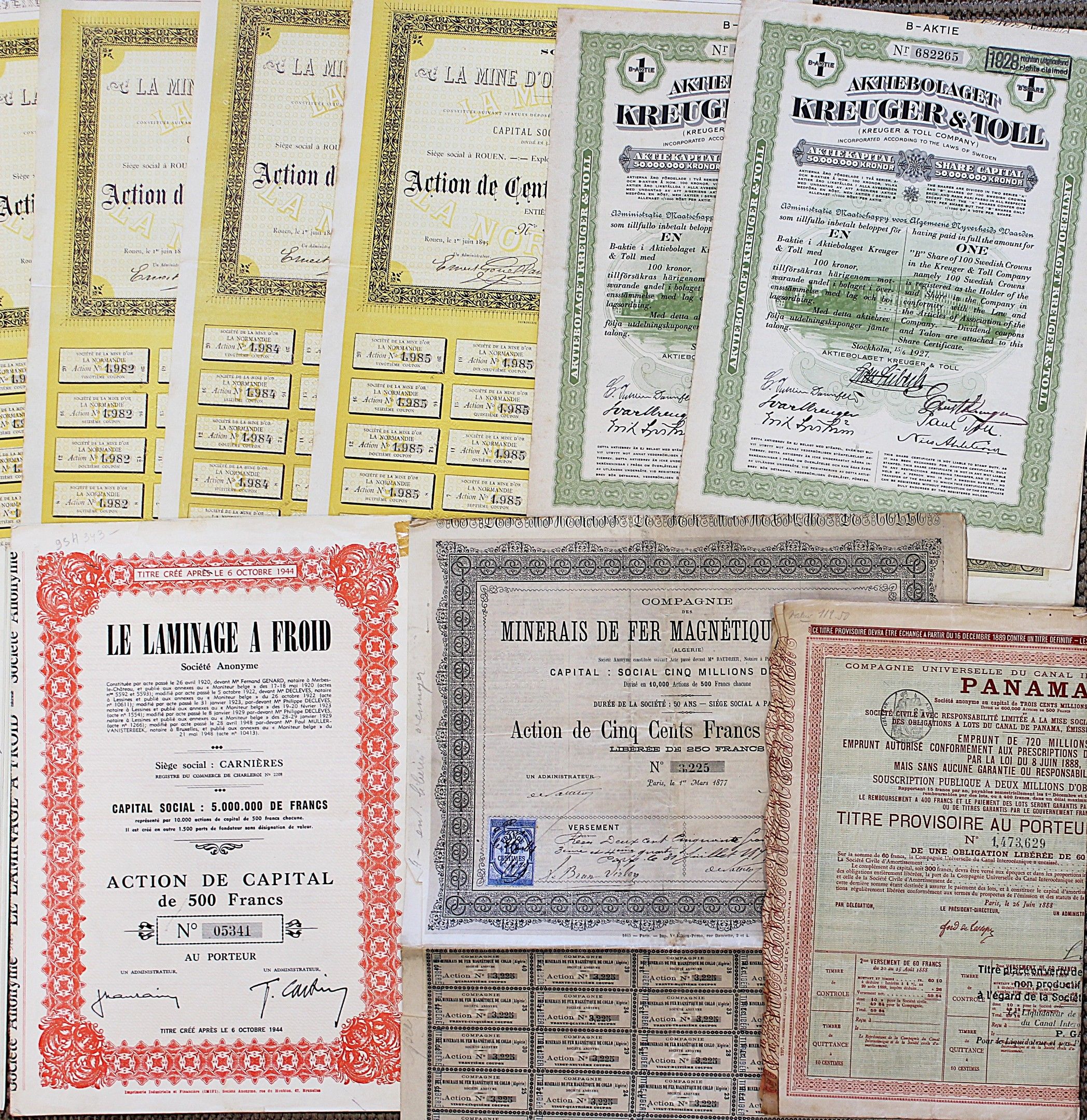 Petit ensemble d'ACTIONS dont MENERAI DE FER MAGNETIQUE DE COLLO x 4, LE LAMINAGE A FROID x 4, CANAL DE PANAMA x 6, ABELOR x 9, LA MINE D'OR LA NORMANDIE x 5NOUVELISTE DE ROUEN ET PATRIOTE DE NORMANDIE.