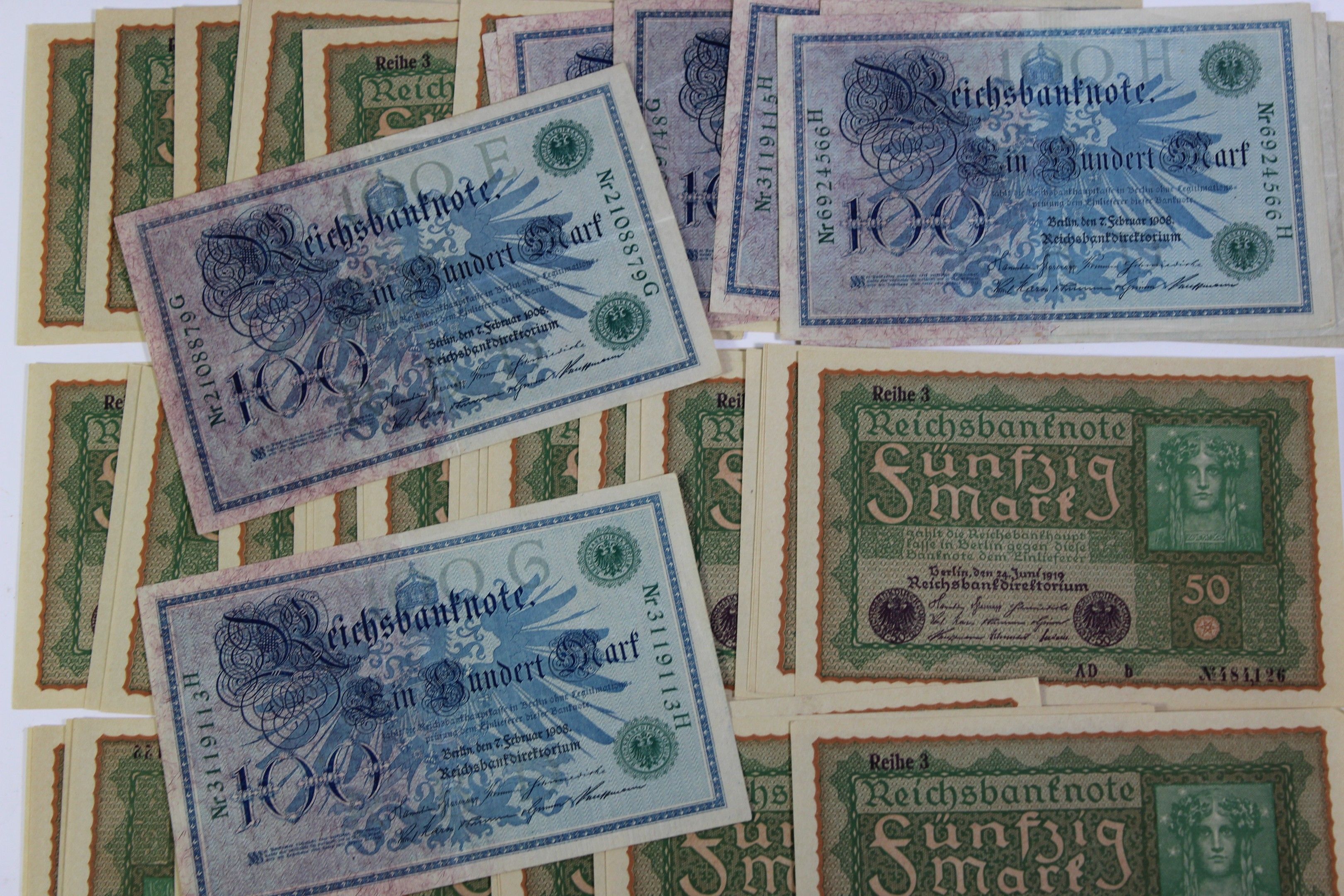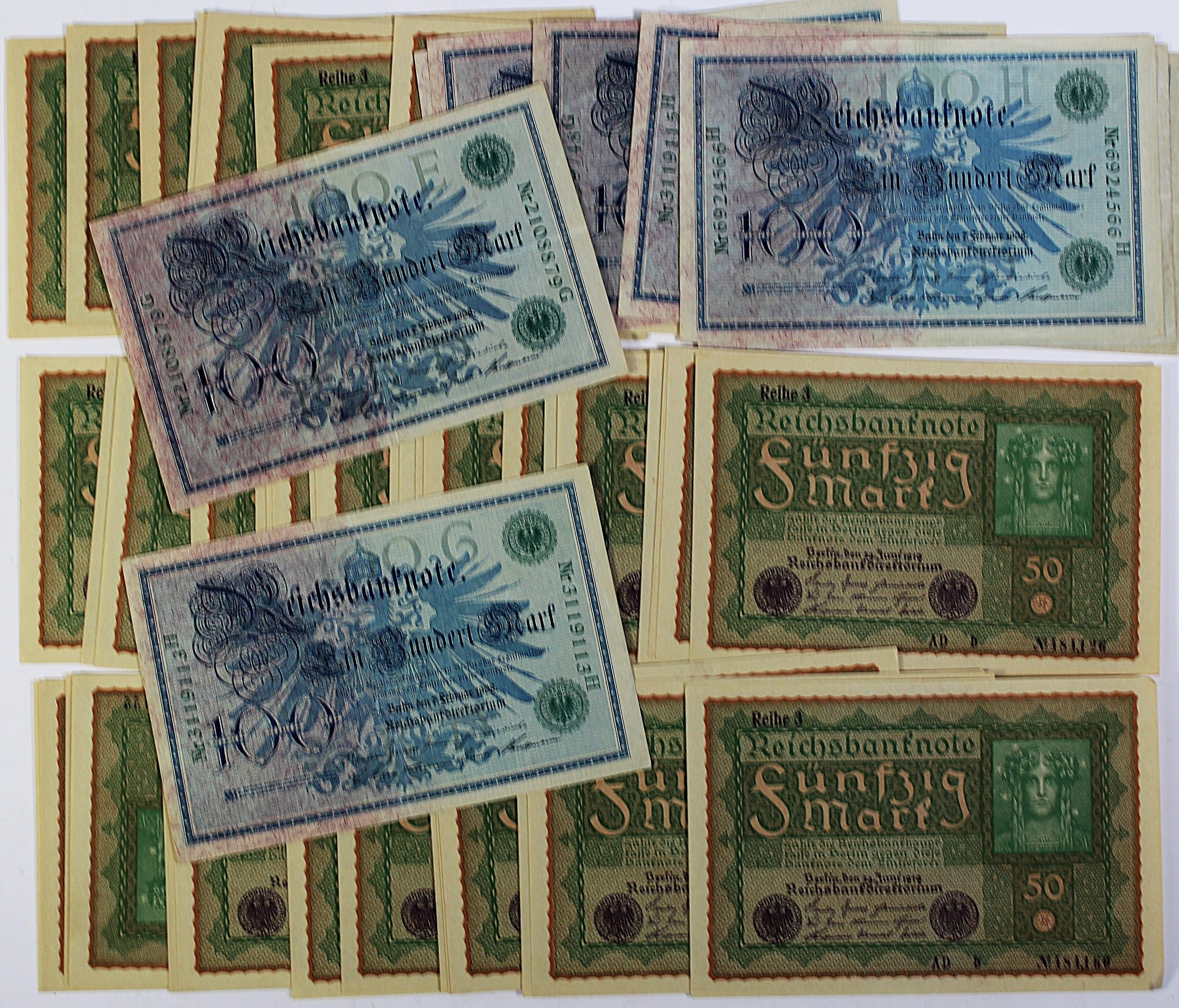 ALLEMAGNE - Ensemble de BILLETS DE BANQUE comprenant : 50 DM 1919 x 45 en état neuf et 100 DM 1908 x 15.