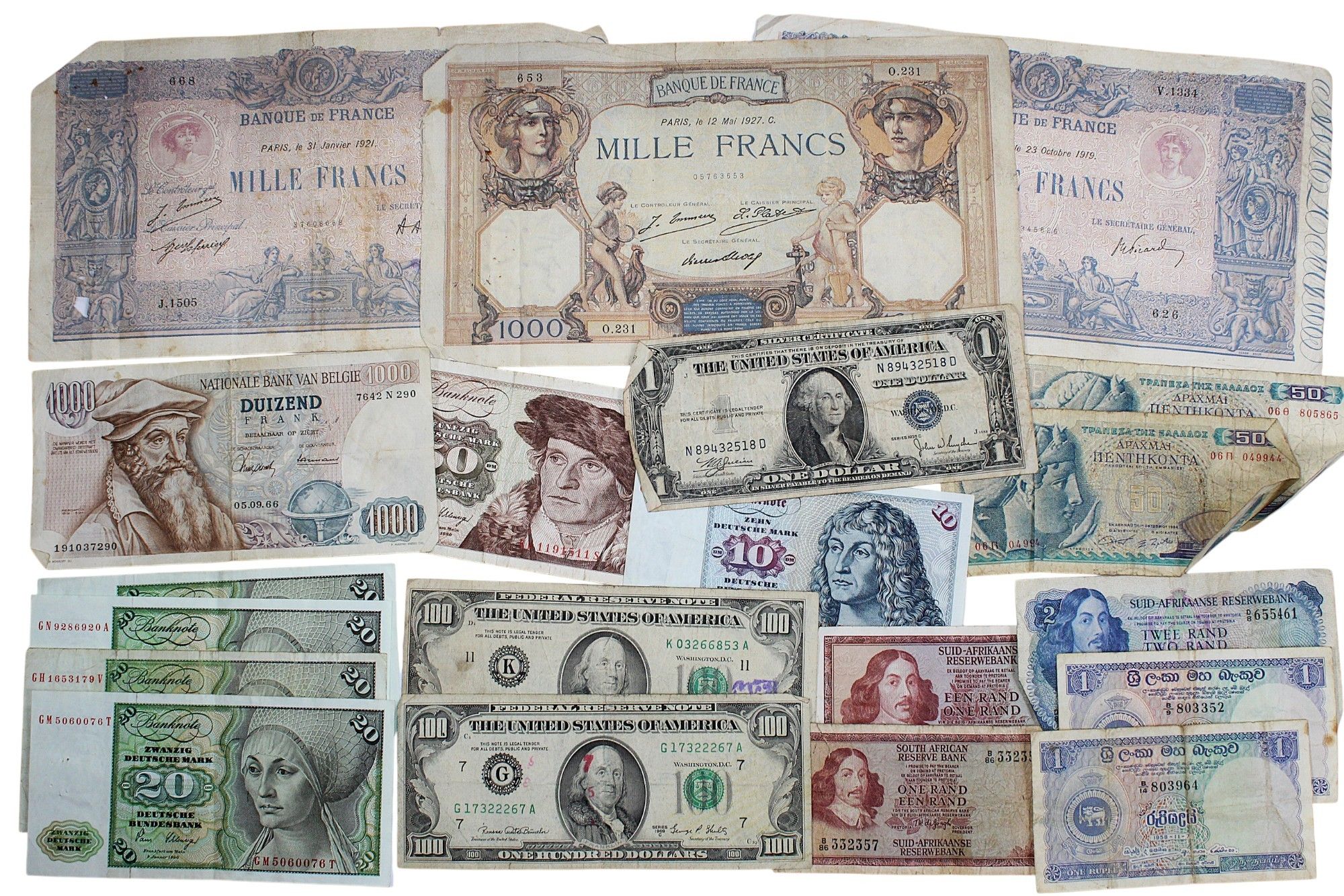 Ensemble de BILLETS DE BANQUE ETRANGERS dont ALLEMAGNE, ETATS-UNIS, AFRIQUE DU SUD, GRECE, BELGIQUE.