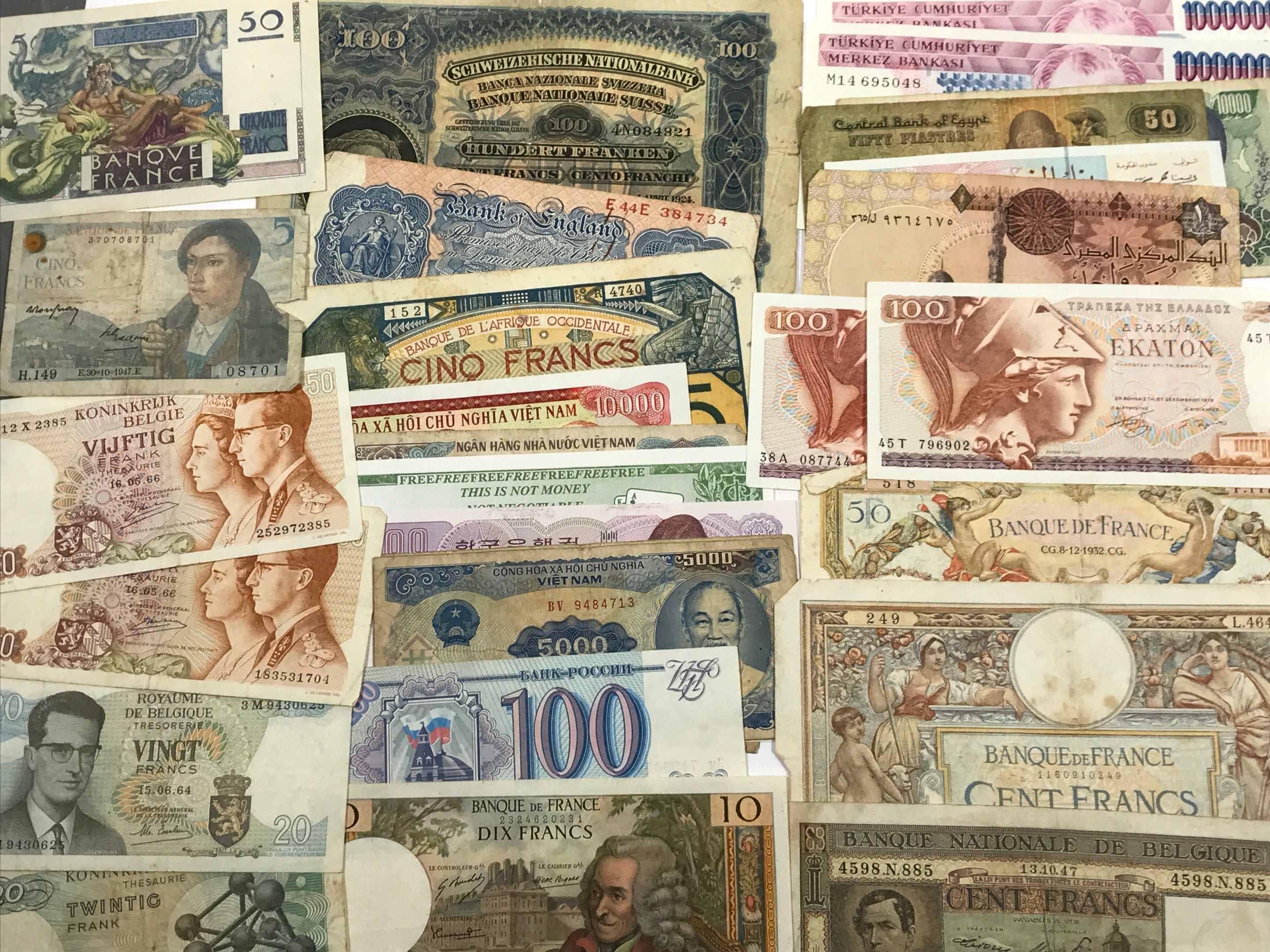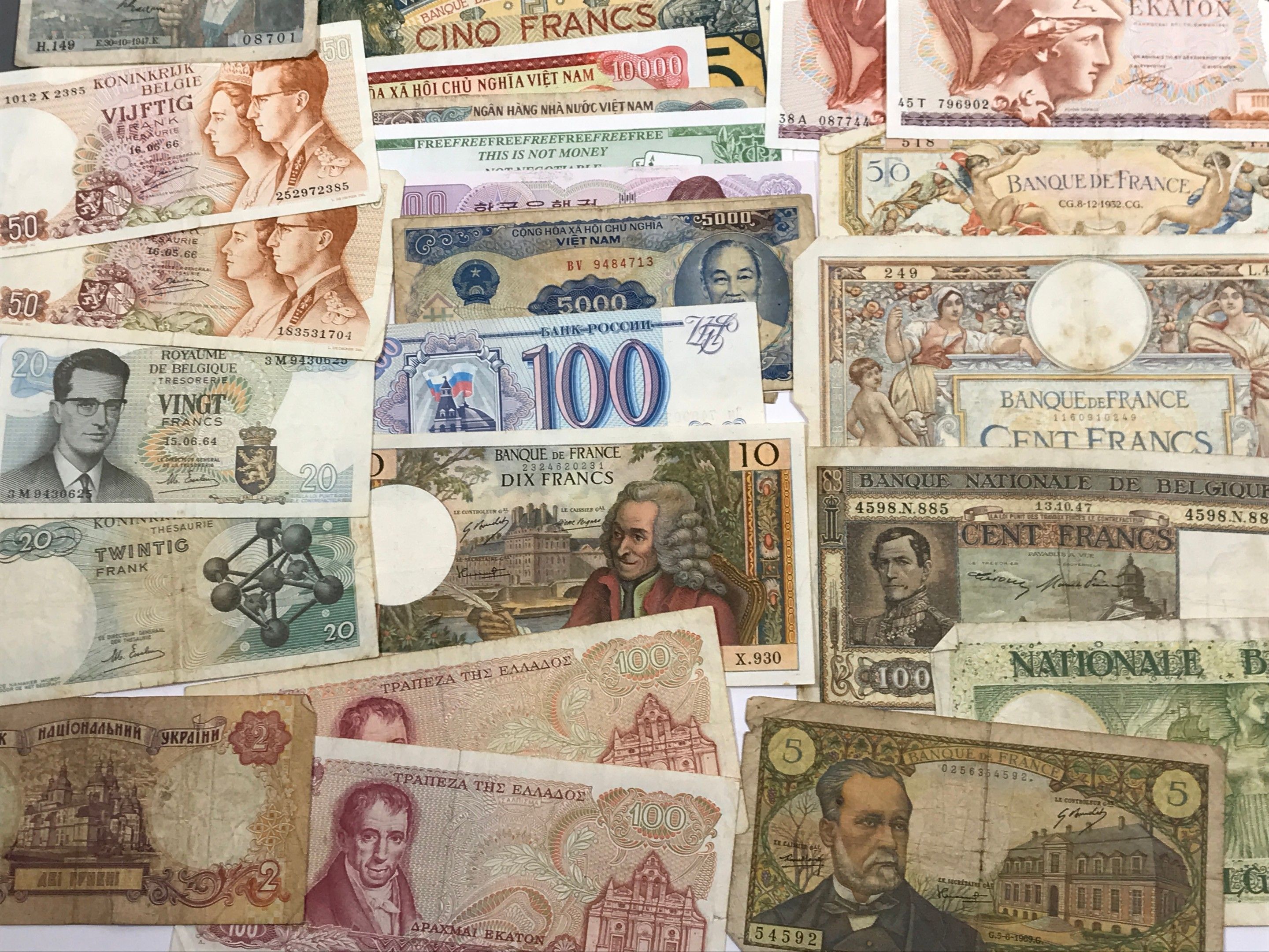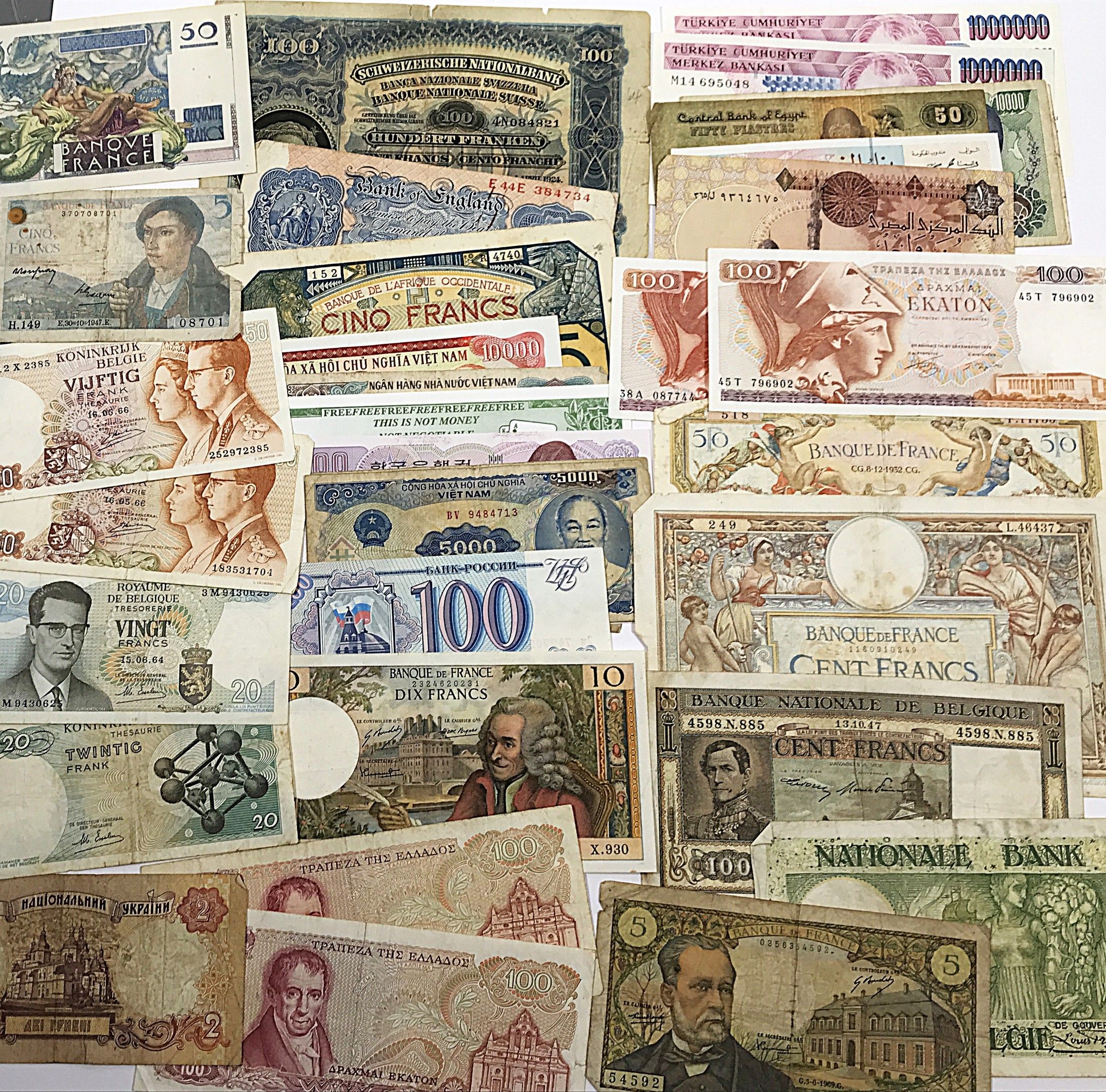 Ensemble comprenant environ 42 BILLETS DE BANQUE FRANCAIS et ETRANGERS dont FRANCE, BELGIQUE, GRECE, EGYPTE, TURQUIE, VIET-NAM, COREE, AFRIQUE OCCIDENTALE, GUERNESEY, GRANDE-BRETAGNE…