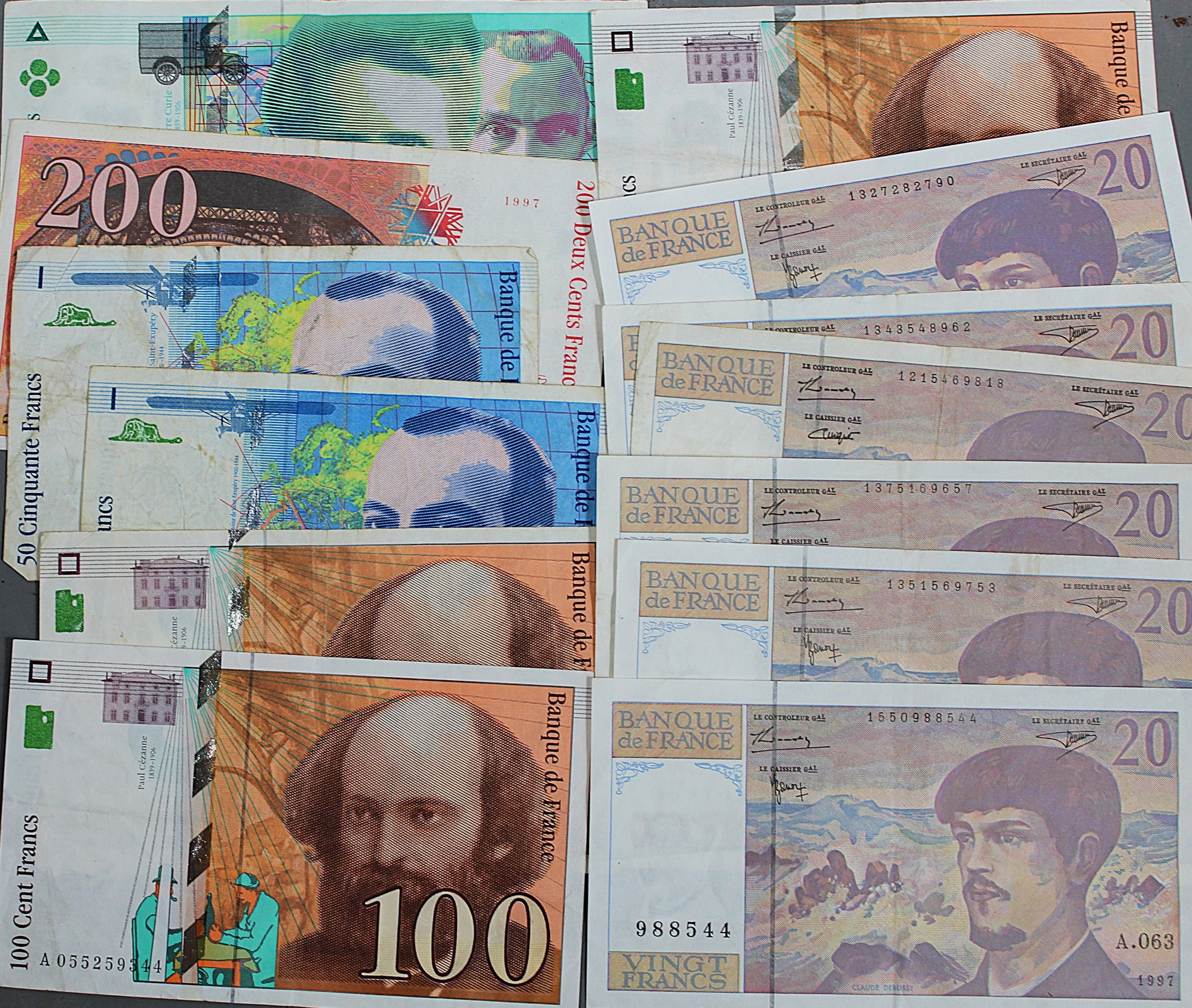 Ensemble de BILLETS DE BANQUE comprenant : 20 FRANCS DEBUSSY x 50 FRANCS SAINT-EXUPERY x 2, 100 FRANCS SEZANNE x 3, 200 FRANCS EIFFEL et 500 FRANCS CURIE.