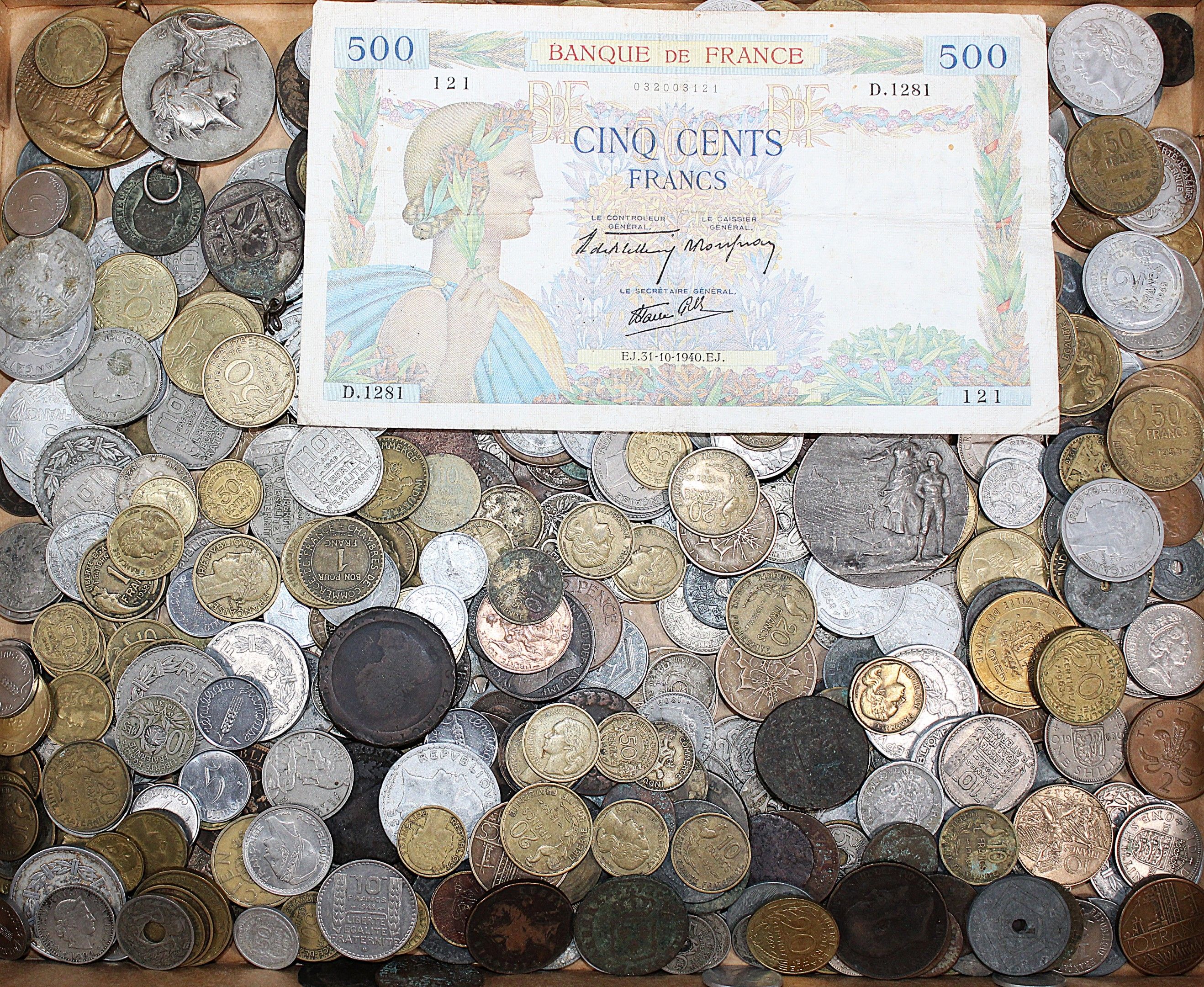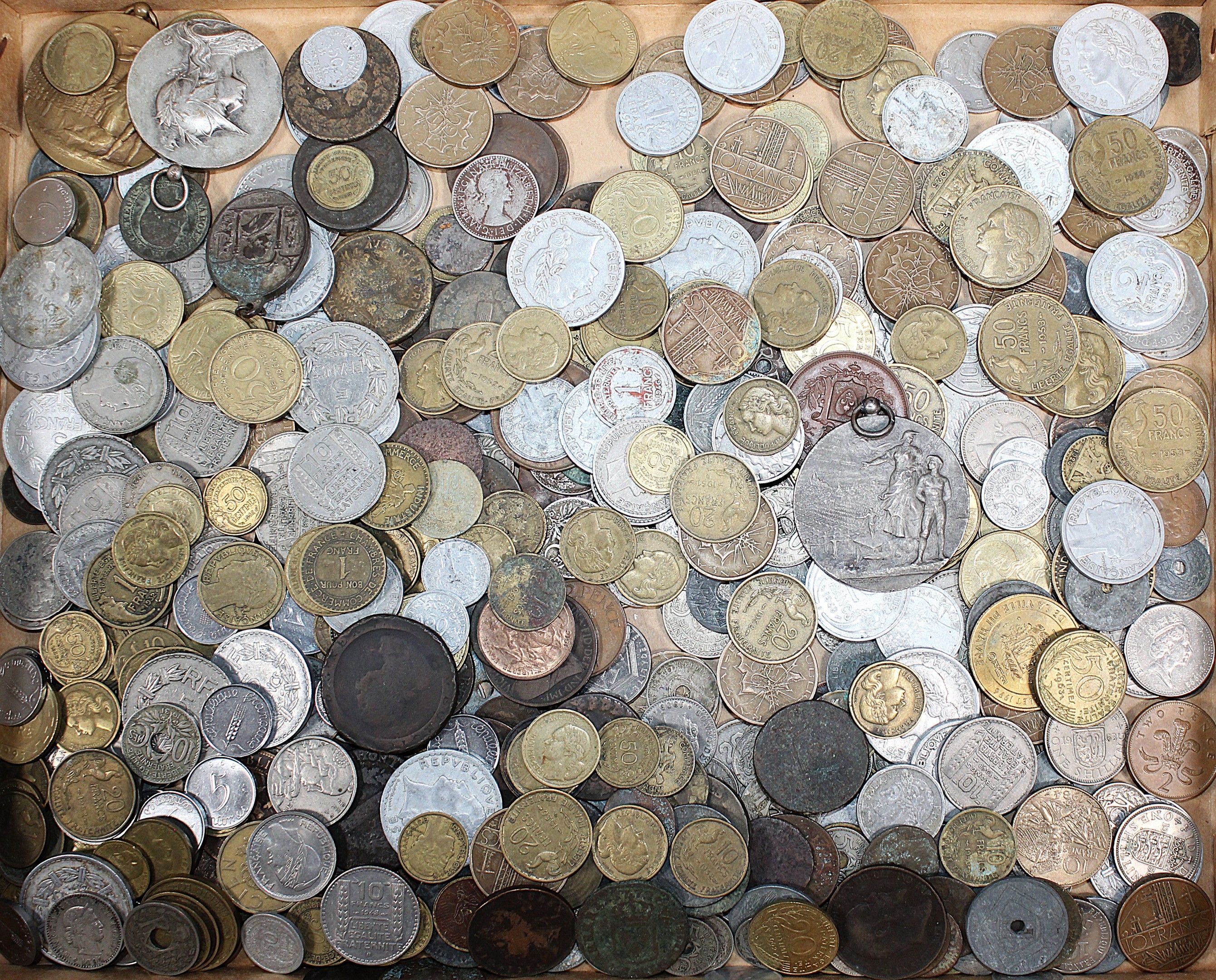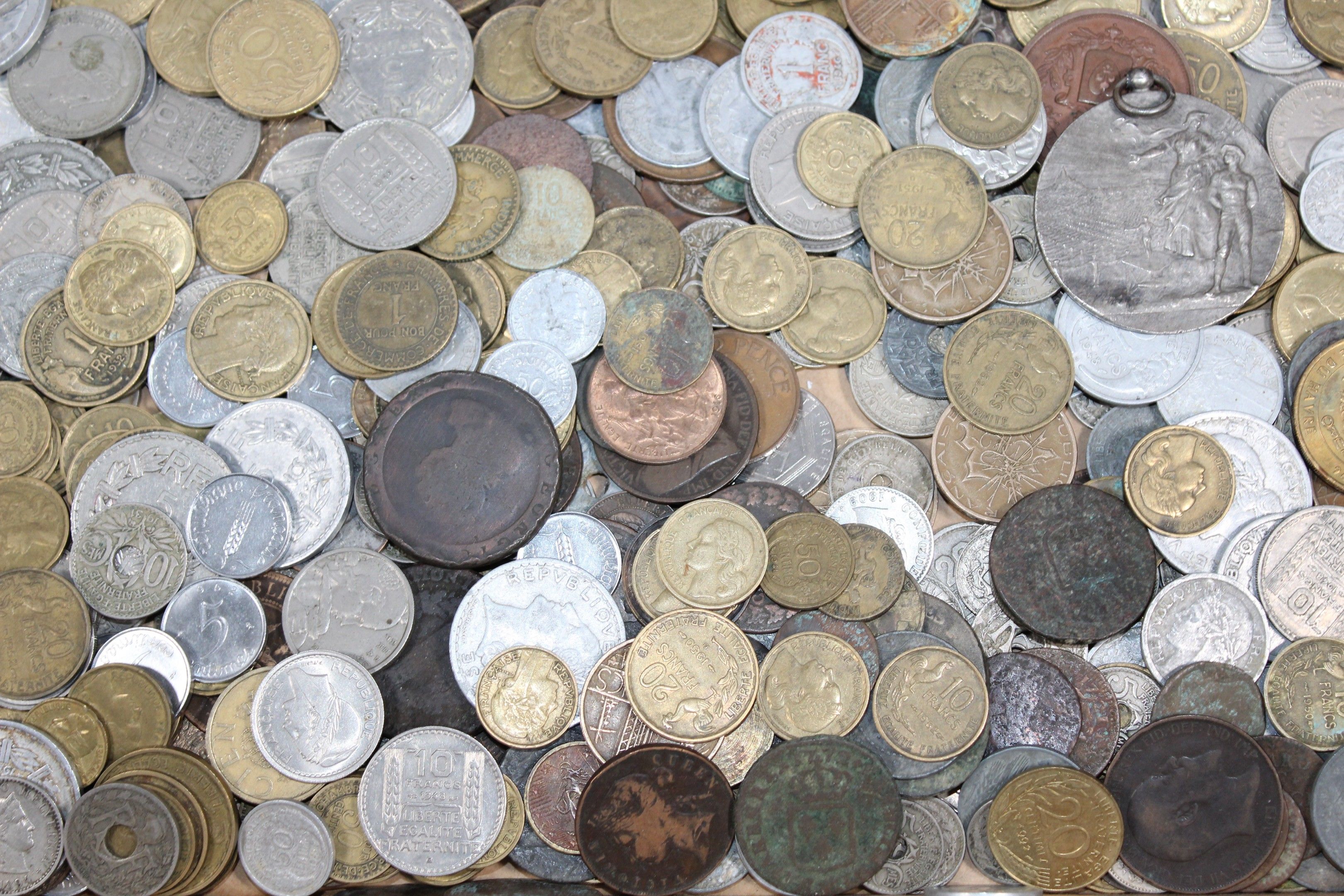 Ensemble de PIECES DE MONNAIE FRANCAISES, mojoritairement XXème, quelques pièces XVIIIème et médailles de tables diverses, poids : 2,6 kgs.