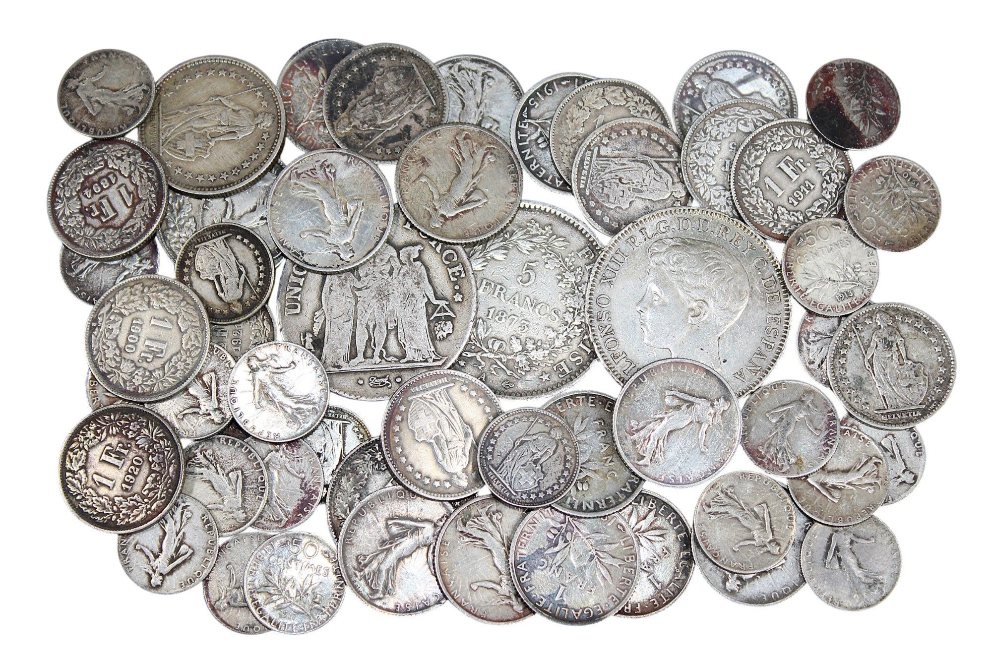 Ensemble de PIECES en argent comprenant : 5 FRANCS HERCULE AN 8 L, ESPAGNE - 1 PESO ALPHONSE XIII 1897, 5 FRANCS HERCULE 1873, 0,50 FRANC SEMEUSE x 19, 1 FRANC SEMEUSE x 12 , SUISSE - 1/2 FRANCS x 5, SUISSE - 1 FRANC x 11 et SUISSE - 2 FRANCS x 3, poids : environ 278 grammes.