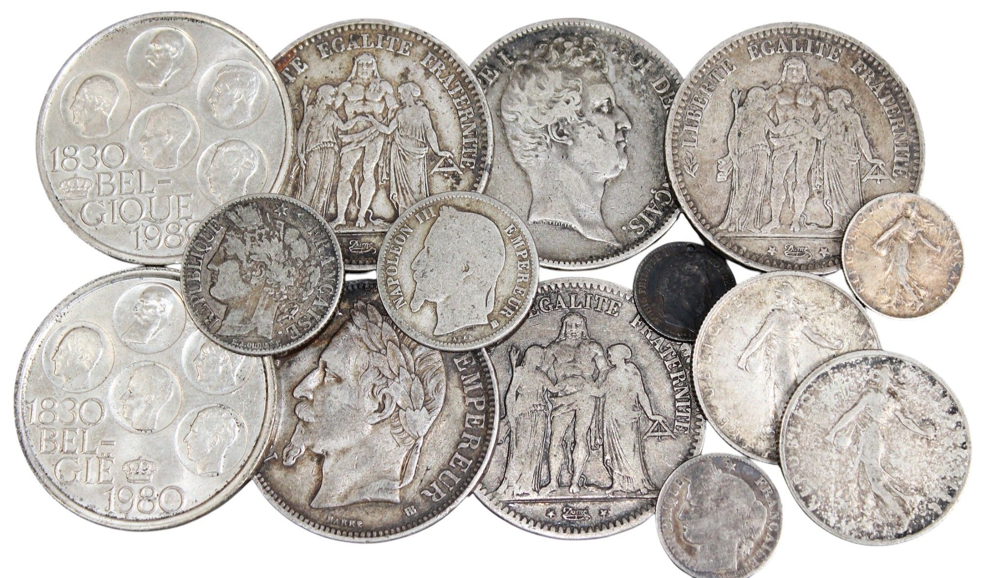 Ensemble de PIECES en argent comprenant : 5 FRANCS HERCULE 1848 (revers usé), 5 FRANCS LOUIS-PILIPPE I 1850 (revers usé), 5 FRANCS NAPOLEON III 1969, 5 FRANCS HERCULE x 2 (1873 et 1874), 2 FRANCS SEMEUSE x 2 (1905 et 1917), 1 FRANC x 2 (1868 usée et 1872), 50 CENTIMES 1919..., poids : 158 grammes.