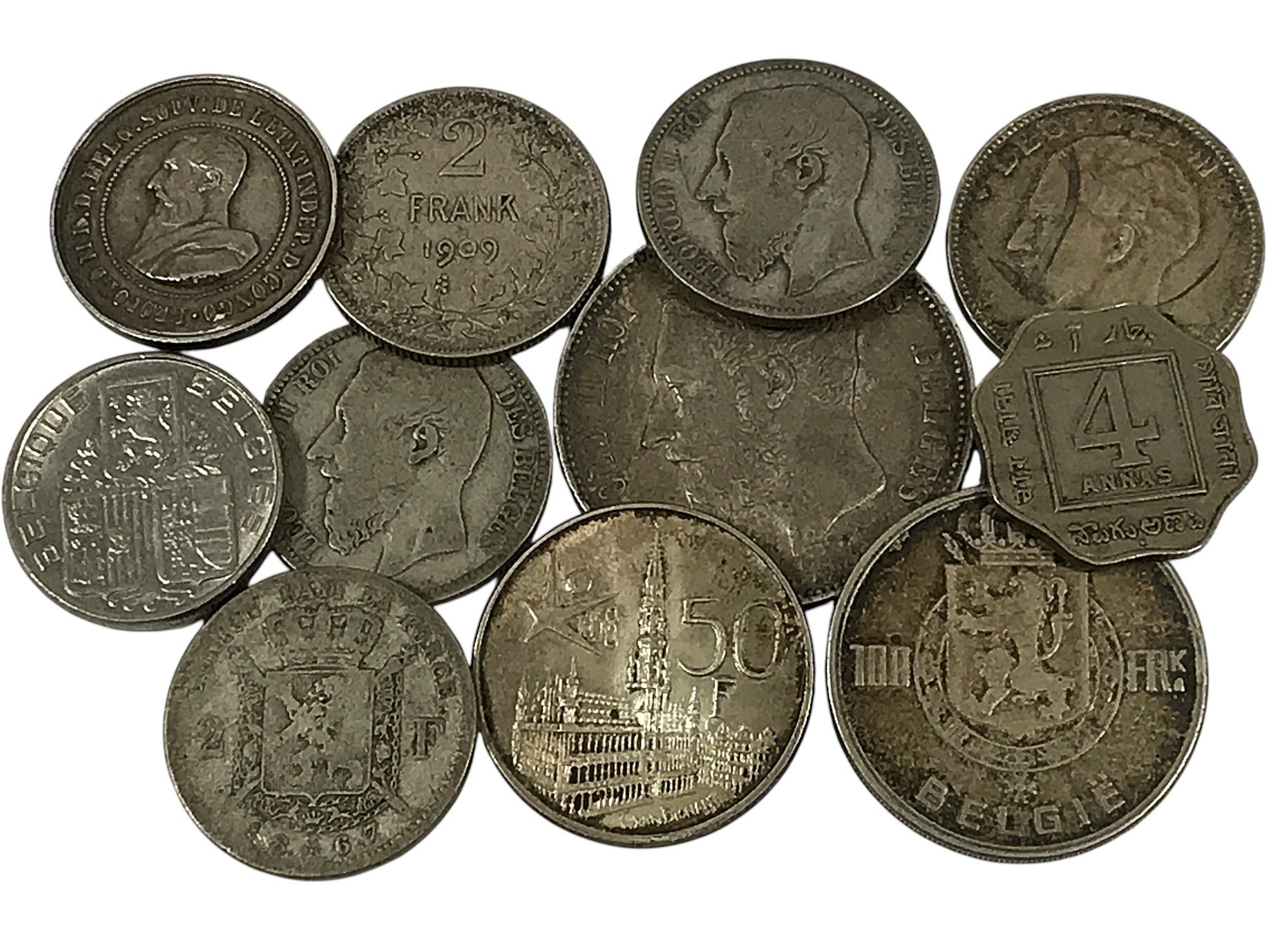 Ensemble de PIECES BELGES en argent comprenant : 2 FRANCS LEOPOLD II x 4 (1866, 1867 x 2 et 1909), 5 FRANCS LEOLPLD II 1873, 20 FRANCS LEOPOLD III 1935, 100 FRANCS 1949, 50 FRANCS 1958 et MEDAILLE SOCIETE ROYALE ET CENTRALE DES SAUVETEURS BELGES, poids : 113 grammes.