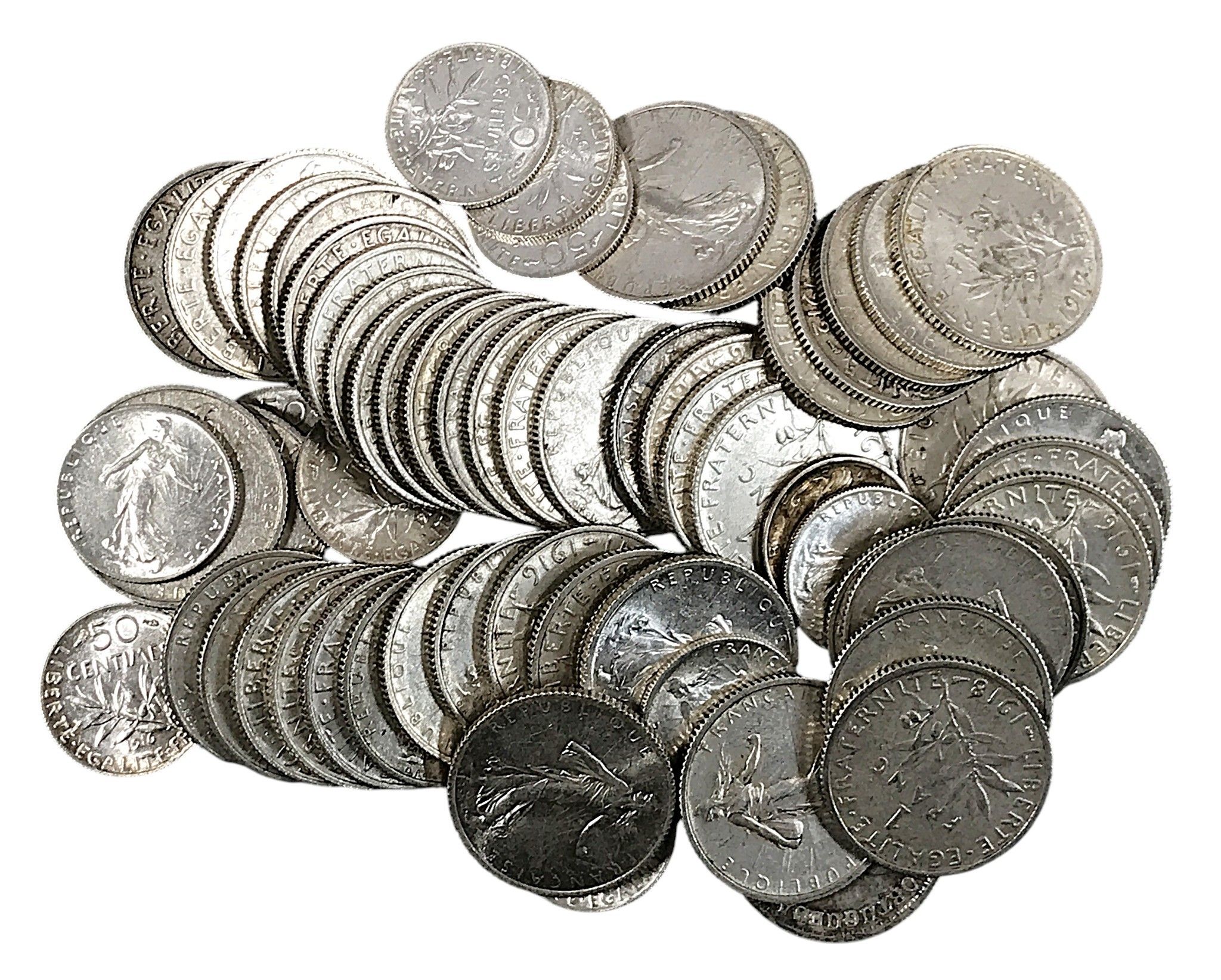 Ensemble de PIECES en argent comprenant : 1 FRANC SEMEUSE x 51 et 50 CENTIMES SEMEUSE x 12, années 1910 à 1920.