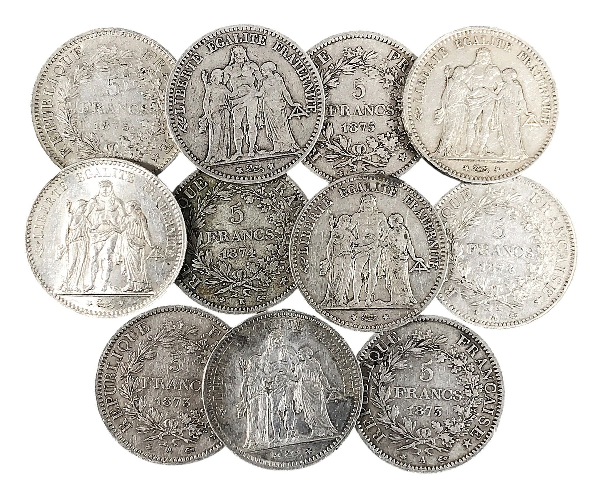 Ensemble comprenant 11 PIECES de 5 FRANCS HERCULE en argent, années 1873 x 4, 1874 x 4 et 1875 x 3.