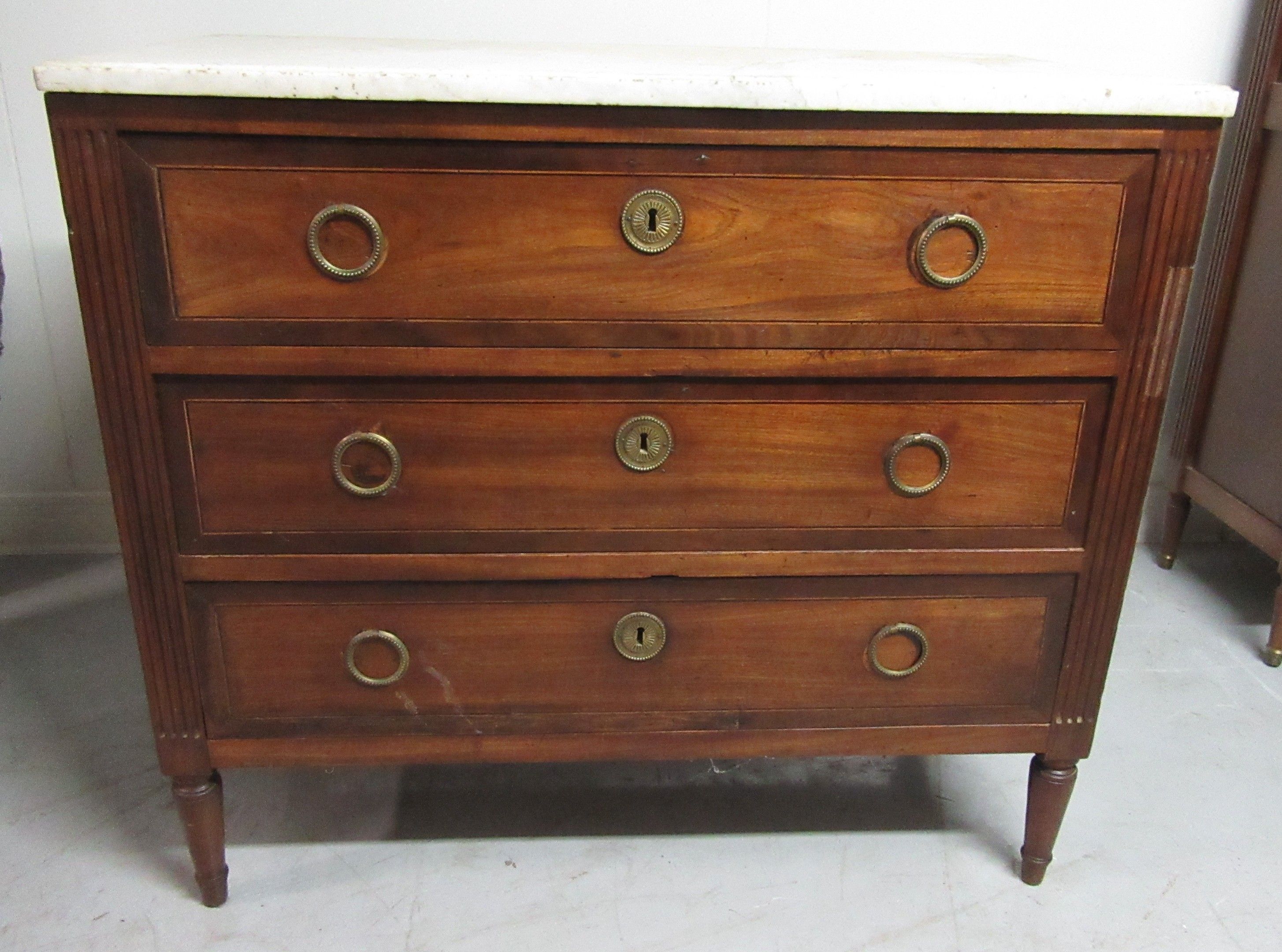 Commode à angles vifs, ouvrant par trois tiroirs. Plateau en marbre blanc. Début du XIXe siècle (accidents, piqûres). Hauteur : 87 cm - Largeur : 98 cm - Profondeur : 51 cm