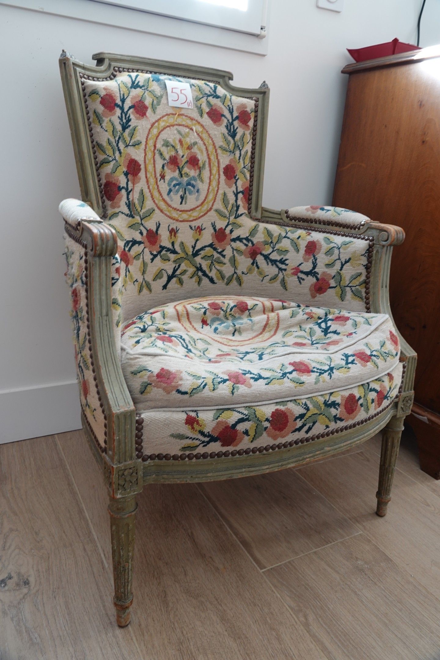 PAIRE DE FAUTEUILS en bois naturel laqué vert à dossier en anse de panier et reposant sur des pieds fuselés à rudentes. Garniture de petits points à décor floral et médaillons de bouquets de fleurs nouées.