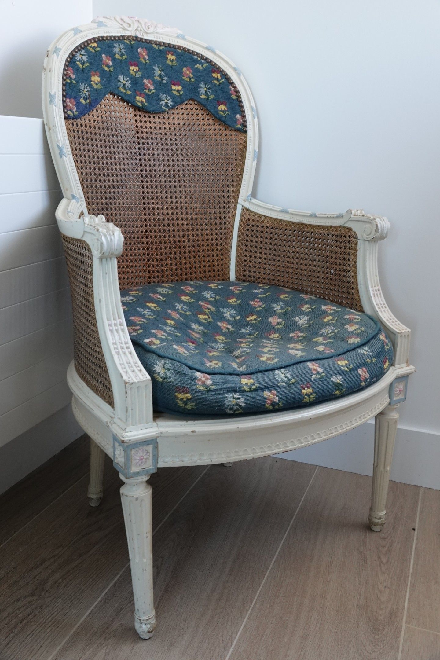 FAUTEUIL en bois naturel relaqué blanc canné orné d'un protection brodé à décor de fleurettes.