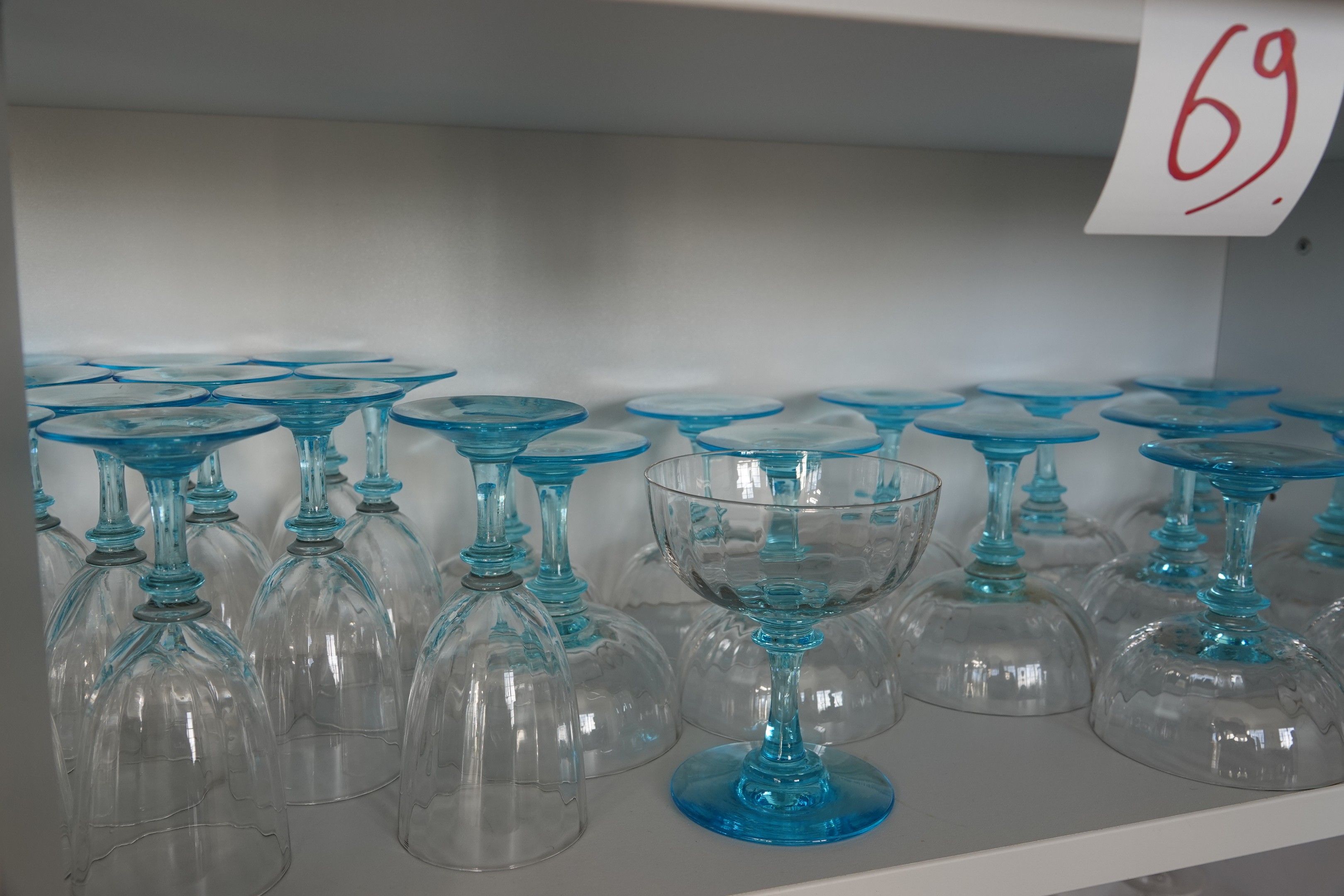 LOT DE VERRERIE de verres en verre sur pied teinté bleu.