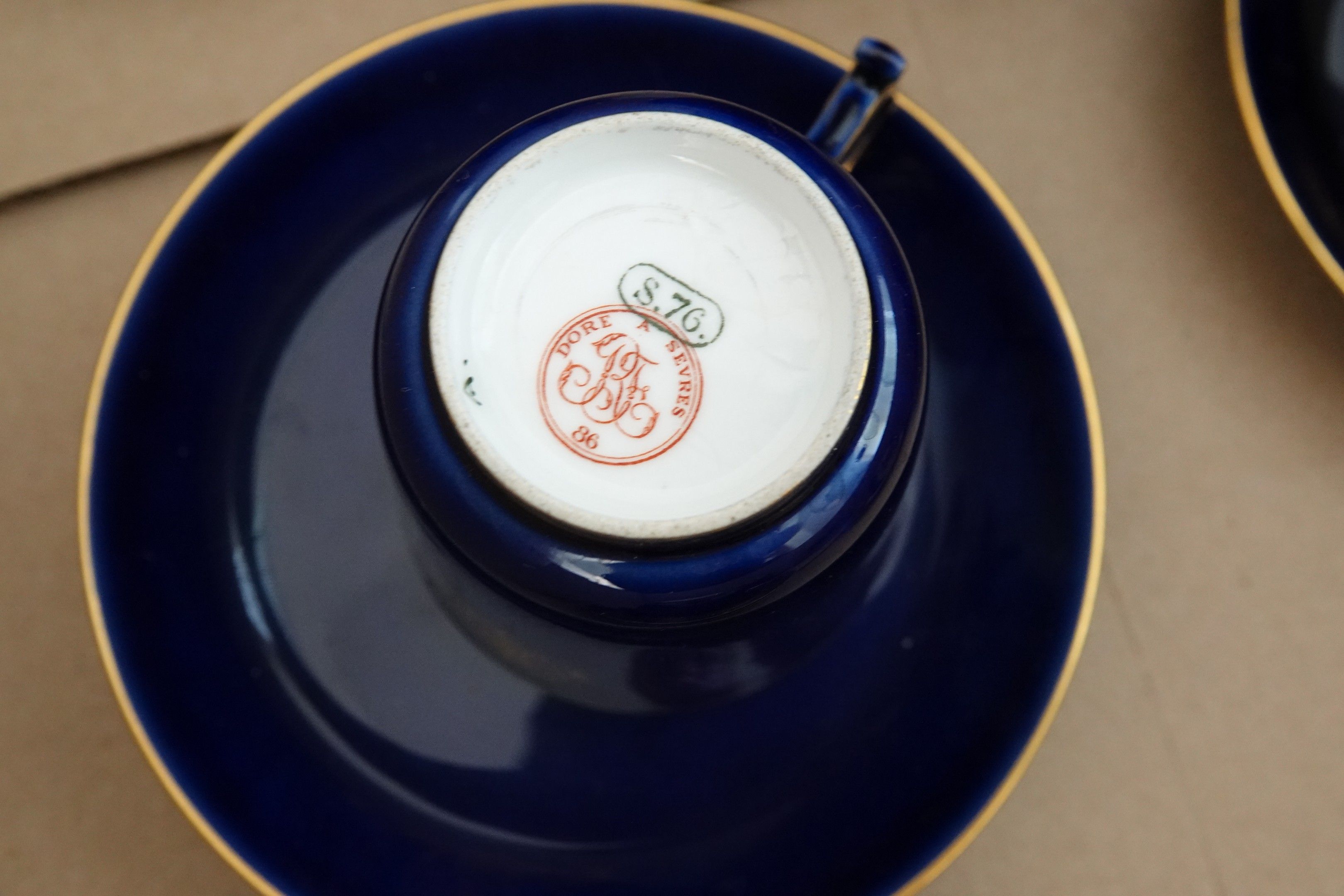 PARTIE DE SERVICE en porcelaine de Sèvres à décor doré sur fond bleu nuit.